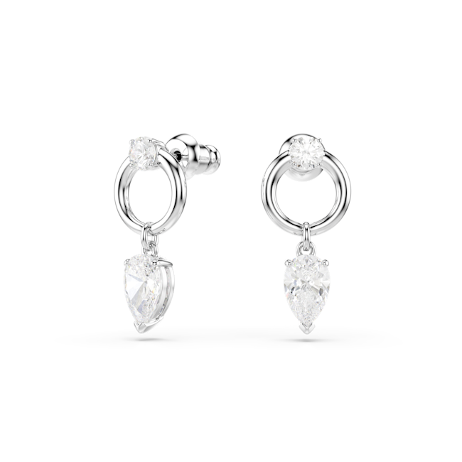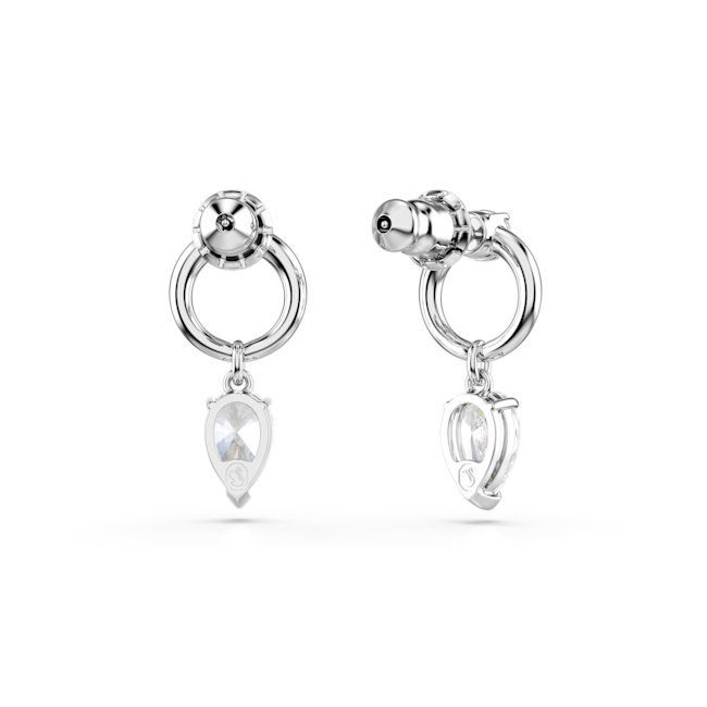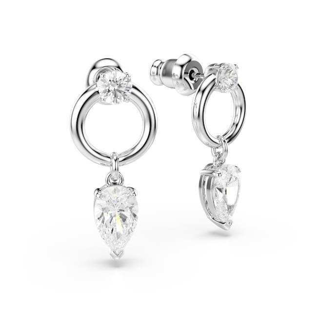 The Swarovski Mesmera Drop Earrings in Mixed Cuts are elegantly designed to catch the light from every angle, creating a dazzling effect. Each earring features a stunning pear-cut Swarovski Zirconia that gracefully dangles from a luxurious white rhodium-plated hoop, adding a touch of sophistication and shine. At the center of each earring, an additional round-cut Swarovski Zirconia enhances the overall sparkle, making these earrings a perfect statement piece for any occasion. The combination of mixed cuts and high-quality materials ensures that the Mesmera Drop Earrings offer both timeless beauty and modern elegance.