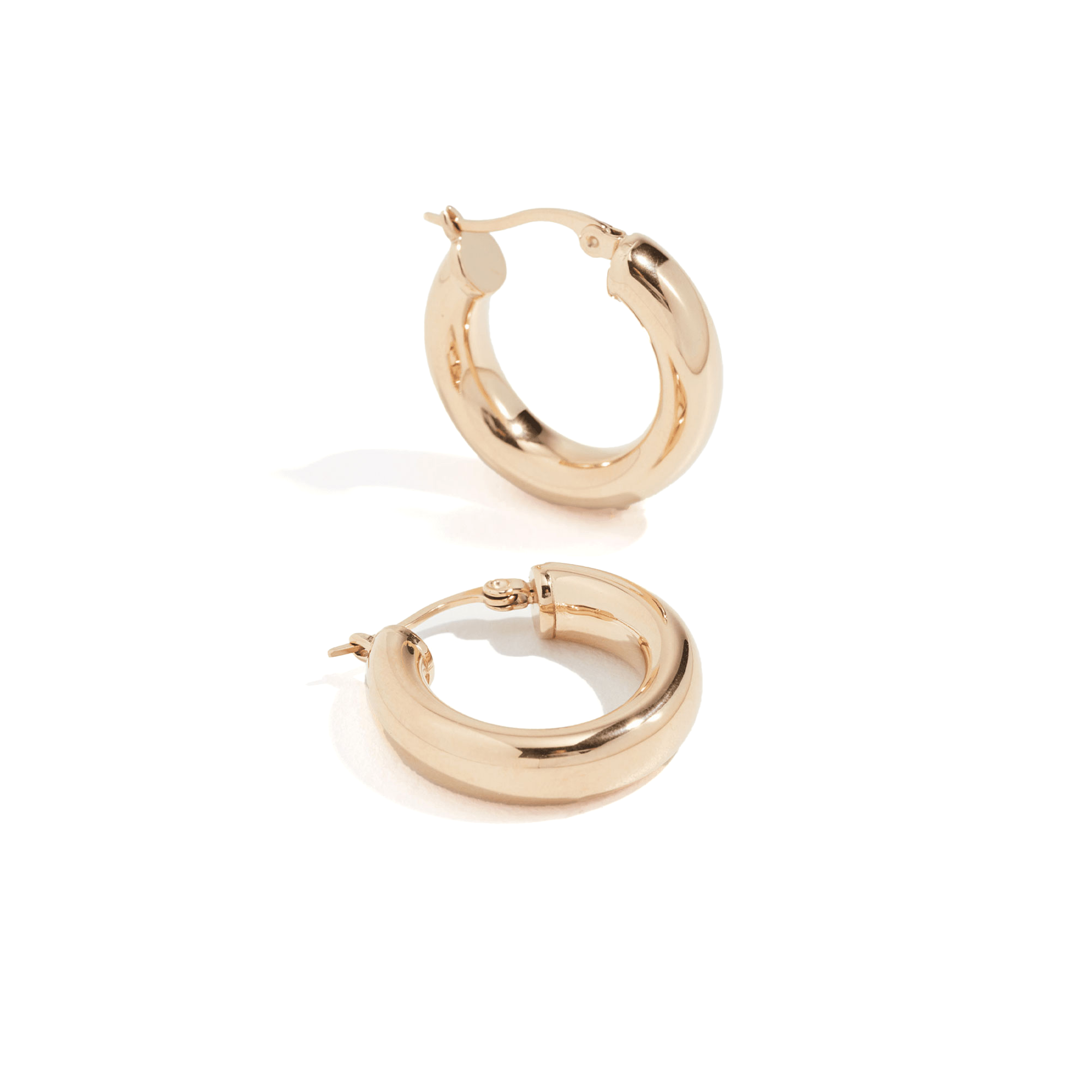 Timeless elegance with modern shine. The Shashi Dominique Gold Hoop Earrings are a must-have for any jewelry lover. Crafted with a smooth polished finish and a bold rounded shape, these hoops effortlessly elevate your look from day to night with understated glamour.