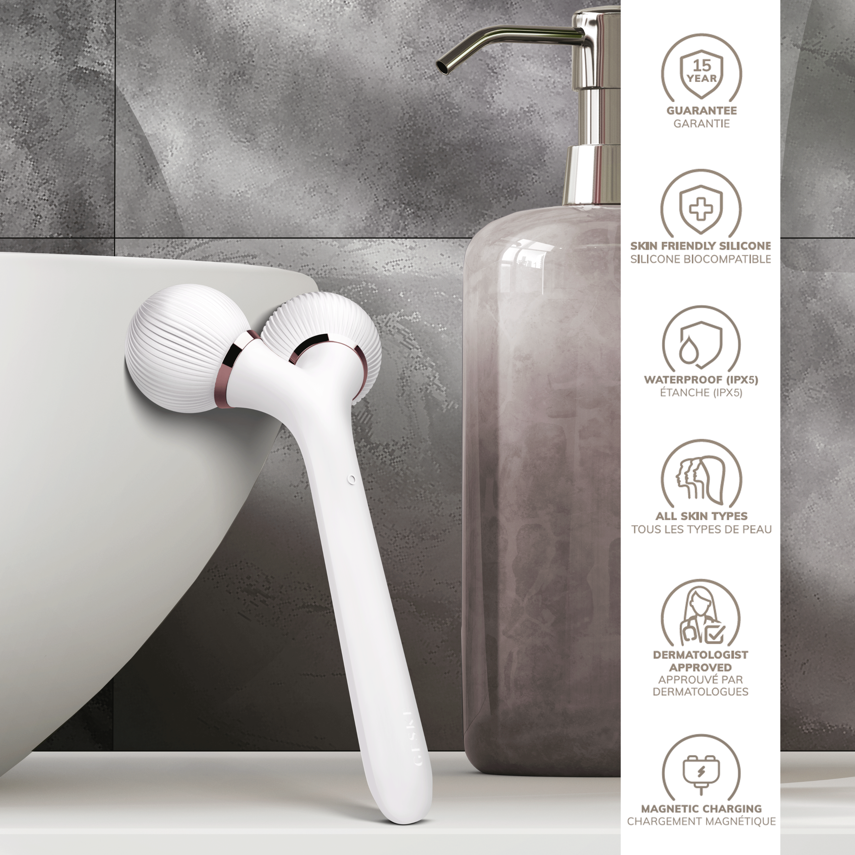 Ideal for a relaxing massage, skin stimulation and a firming effect, the Sonic Facial & Body Roller | 4 in 1 focuses on the following aspects of the skin: