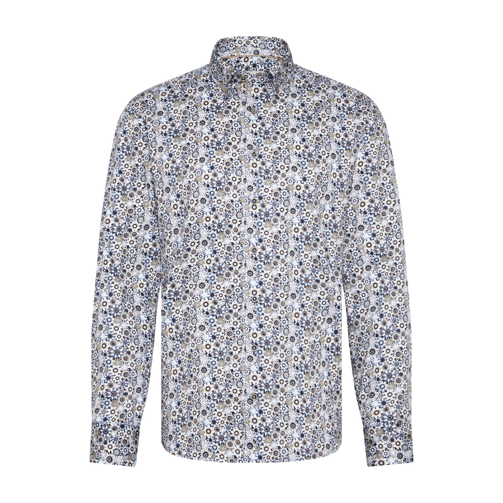 The Bugatti Men's Blue Grey Casual Shirt is a stylish and sophisticated addition to any man's wardrobe. Made from twill fabric, this shirt features a unique and eye-catching floral print in shades of blue and grey. One of the standout features of this shirt is the beige piping and ribbon details on the inside of the collar base and placket, adding a touch of elegance and contrast to the overall design. The shirt also features the iconic Bugatti flag label at the side seam, further adding to its premium appeal. With long sleeves and a collar neck, this shirt is perfect for both casual and semi-formal occasions. It can be easily styled with a pair of jeans or dressed up with chinos for a more polished look. The overall fit and quality of the shirt make it not only stylish but also comfortable to wear. The Bugatti Men's Blue Grey Casual shirt is a must-have for any fashion-conscious man looking to elevate his wardrobe with a versatile and high-quality piece. Whether for a casual outing or a special occasion, this shirt is sure to make a statement and exude sophistication.