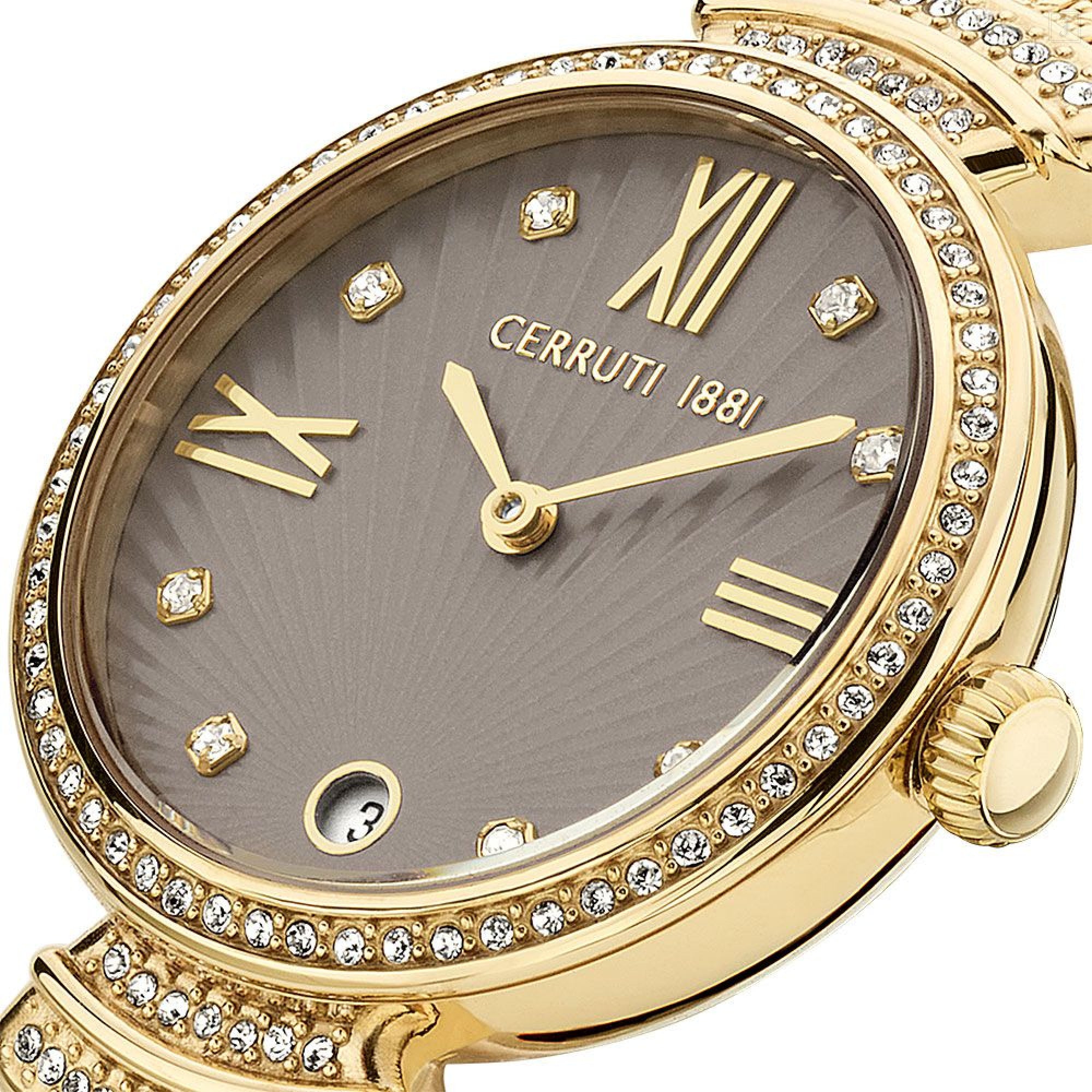 Elevate your evening look with Cerruti 1881?s Cerrisi watch. The mink sunray dial highlighting the stone-encrusted bezel and polished gold-toned mesh band adds a feminine touch to your timepiece.