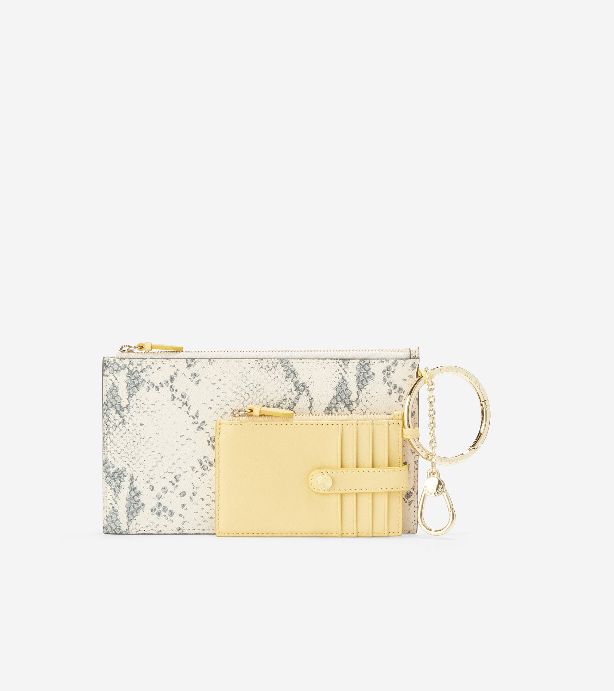 - Smaller card case has multiple credit card slots and a zip-top closure.