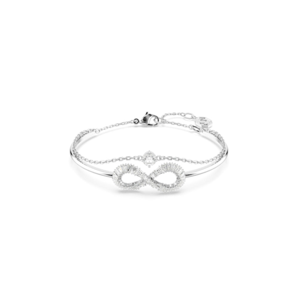 | Swarovski Hyperbola Bangle Infinity, White, Rhodium-plated, Medium This Hyperbola bracelet is infused with subtle beauty and symbolism and can be worn multiple times. The rhodium-plated design includes a stiff band with an infinity pattern accented with clear Swarovski Zirconia. A second chain has also been added, featuring a single round Swarovski Zirconia in the center. A gorgeous double-wrapped bangle that transitions seamlessly from day to night. SPECIFICATIONS