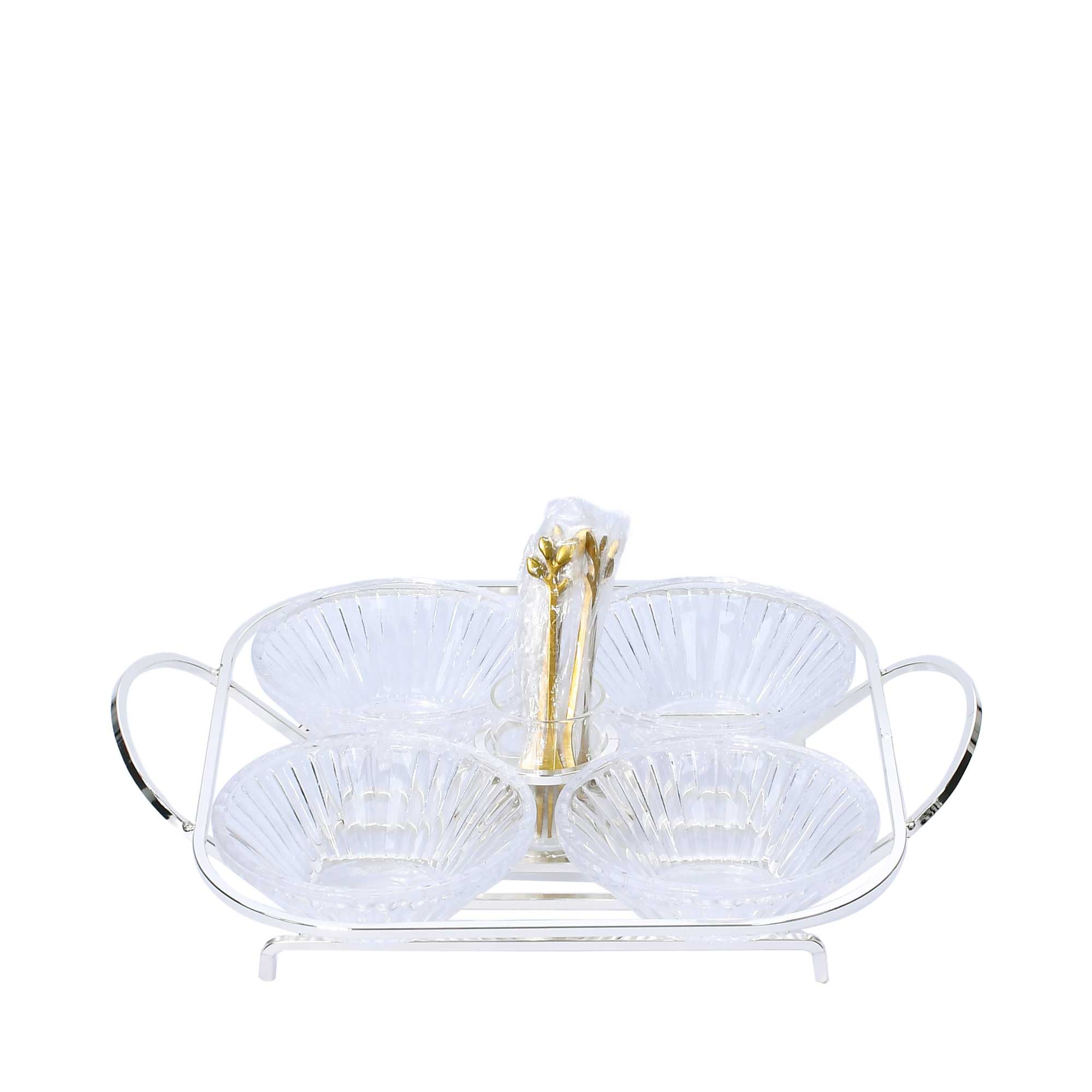 Serve your dips, condiments, appetizers, or snacks in style with this sophisticated four-compartment serving set. Featuring four beautifully clear, ridged glass bowls arranged in a square, this set also includes a central cylindrical holder designed to neatly accommodate the accompanying serving utensils (likely small spoons or forks). The entire set is supported by an elegant metal frame with curved handles for easy carrying.