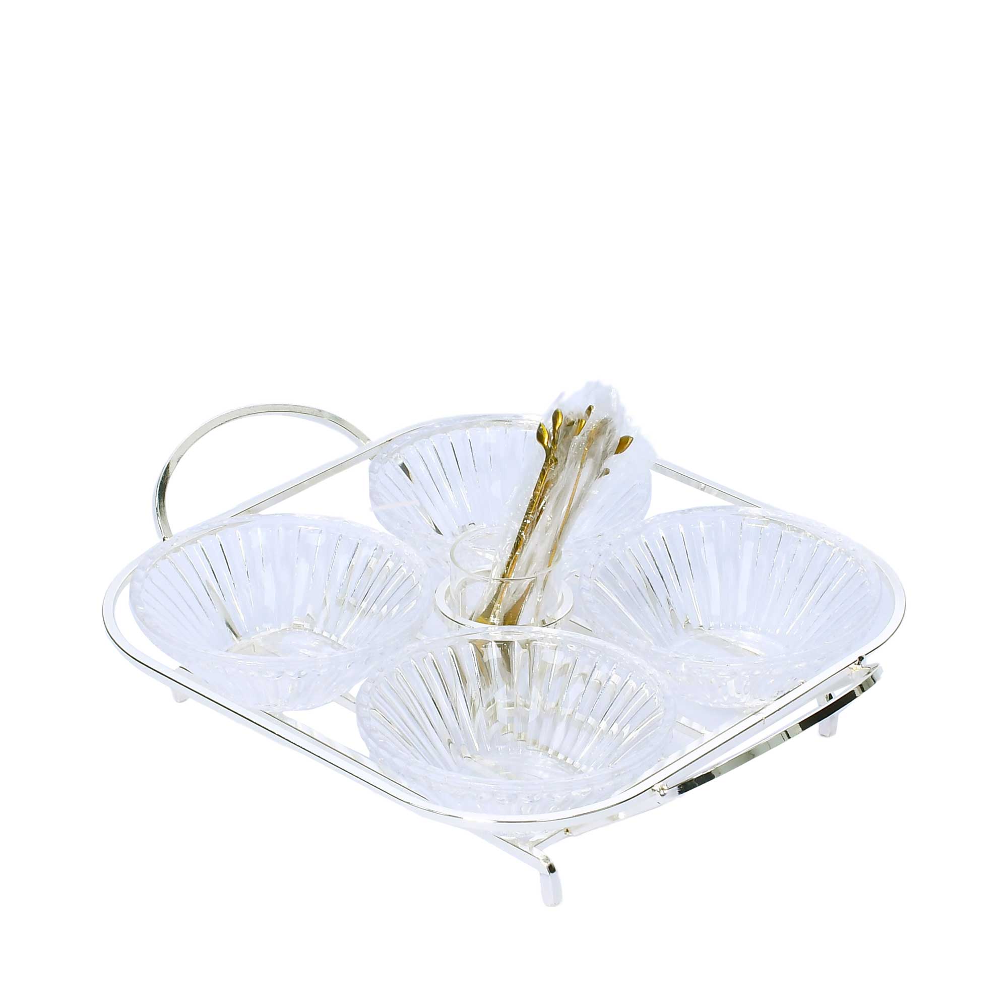 • Design: Square serving set with four individual glass bowls, a central utensil holder, and a metal frame with curved carrying handles.