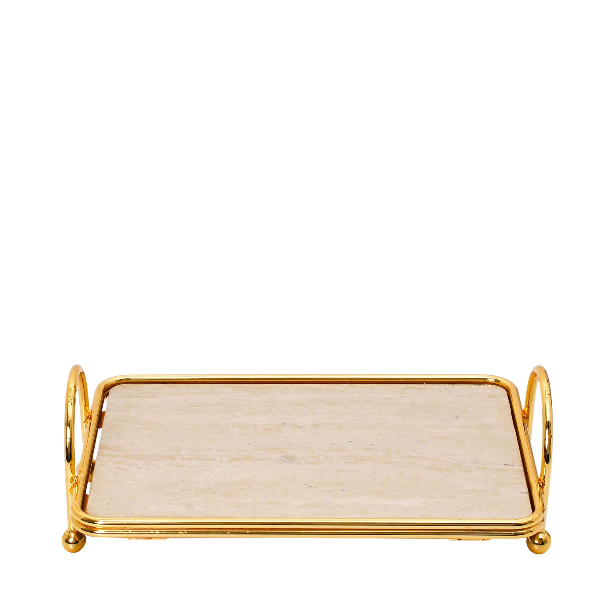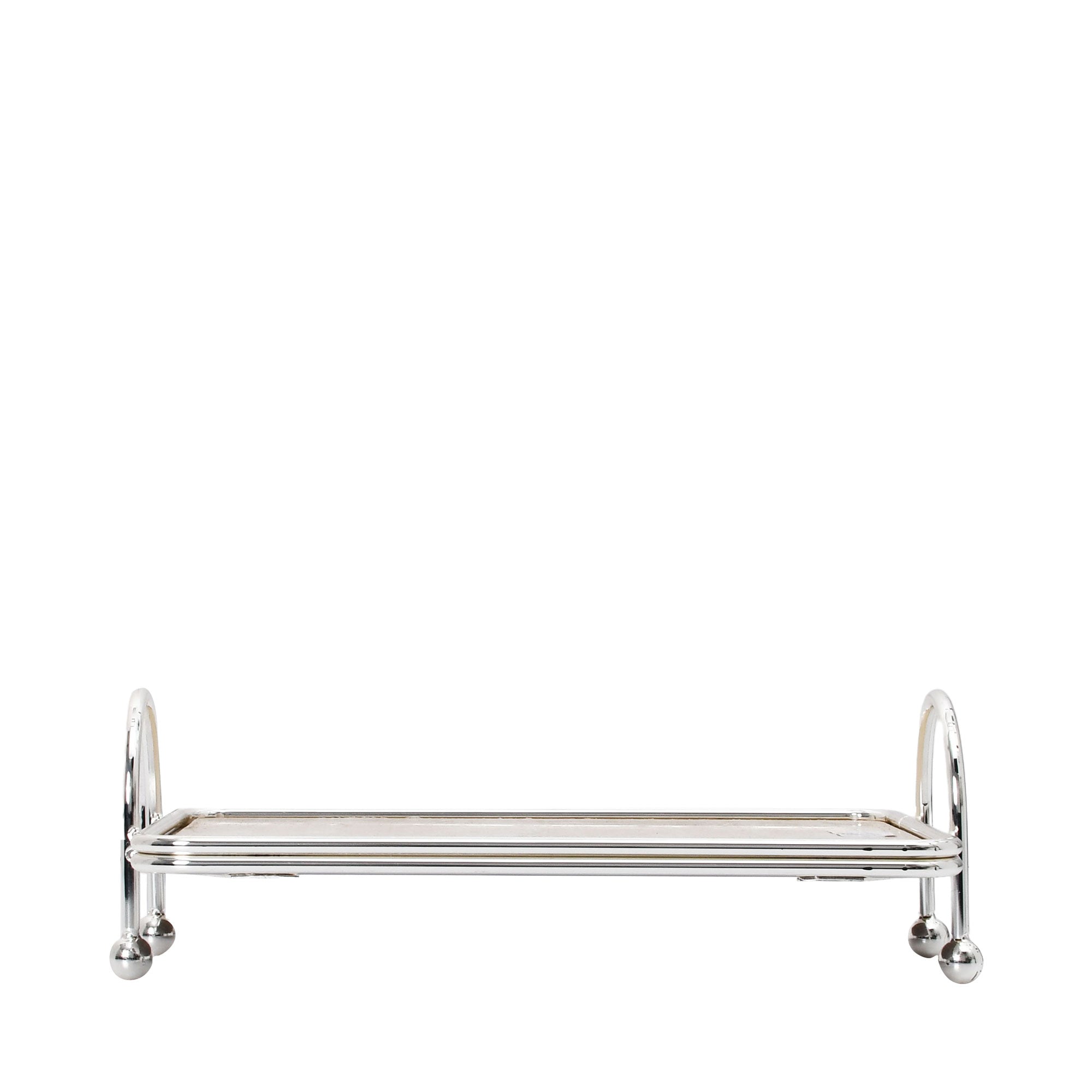The Ele 4PM Polished Rectangular Cake Stand with Handles is a sophisticated and versatile piece that combines classic style with modern materials. It features a rectangular tray with a light-colored, marble-like surface that provides an elegant backdrop for cakes, pastries, or decorative items. The base is framed by a sleek silver-toned metal border, which seamlessly extends into two elevated, arched handles on either side, allowing for easy and secure carrying. The tray is supported by four small, rounded feet that protect your surfaces while adding a subtle lift. Ideal for serving guests or showcasing decorative accents on a coffee table or sideboard, this cake stand offers both functionality and timeless appeal.
