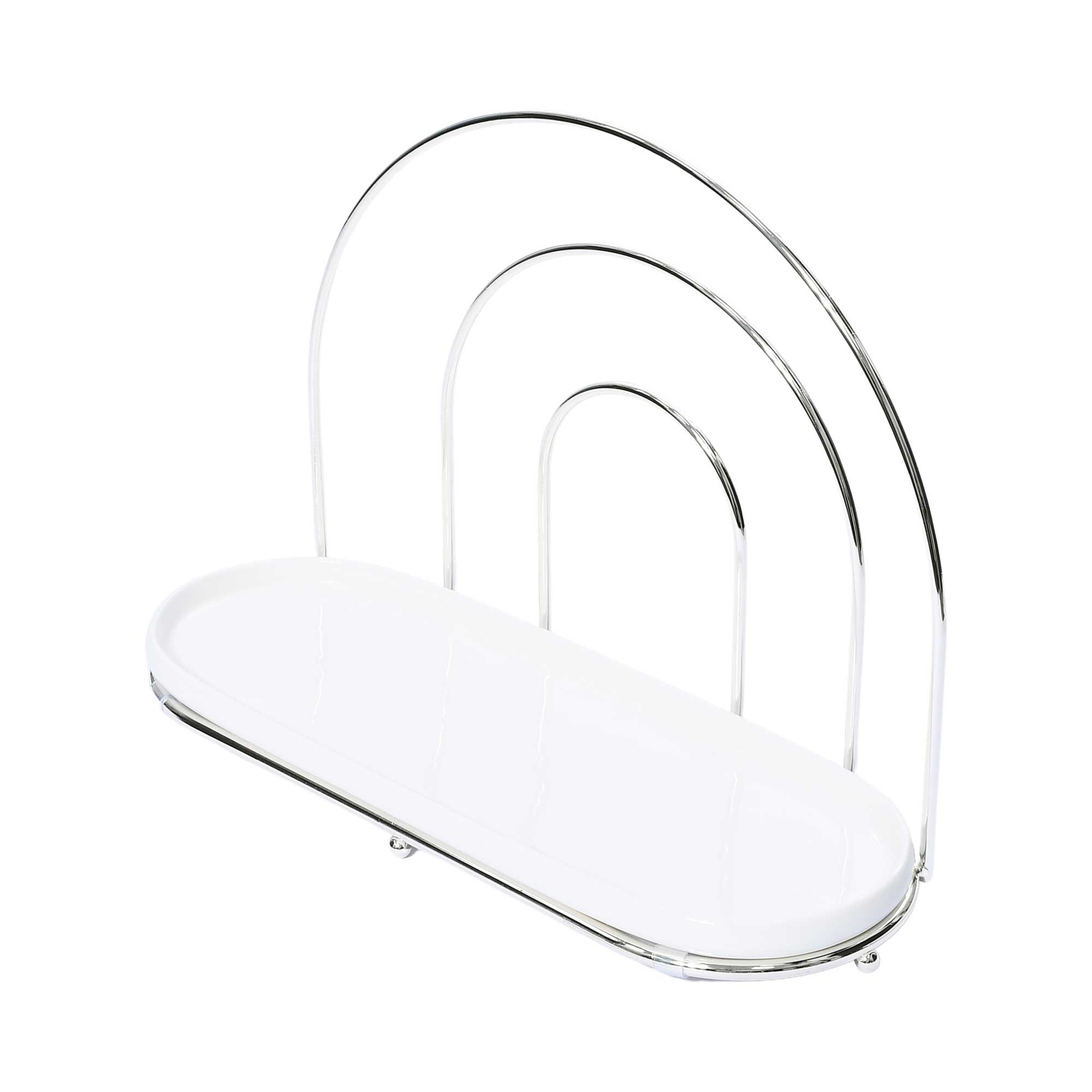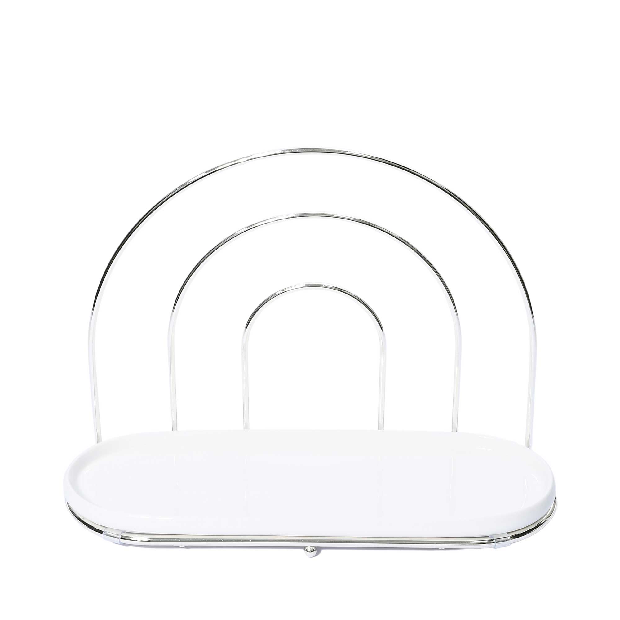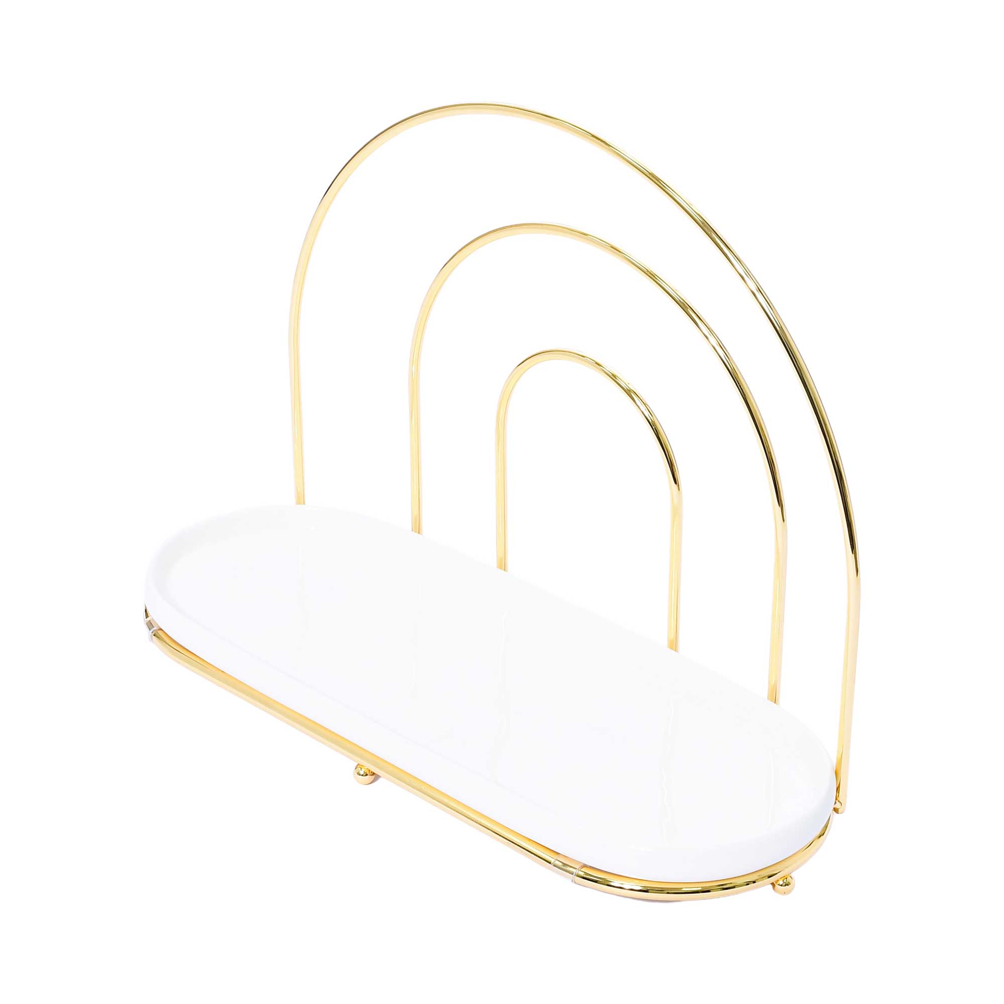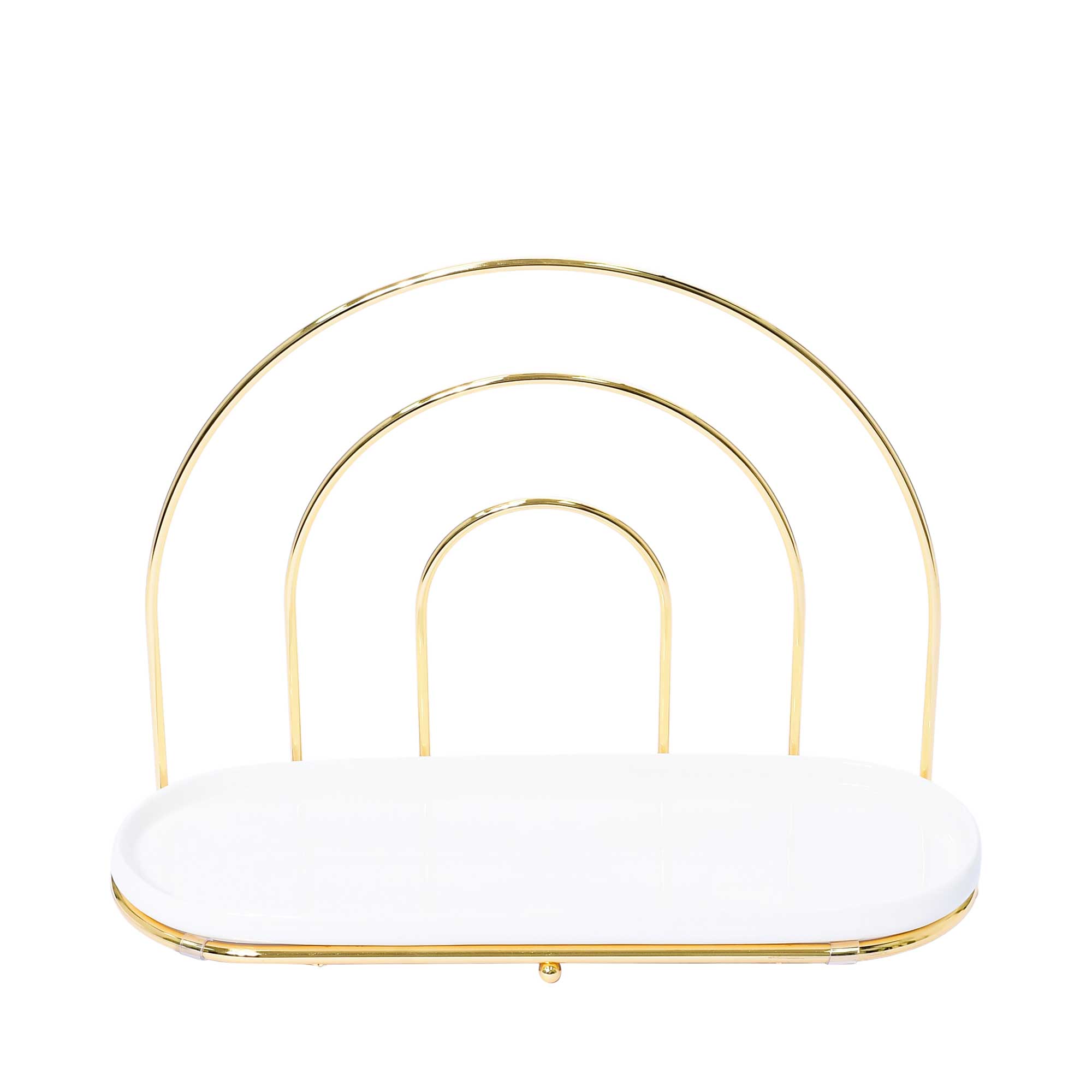 The stand features a rectangular white tray with a glossy finish. The tray is supported and framed by a polished gold-toned metal base with an intricate, arched wire design resembling a rainbow. The tiered arches add a visually appealing and modern element to the piece.