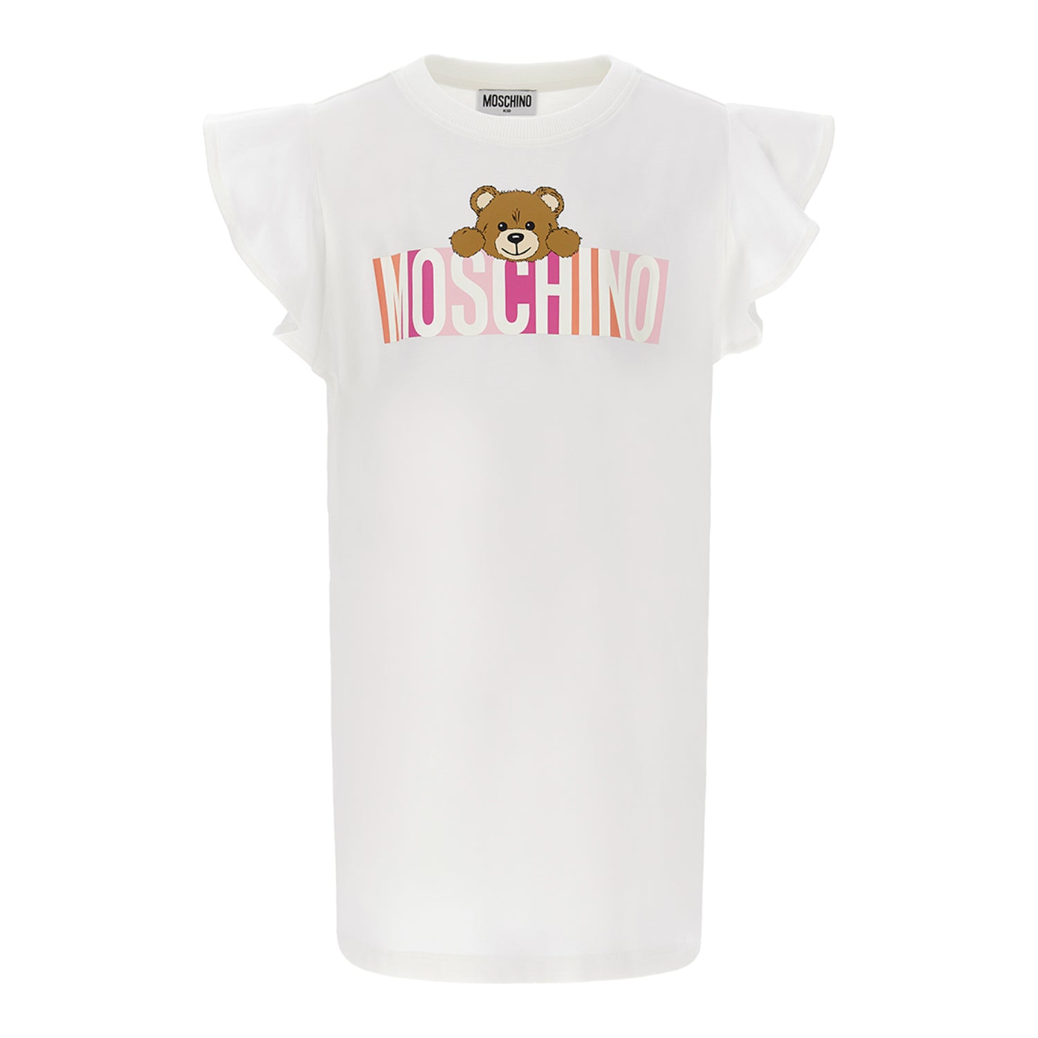 The Moschino Kids Girl's Cloud Dress is a stylish and comfortable T-shirt dress crafted from soft and stretchy cotton jersey, perfect for everyday wear. This designer piece features loosely ruffled sleeves that add a playful and feminine touch, complemented by a ribbed crew neck for a classic finish. The dress is adorned with a vibrant multicoloured logo design, prominently showcasing the iconic Moschino Teddy Bear, making it a fun and recognizable statement piece for young fashion enthusiasts. Combining quality materials with trendy details, this dress offers both comfort and a distinctive Moschino flair.