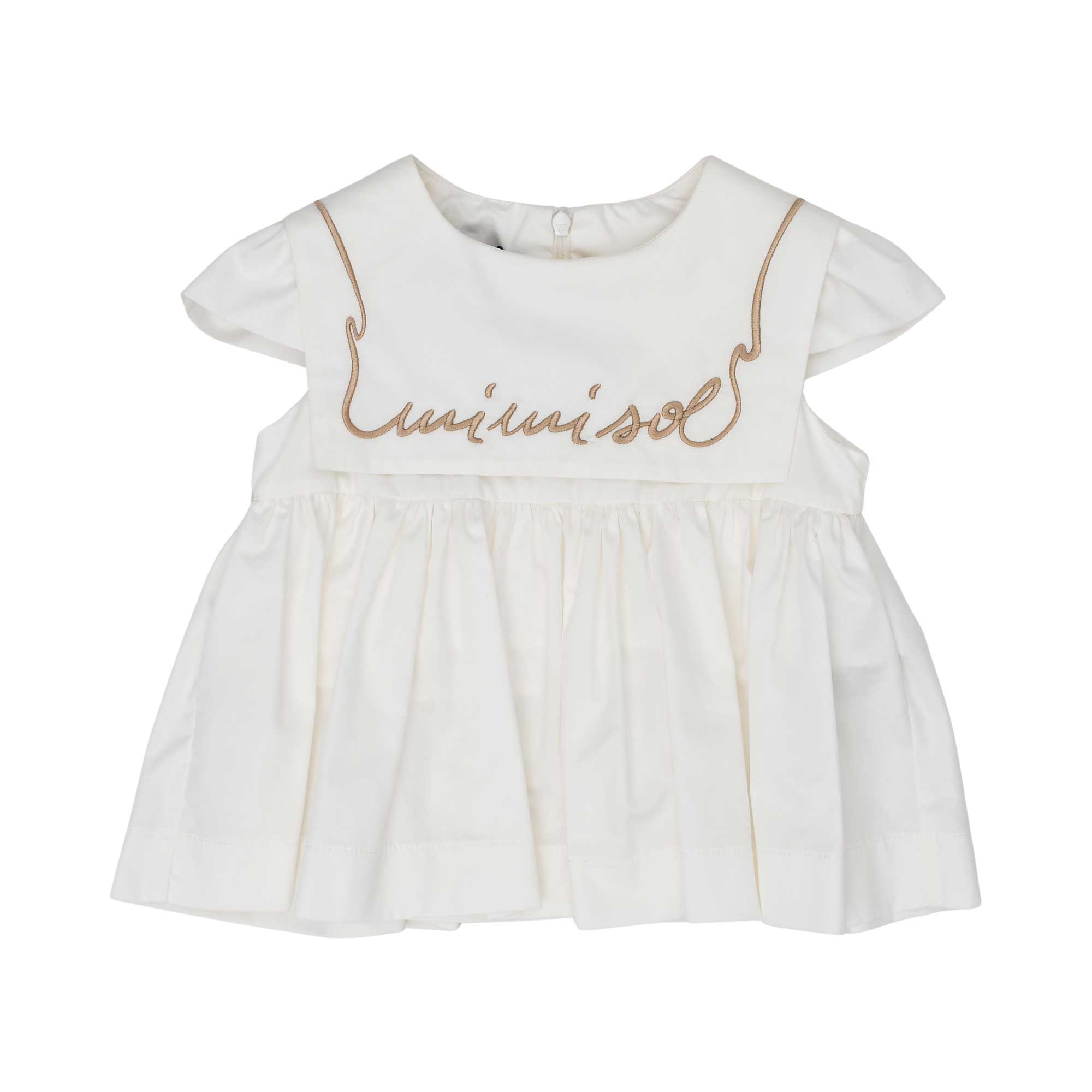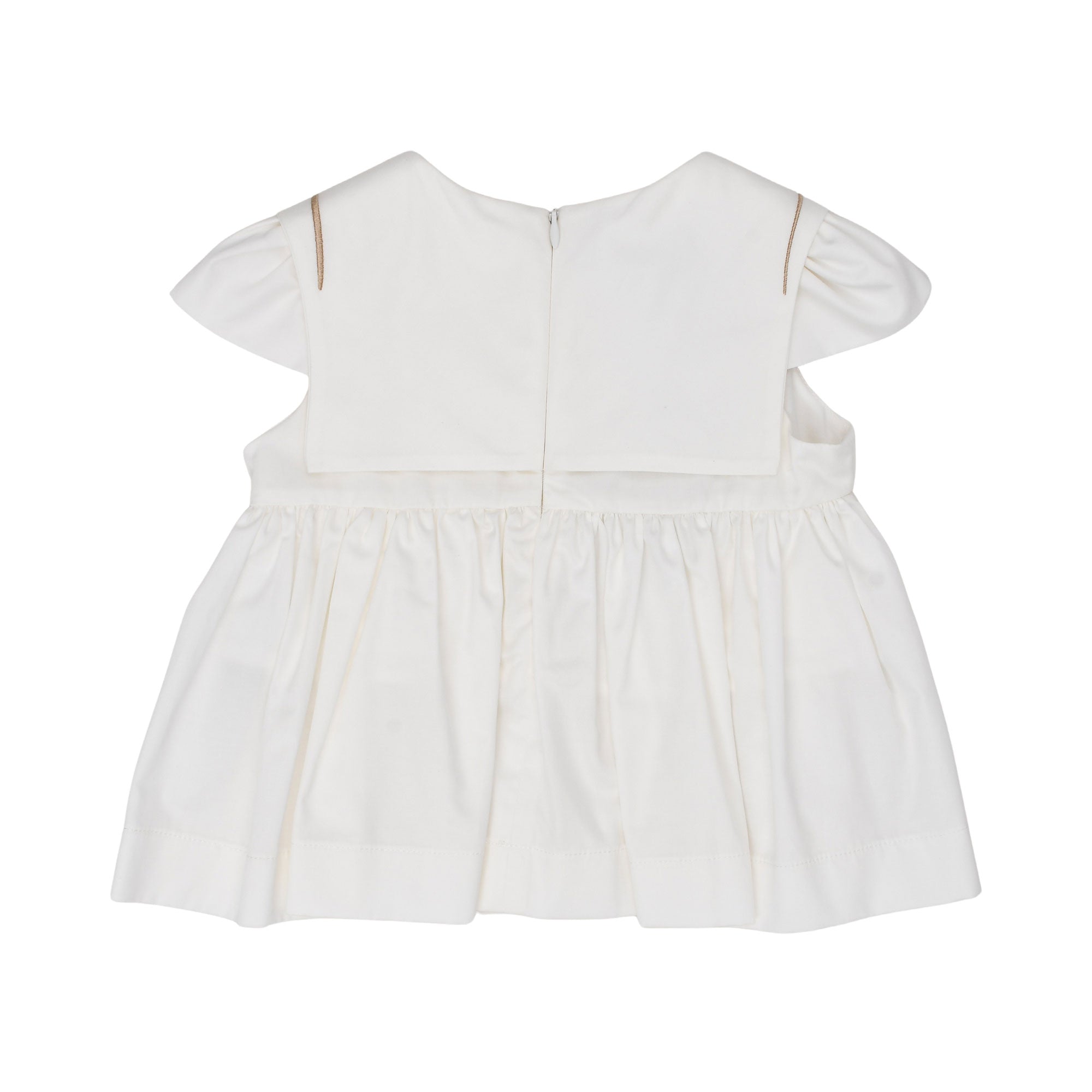 • Large sailor collar with embroidered logo for a charming, classic touch