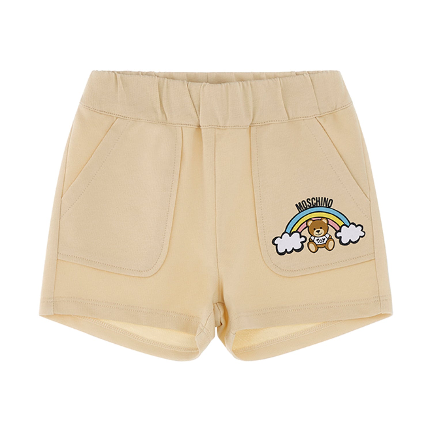 • Beige shorts adorned with iconic Moschino teddy bear print enhanced by a colorful rainbow