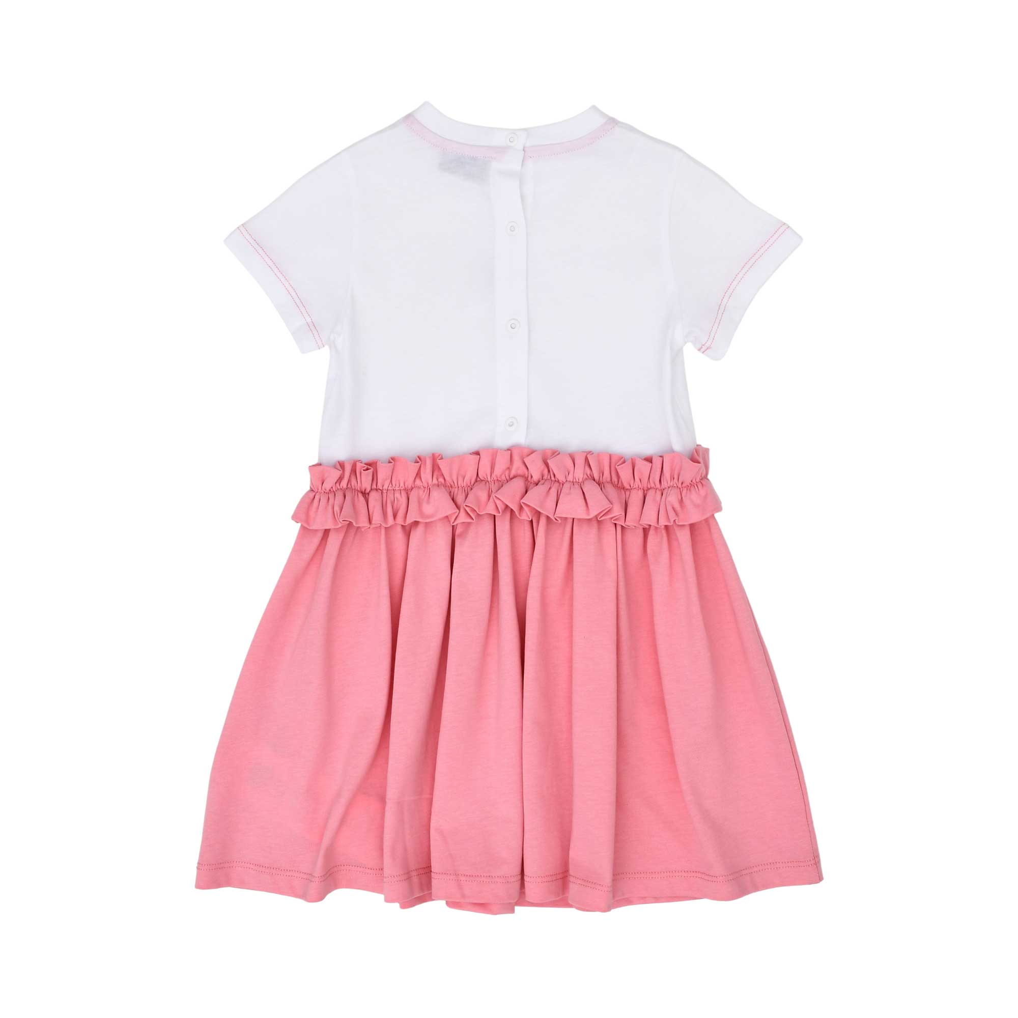 The Missoni Kids Baby Girl’s White and Pink Dress is a charming and playful piece designed with both comfort and style in mind. The dress features a short-sleeve white T-shirt bodice, beautifully accented by the iconic "MISSONI" logo printed across the chest in a colorful, patterned font that adds a touch of fun and brand recognition. Attached to the bodice, the skirt stands out in a vibrant pink hue, crafted with a gathered and ruffled elasticated waistline that offers a gentle fit while creating a lovely, full silhouette. Designed for ease, the dress includes convenient snap buttons at the back of the neck, making dressing simple and fuss-free for parents and little ones alike. With a relaxed fit and a bright, joyful aesthetic, this dress is perfect for warm-weather outings or everyday play.