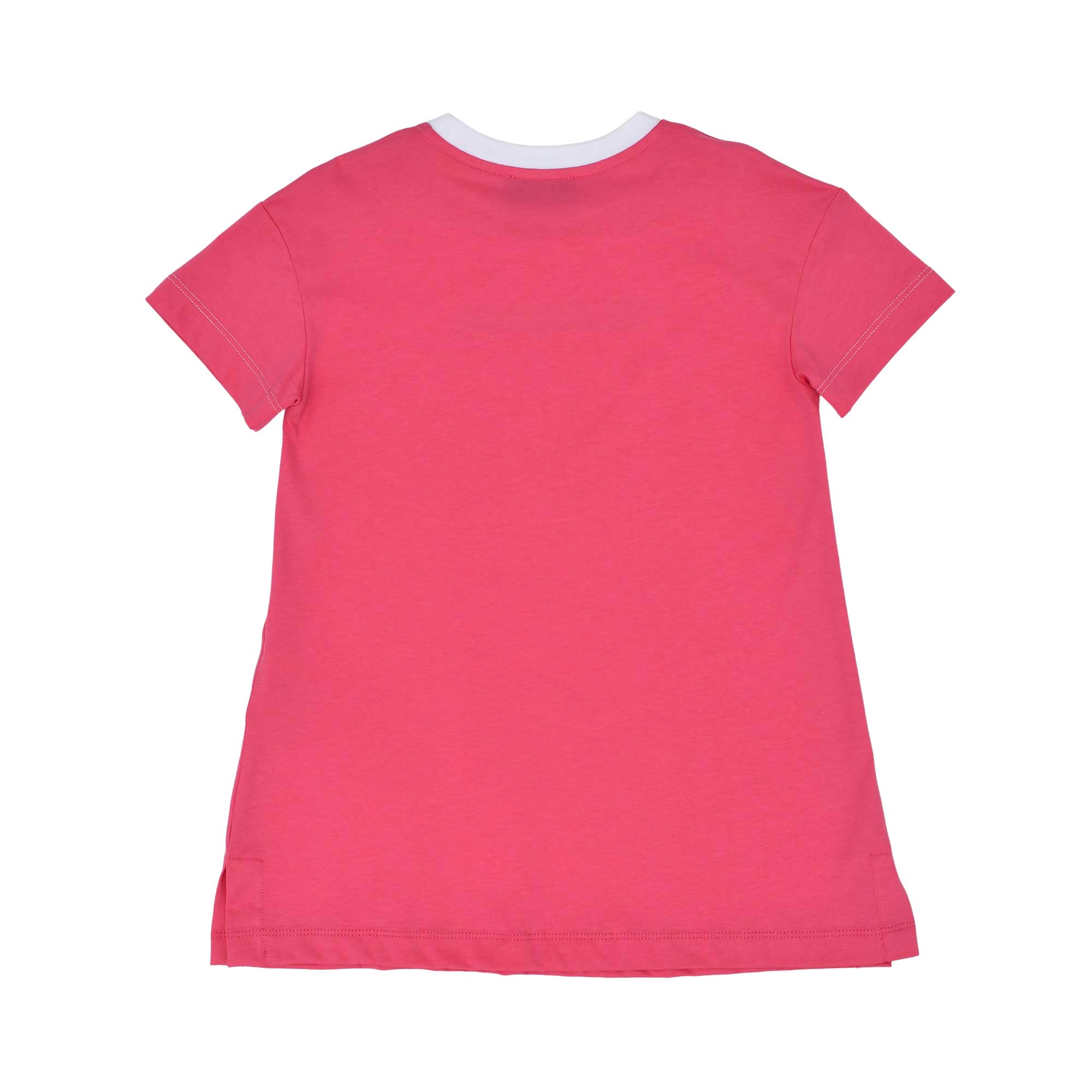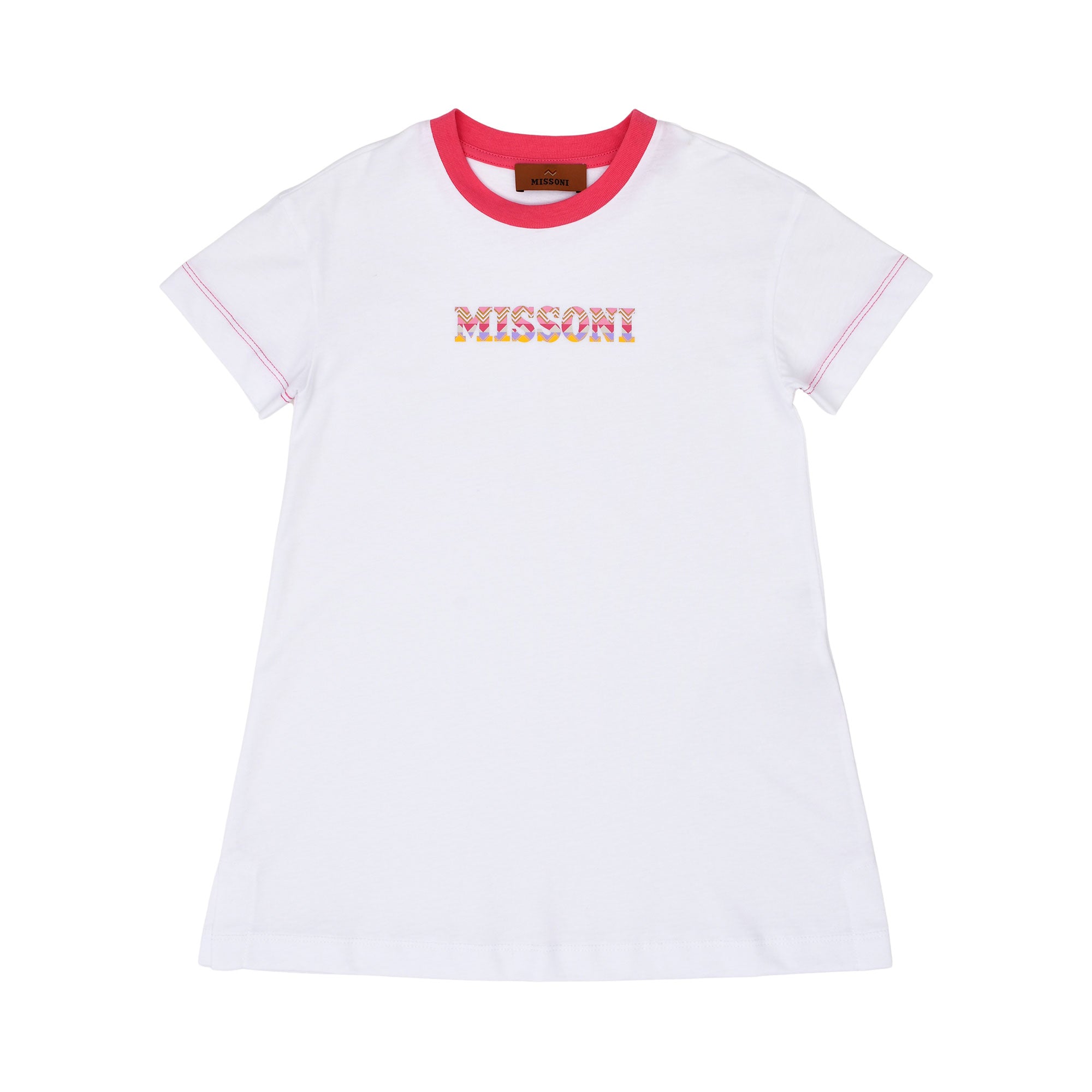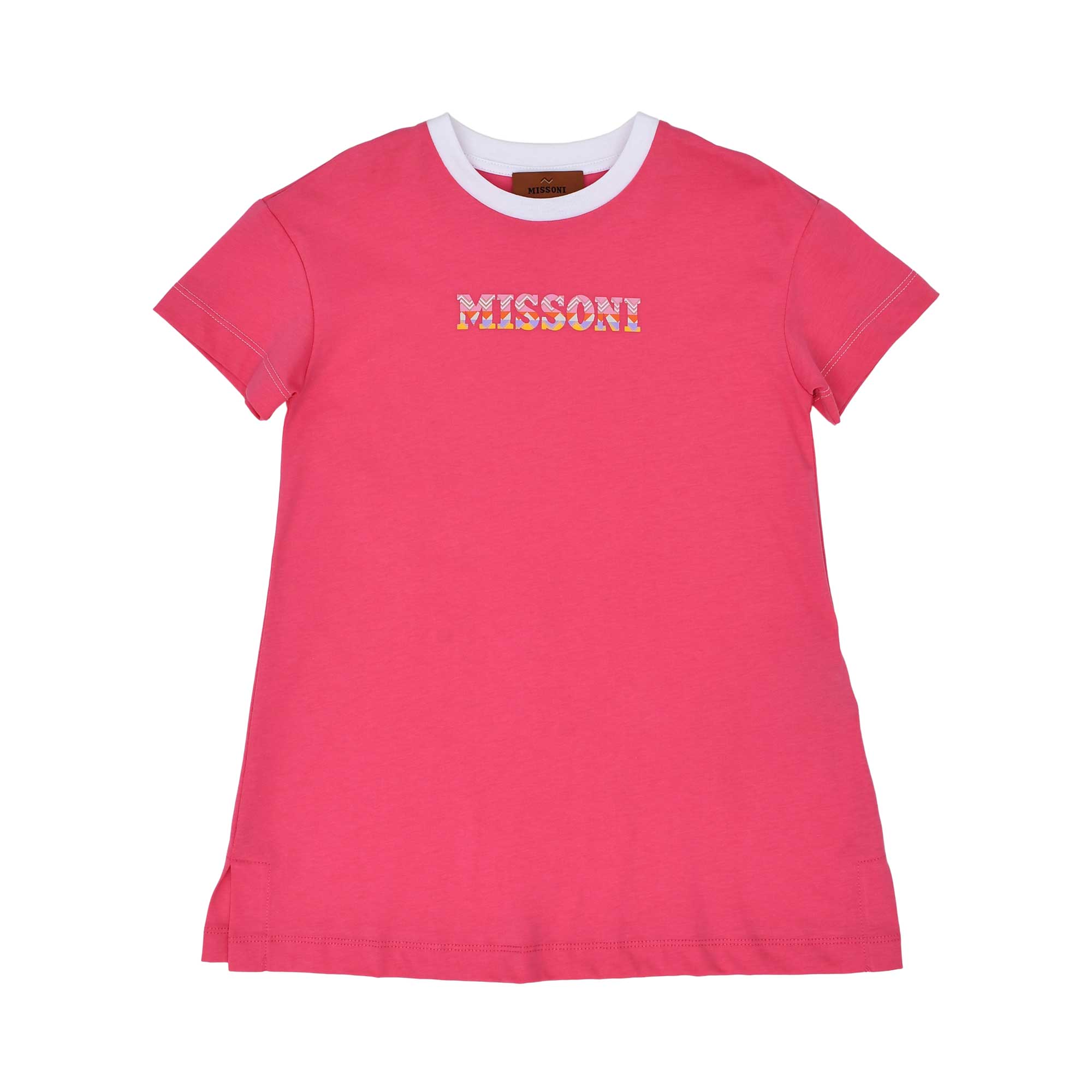 The Missoni Kids Baby Girl's T-Shirt Dress with Ringer Neckline is a charming and playful piece, perfect for little fashionistas. Designed with a classic round neckline, this dress features a bright pink ringer trim that adds a cheerful pop of color. Across the chest, the iconic "MISSONI" logo stands out, printed in a lively multicolored, patterned font that reflects the brand’s signature style. Delicate pink stitching along the sleeves and hem provides subtle yet thoughtful detail, enhancing the dress’s overall appeal. Made in a straight, relaxed A-line silhouette, this dress ensures both comfort and freedom of movement, making it an ideal choice for everyday wear as well as special occasions.