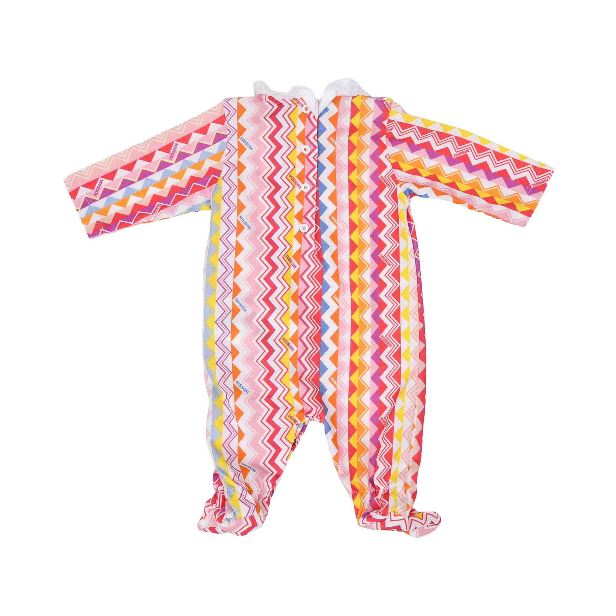The Missoni Kids Newborn Girl’s Multicolor Chevron Sleep Suit and Hat Set is a delightfully vibrant ensemble that captures the signature Missoni style. The full-length sleep suit is crafted with soft material, featuring long sleeves and closed feet to keep babies warm and cozy. Its design is elevated by a charming white ruffled collar and an extra ruffle accent that runs vertically down the front. The eye-catching chevron print showcases a lively palette of colors including pink, red, blue, yellow, and orange, making it as playful as it is chic. Completing the set, the coordinating knit beanie features a white folded cuff, perfectly matching the ruffled collar and adding a touch of classic elegance to the ensemble. This set is both stylish and comfortable, making it an ideal choice for a newborn girl.