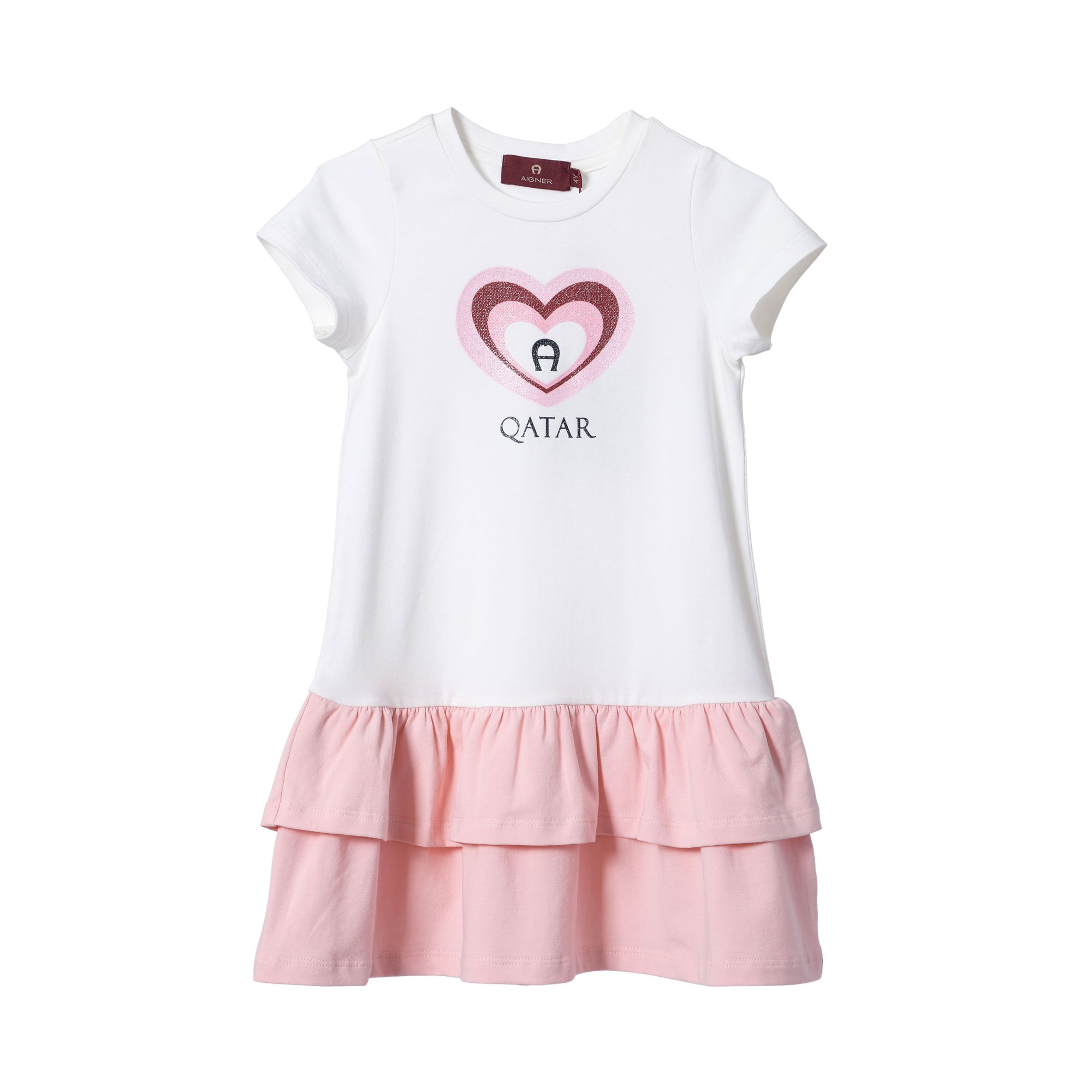 The Aigner Kids Girl's White & Pink Dress is a charming and stylish outfit for little girls. It features a round neck, short sleeves, and a pleated waist, giving it a cute and feminine look. The frill skirt adds a touch of playfulness to the dress, making it perfect for special occasions or even everyday wear. One unique element of this dress is the Qatar lettering and brand logo in shiny heart motive, which is placed prominently on the front of the dress. This detail adds a touch of elegance and sophistication to the overall design. Made with high-quality materials, this dress not only looks beautiful but also feels comfortable for your child to wear. Whether she's attending a party or simply playing with friends, the Aigner Kids Girl's White & Pink Dress is a lovely choice that will surely make her feel special. SPECIFICATIONS