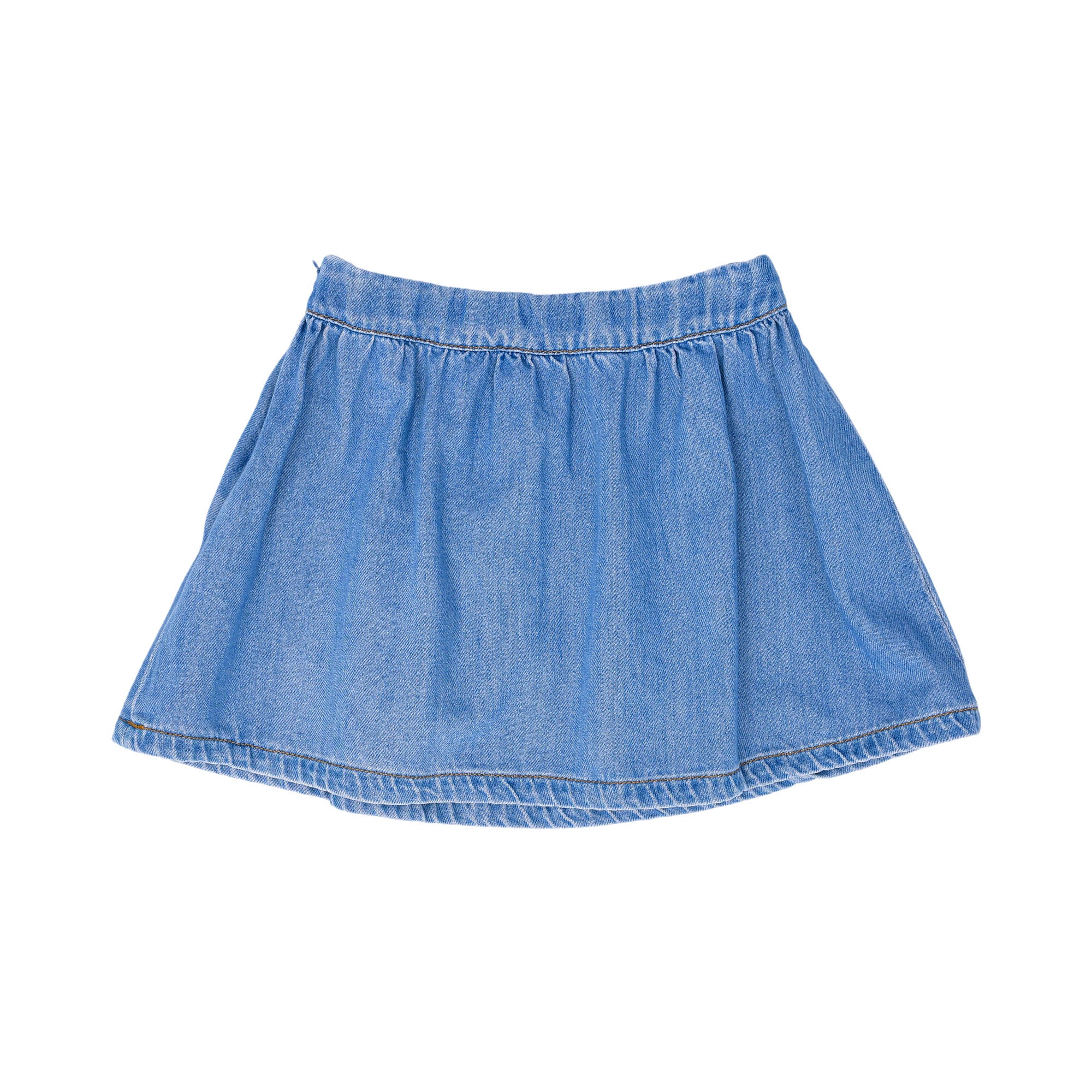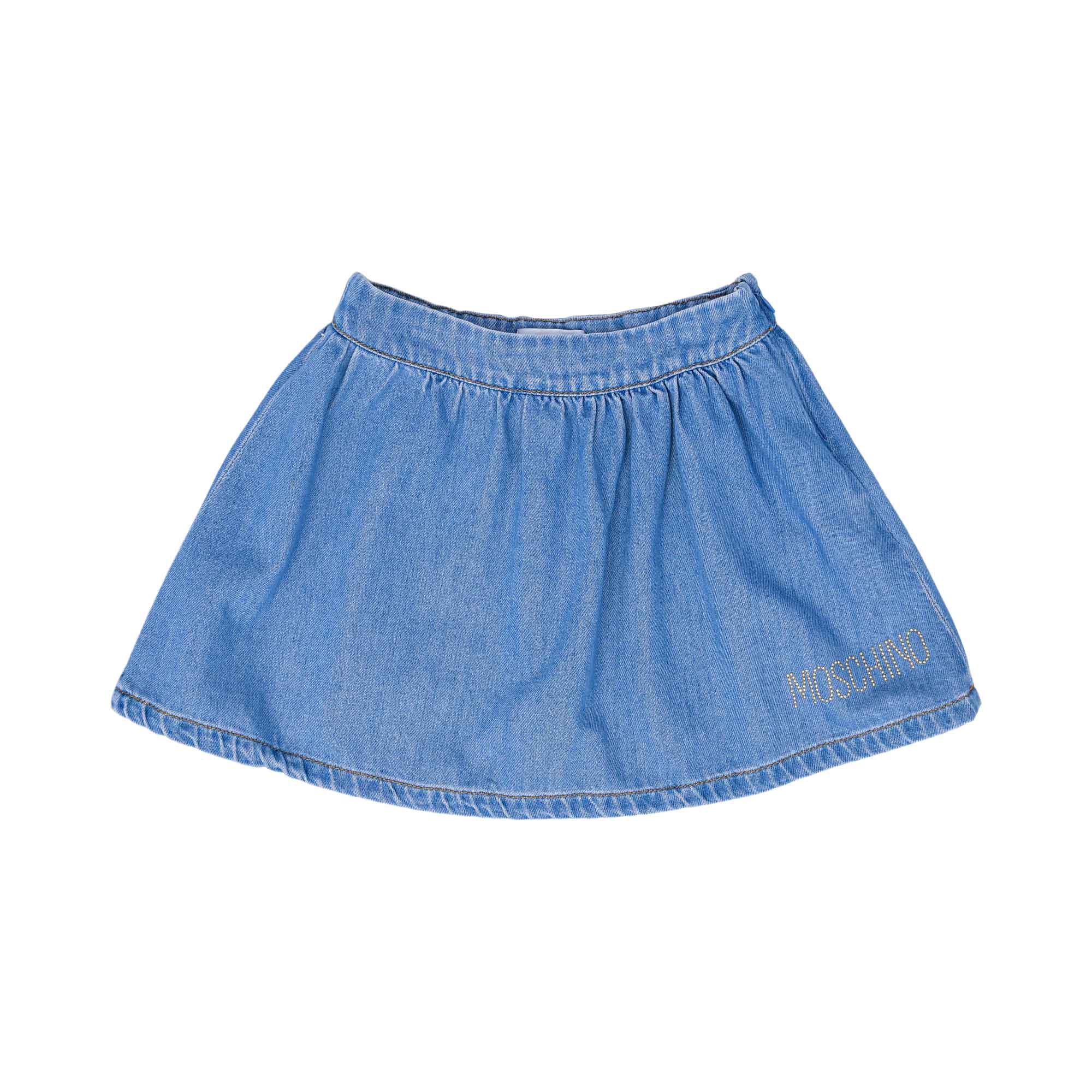 The Moschino Kids Girl's Denim Skirt is a stylish and on-trend piece for any young girl. This skirt features a side zip closure, making it easy to put on and take off. The denim fabric gives it a casual and comfortable feel while still looking fashionable. One of the standout features of this skirt is the rhinestone-embellished logo on the front. This adds a touch of glamour and sparkle to the skirt, making it perfect for special occasions or dressing up an everyday outfit. The logo is a signature of the Moschino brand, known for its bold and playful designs. This denim skirt is a versatile and fun addition to any girl's wardrobe. It can be dressed up with a nice top or dressed down with a casual t-shirt. The side zip closure and comfortable denim fabric make it easy and comfortable to wear, while the rhinestone logo adds a touch of luxury and style. It is the perfect piece for any fashion-forward young girl.
