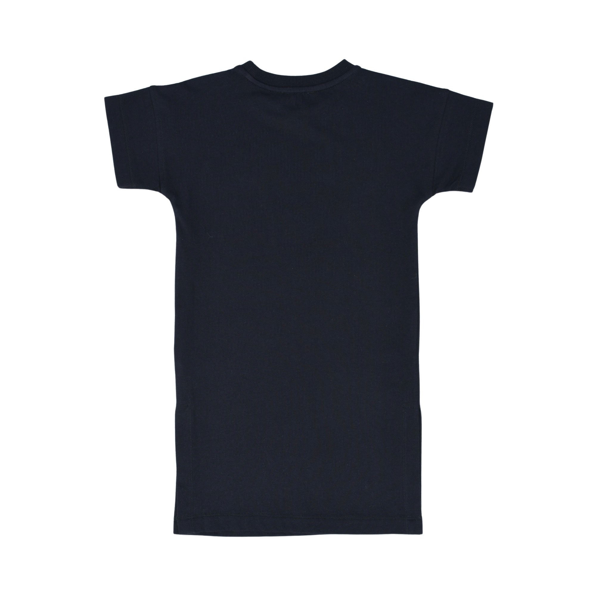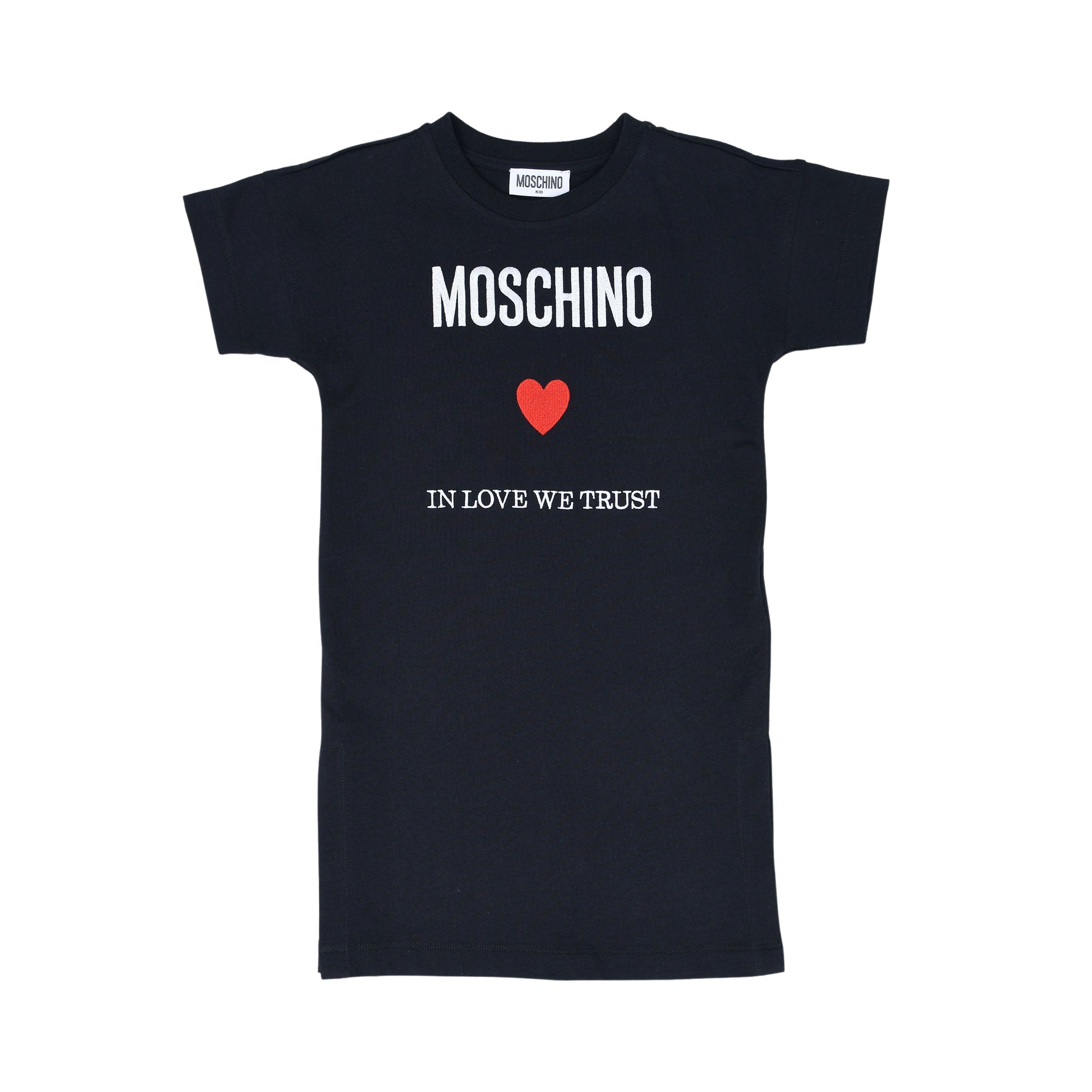 Cotton dress, short sleeves, ribbed crew neck, side slits. It is embellished with logo and red heart on the front.