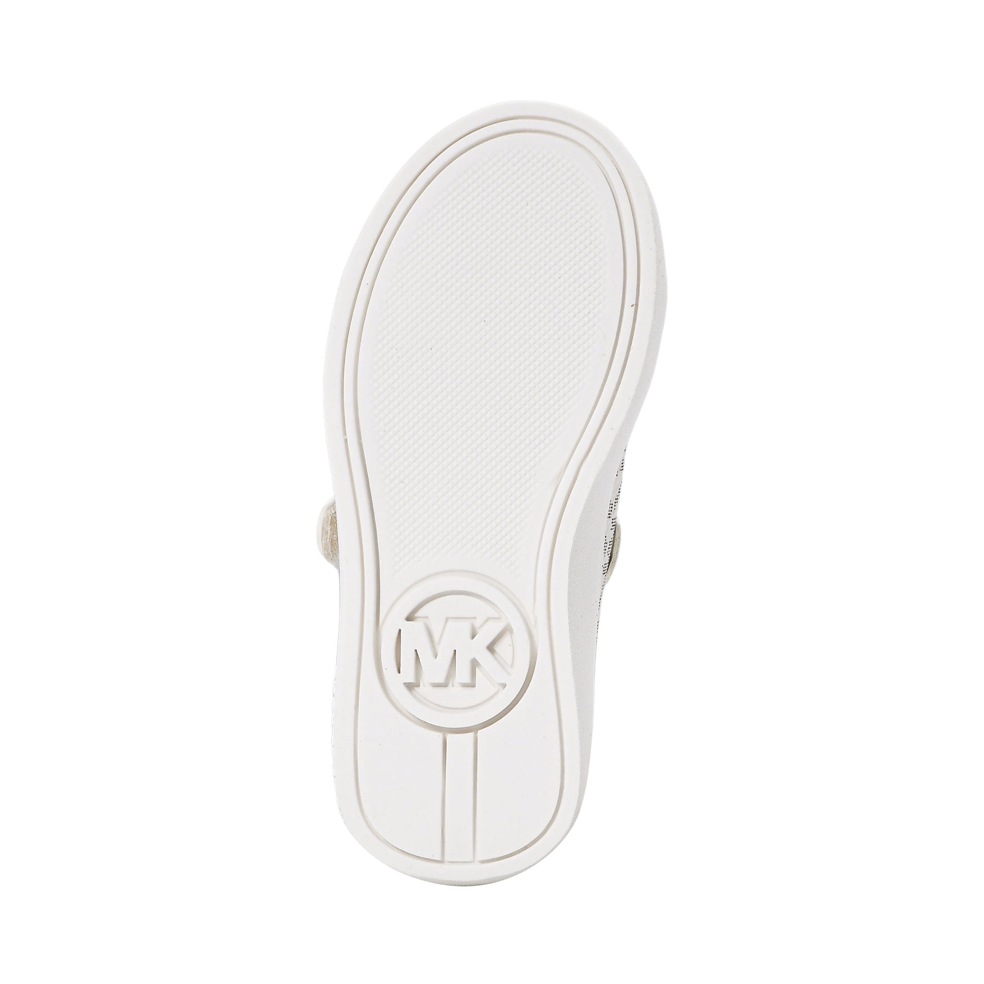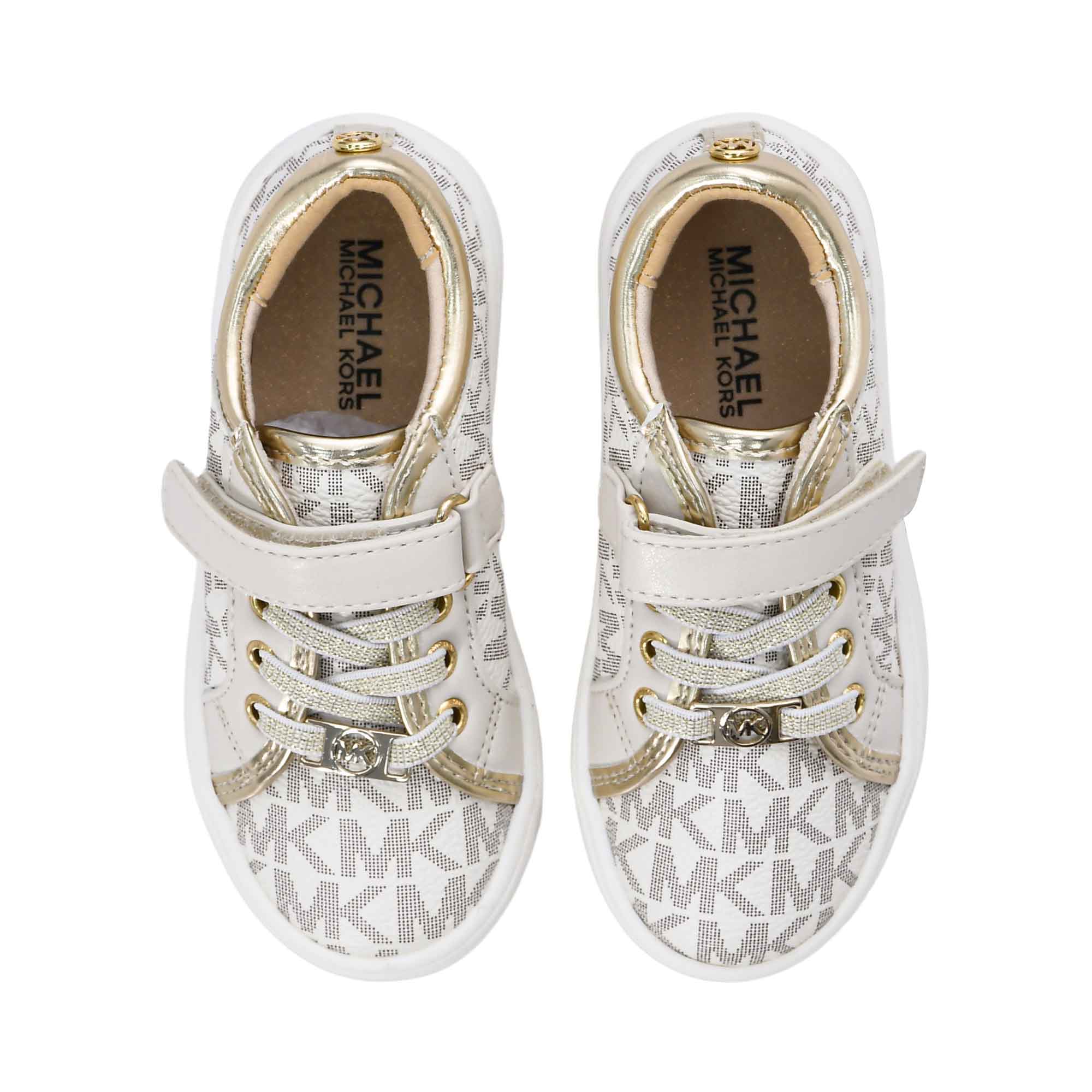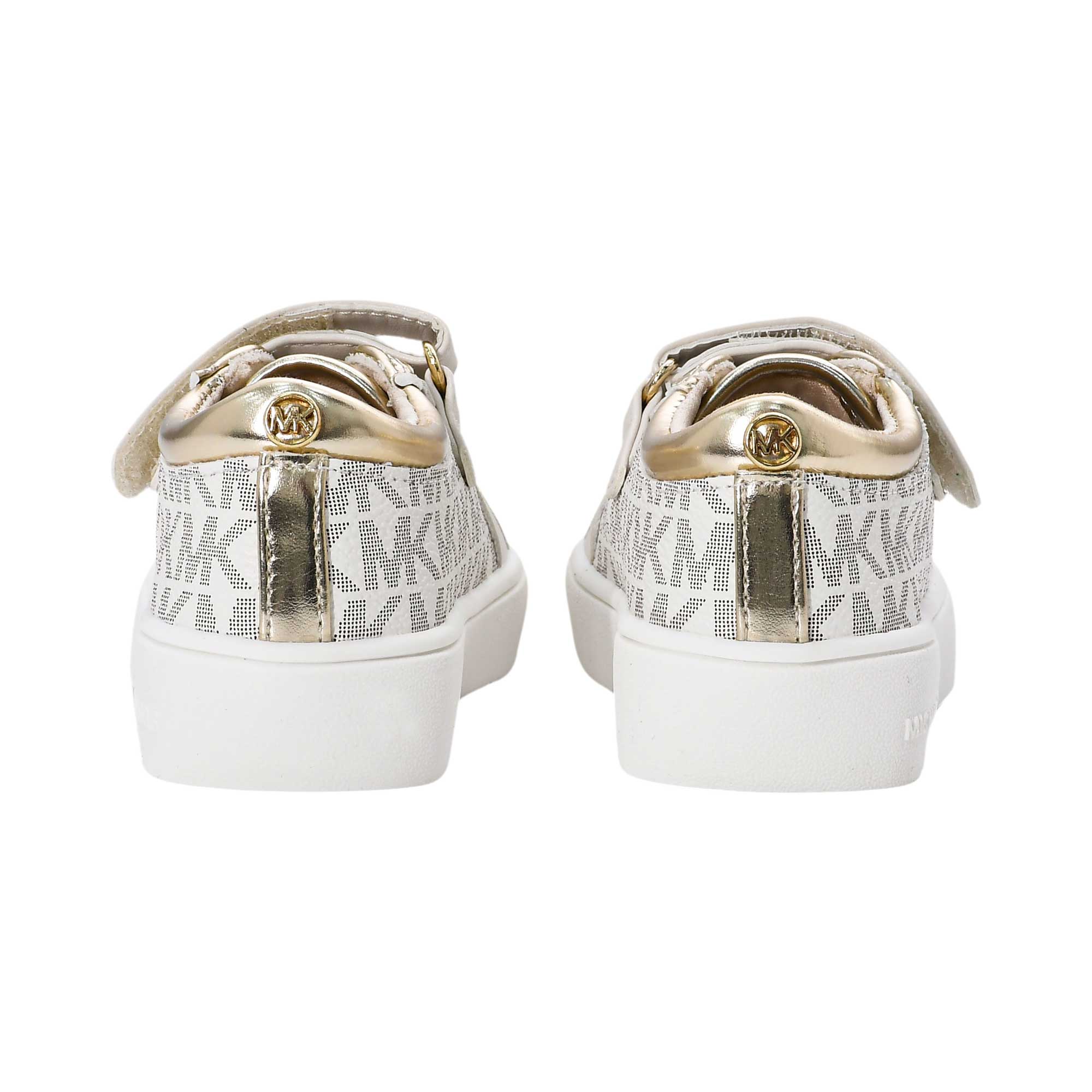 The Michael Kors Kids Girl's Ivory Sneaker is a stylish and practical choice for little girls. Crafted from durable faux leather, these sneakers are designed to withstand active play while maintaining a polished look. They feature elastic laces combined with a Velcro fastening strap, ensuring a secure and adjustable fit that's easy for kids to manage on their own. The sneakers showcase a charming pattern of the iconic MK logo repeated across the surface, complemented by metallic gold trim that adds a subtle touch of sparkle and sophistication. Additionally, the lightly padded insoles provide extra comfort, making these sneakers ideal for everyday wear. The Michael Kors Kids Ivory Sneakers blend fashion and function effortlessly for young girls.