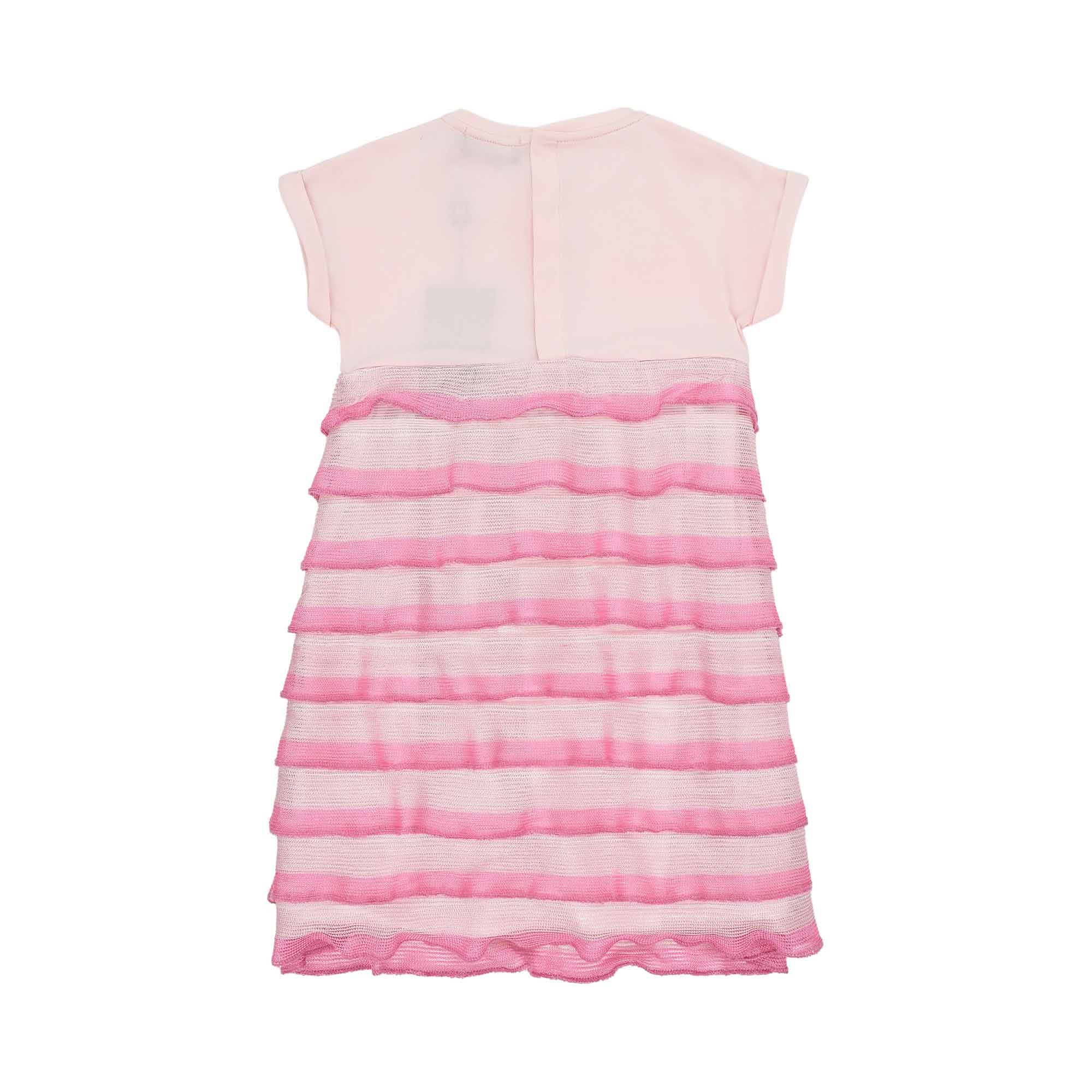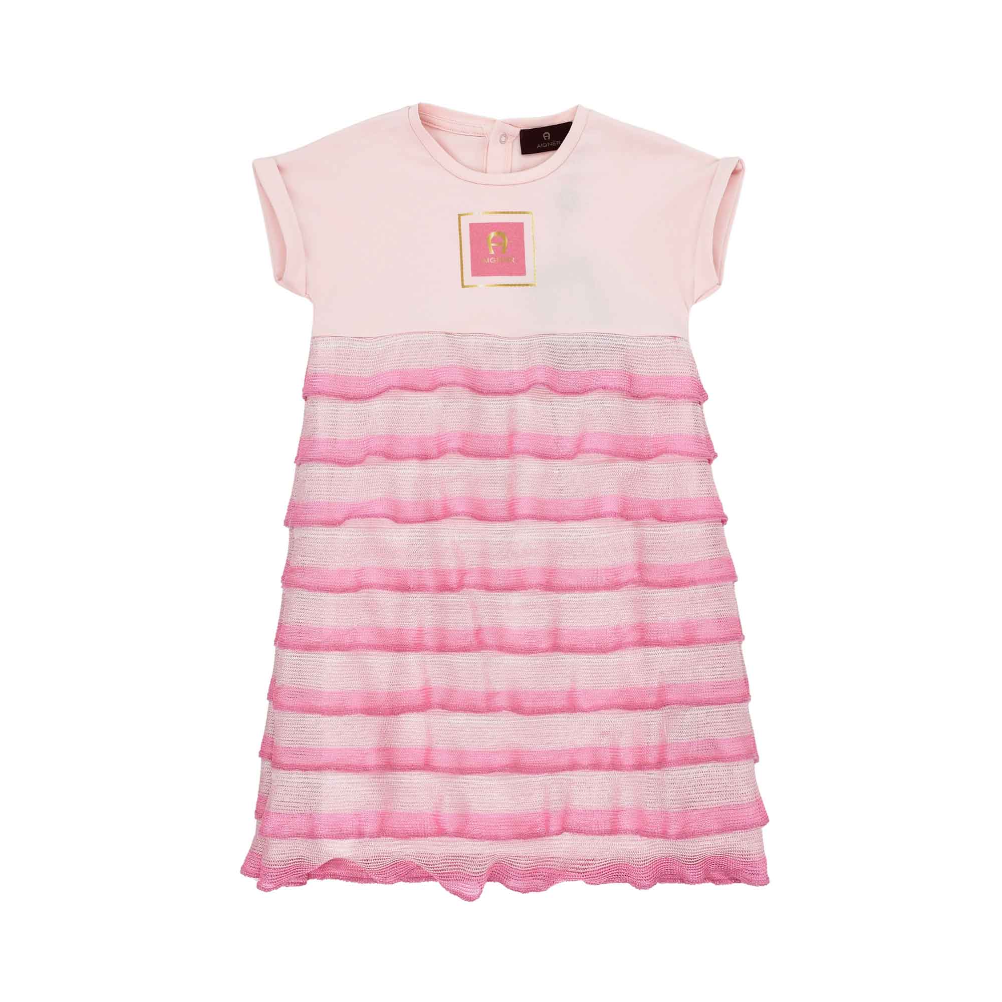 The Aigner Kids Girl's Pink Dress beautifully blends elegance with comfort, making it a standout choice for any young fashionista. Designed with a classic crew neck and short sleeves, the dress features a soft cotton jersey bodice adorned with a shimmering pink and gold logo, proudly displaying the brand’s iconic ‘A’ horseshoe emblem. The playful, tiered skirt—crafted from lightweight polyester—adds volume and movement, while the smooth cotton lining ensures comfort throughout the day. Practical popper fastenings on the shoulder make dressing effortless, and the below-the-knee length offers both style and modesty. Perfect for spring and summer occasions, this pink stripe logo dress is ideal for everything from family gatherings to outdoor outings, making it a delightful and versatile addition to any girl’s wardrobe.