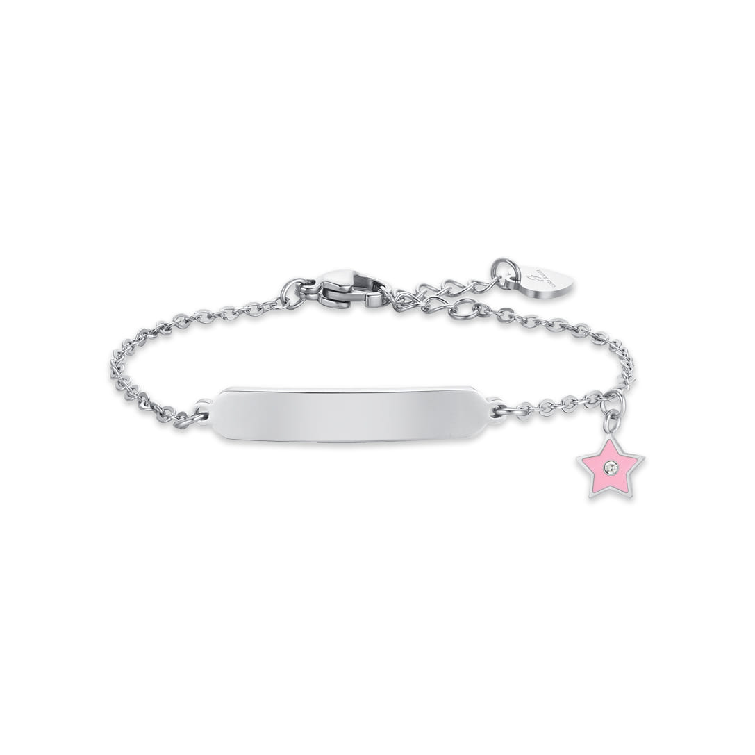 The Luca Barra Girl's Bracelet in Pink Enamel Steel and Plate is a stylish and charming accessory designed to add a touch of playful elegance to any outfit. Crafted from durable steel, the bracelet features a delicate pink enamel star that stands out beautifully against the sleek metallic finish. Its standout feature is the customizable plate, allowing for personal engraving to make the piece uniquely meaningful. Combining modern design with feminine details, this bracelet is perfect for girls who appreciate both fashion and individuality in their jewelry. It seamlessly blends durability with a colorful accent, making it an ideal accessory for everyday wear or special occasions.