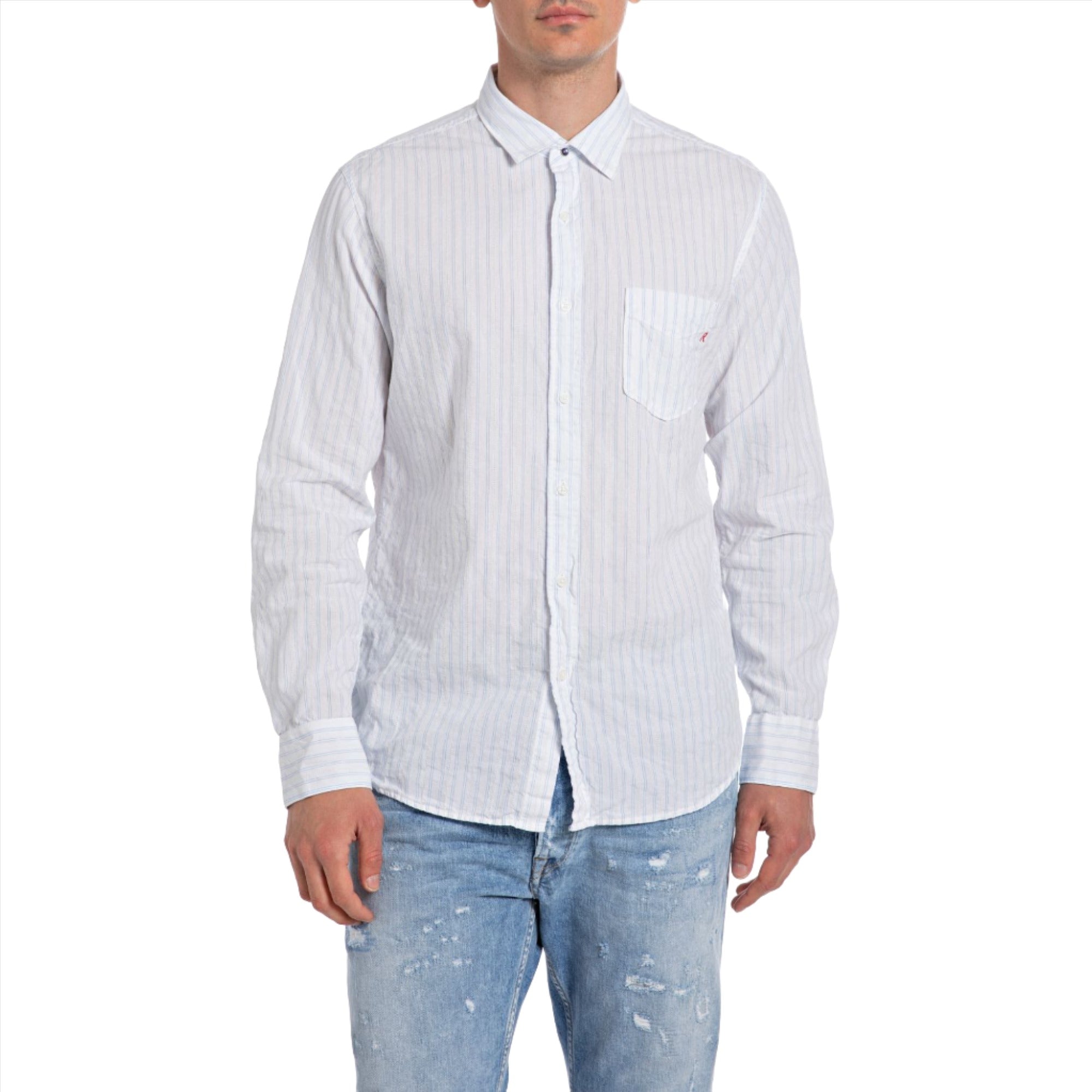 Shirt with regular fit made of dobby cotton with striped pattern. The long-sleeved garment with pocket on the chest and R-shaped embroidery is enhanced by the fastening with buttons.