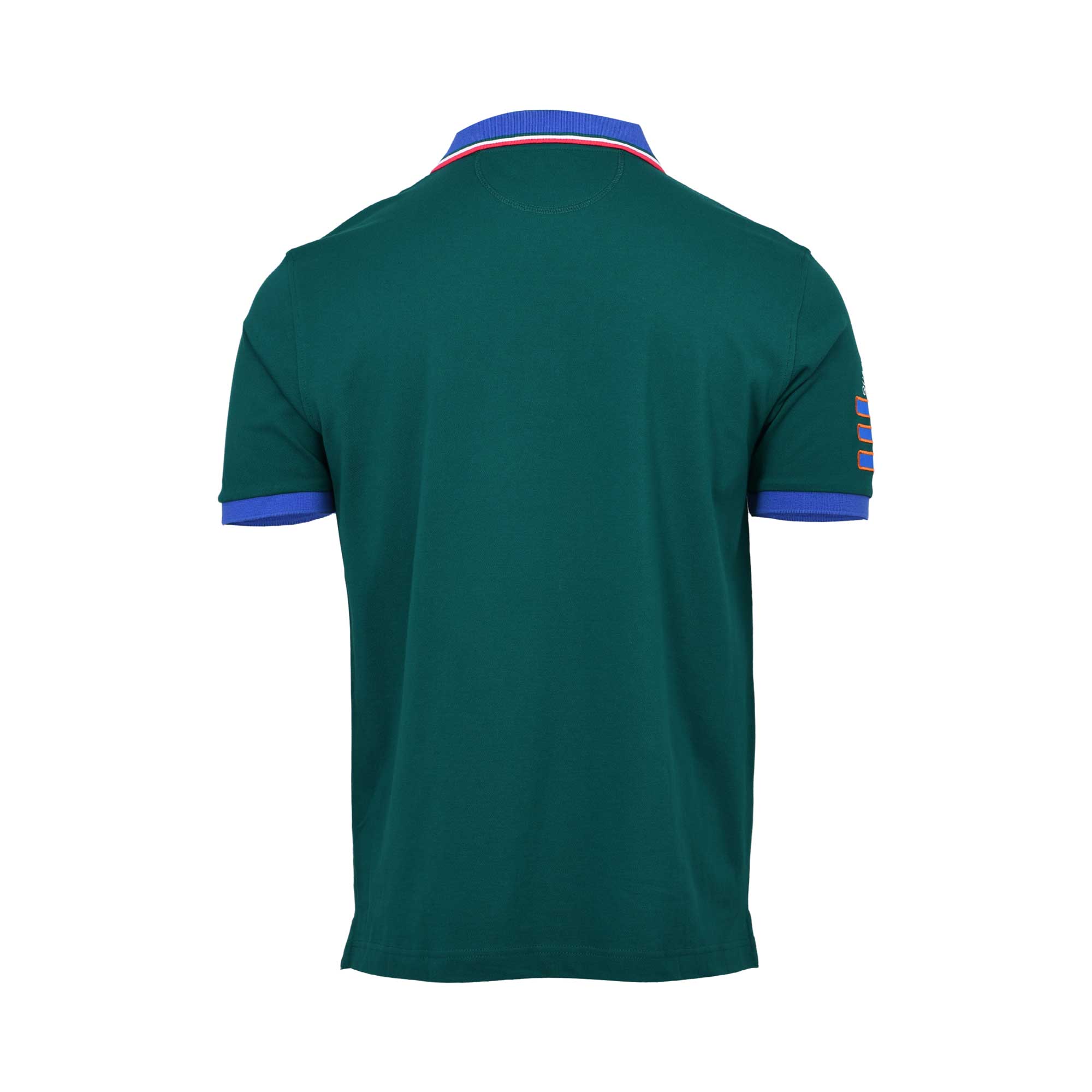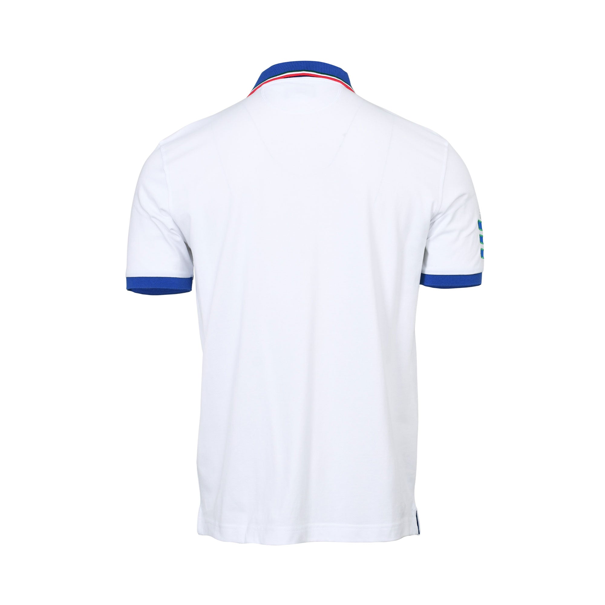 The La Martina Men's Polo Shirt is a refined blend of classic style and vibrant, artisanal detailing. Made from stretch piqué, this plain short-sleeved polo provides both comfort and a dynamic fit. The collar and cuffs are crafted from contrasting ribbed fabric, enhanced with two distinct trim details at the hem, adding a subtle touch of modern flair. Unique hand-embroidered long stitches in the colors of the Italian flag grace the right side of the front, offering a nod to La Martina’s heritage and craftsmanship. A contrasting fabric patch with embroidered lettering is appliquéd on the right sleeve, while the left chest is adorned with a large, eye-catching graphic that artfully combines print and multicolored embroidered threads. Completing the look, the La Martina logo is stitched on the chest in contrasting thread. Designed in a regular fit, this polo shirt seamlessly balances understated elegance with playful, vivid accents, making it an ideal choice for those who appreciate both tradition and contemporary design.