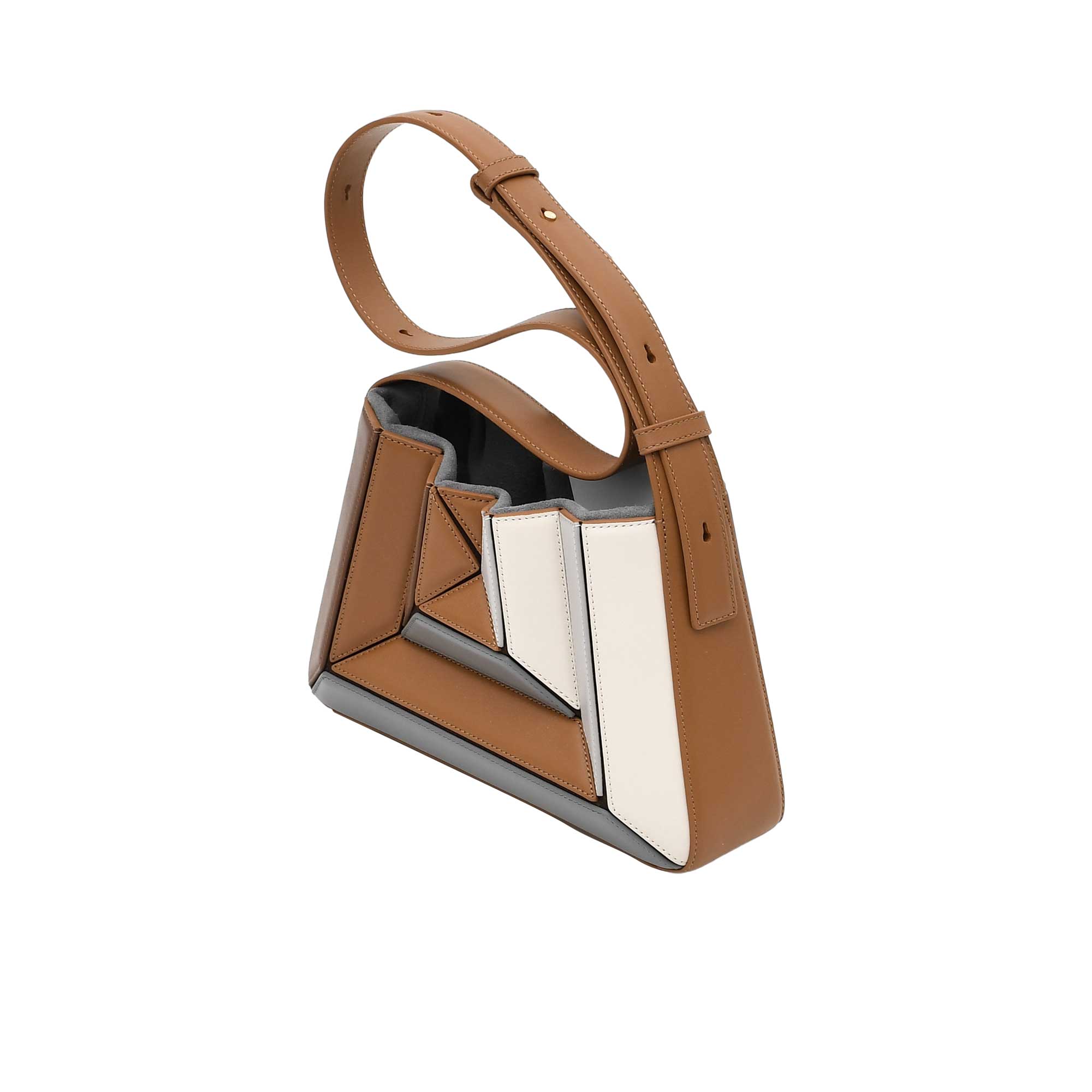 This structured handbag features a geometric patchwork design. It combines multiple shades.