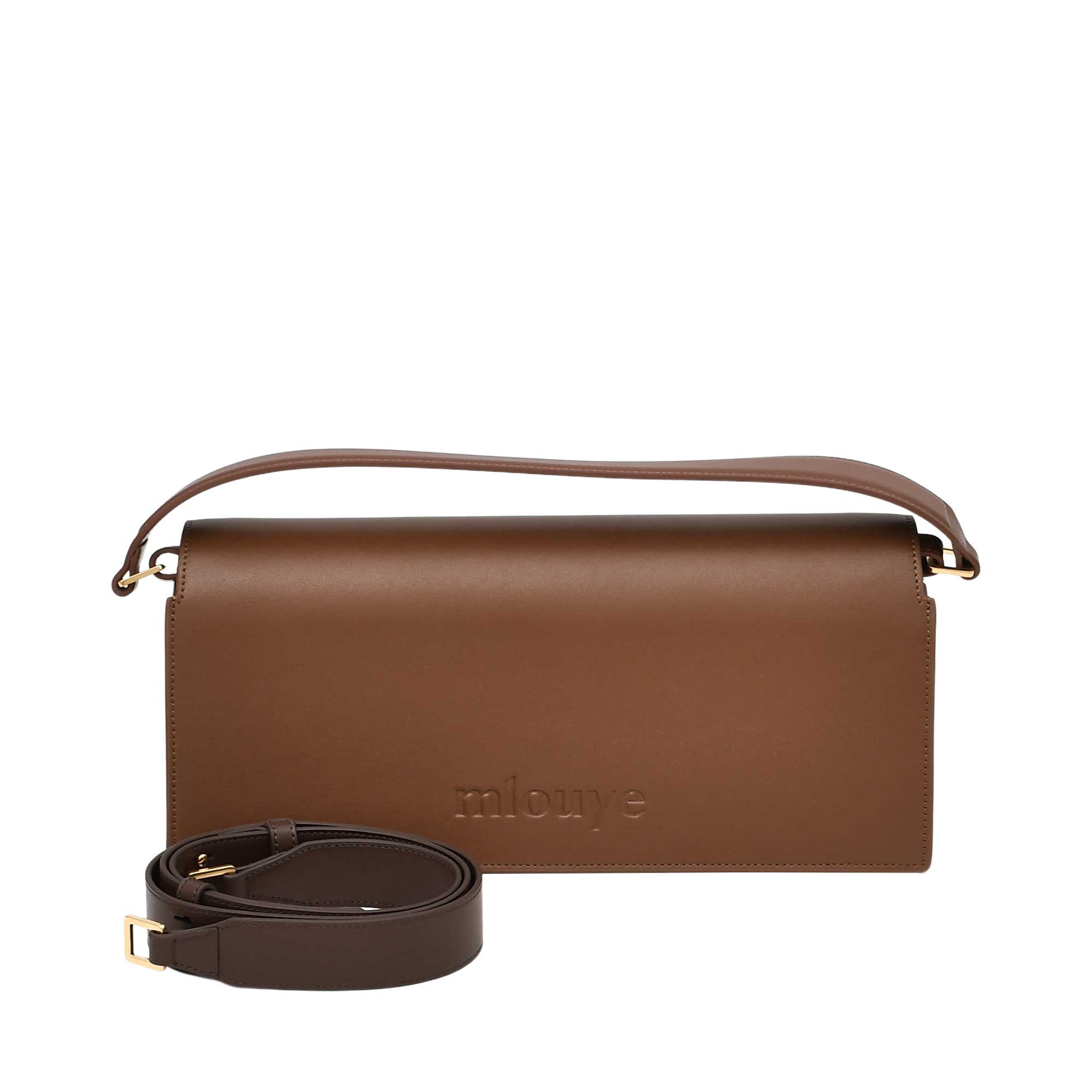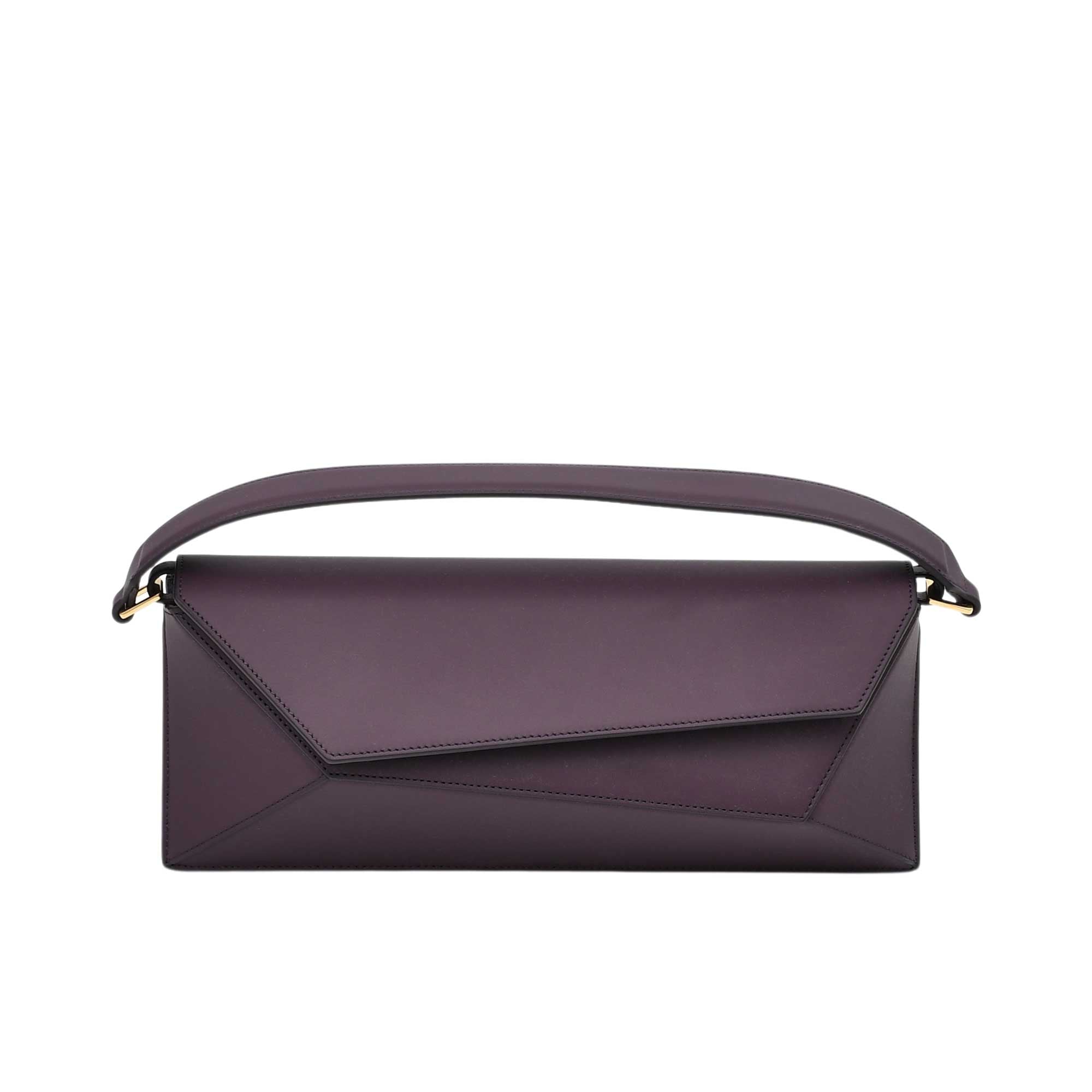 This is clutch with a geometric flap. It has a single handle attached to the top and a structured, rectangular shape.