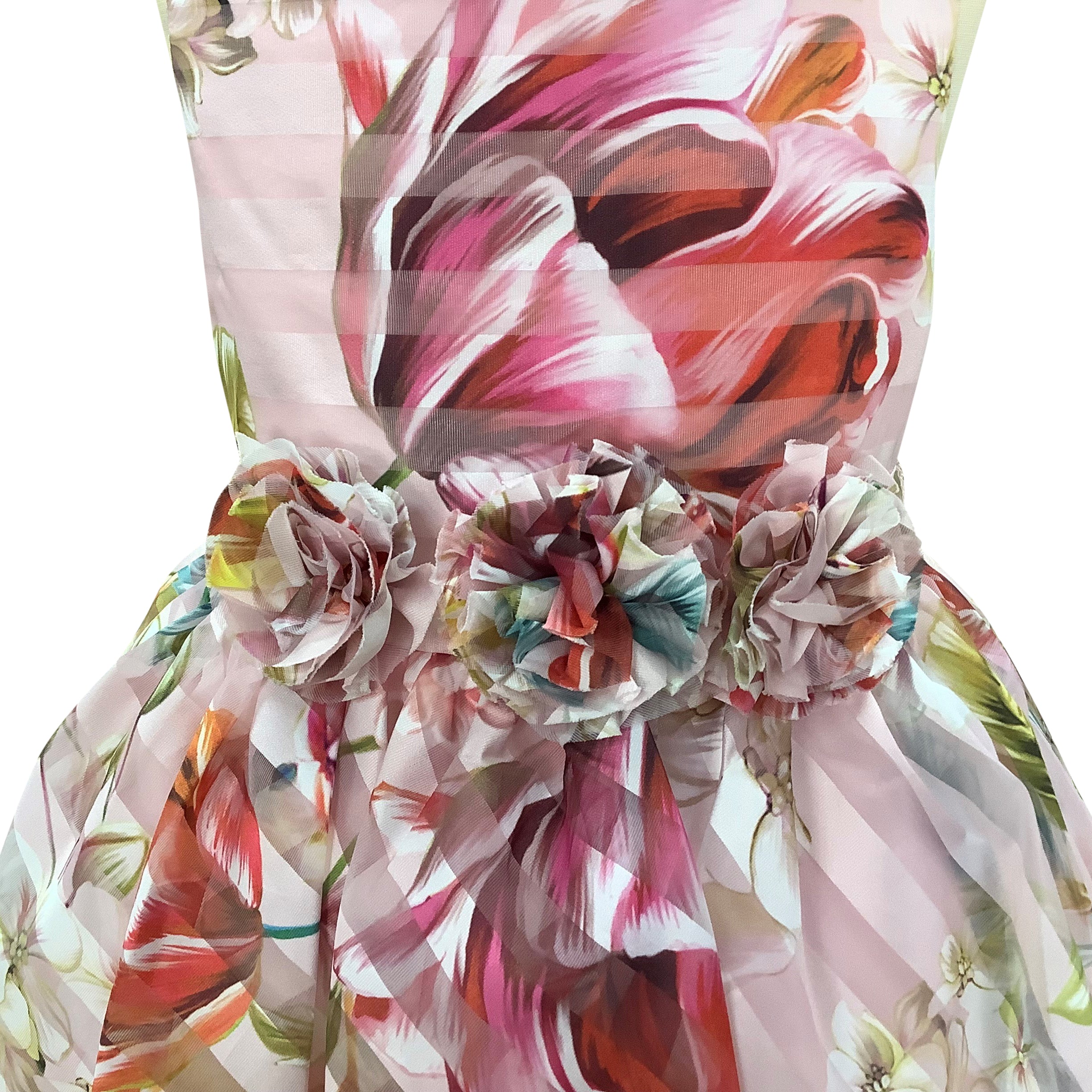 This stunning David Charles dress will make your little girl look like a fairytale princess. The delicate pale pink satin fabric is adorned with a beautiful floral design, creating a unique and eye-catching look. The round neck and sleeveless style is perfect for summer days, while the waist ribbon and concealed zip fastening add a classic touch. The delicate corsages and flowers at the front waist add a luxurious feel to the dress, while the lined design ensures a comfortable fit. Perfect for special occasions, your little girl will look and feel like a princess in this elegant dress. SPECIFICATIONS: