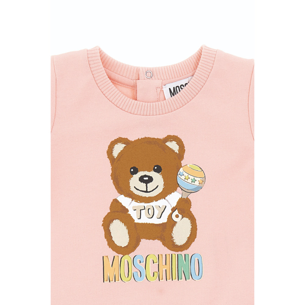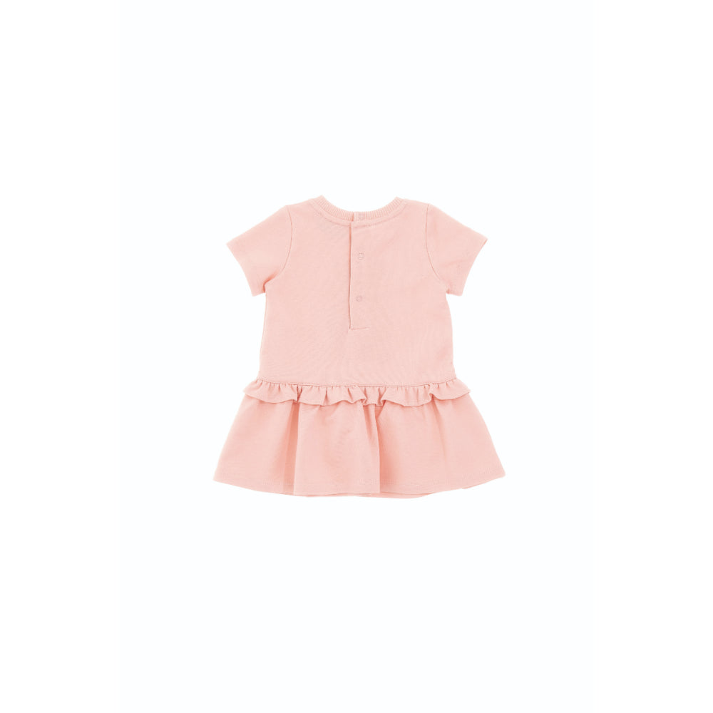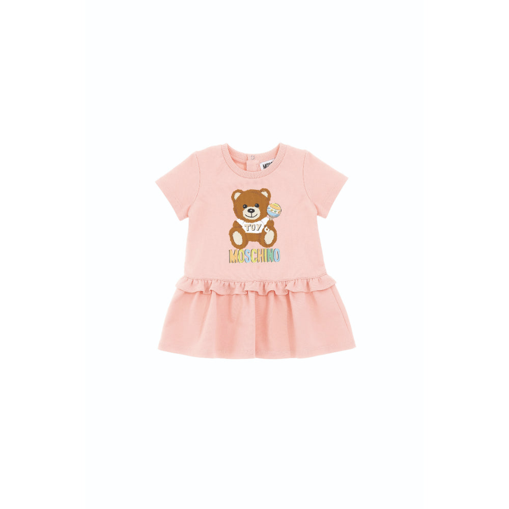 Let your little one make a statement with this Pink Dress for Baby Girls by luxury Italian designer Moschino. Crafted from premium soft cotton jersey, this dress features the iconic teddy bear and colorful logo print on the front, with round neck, short sleeves, a ruffled trims, dropped waist and flounce skirt. The dress also has popper fastenings at the back for easy dressing. Perfect for special occasions, this dress will ensure your little one looks stylish and cute. The Moschino dress guarantees your baby girl will stay comfortable and stylish all day long. SPECIFICATIONS: