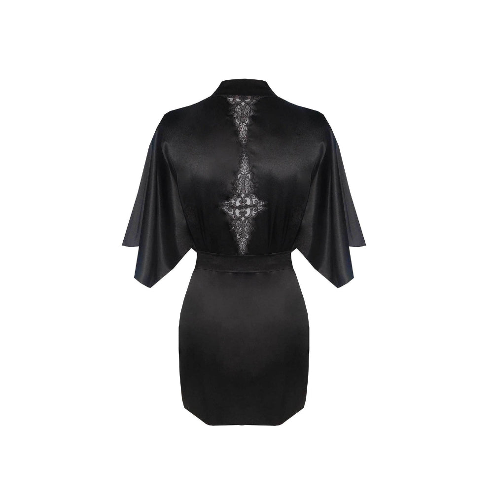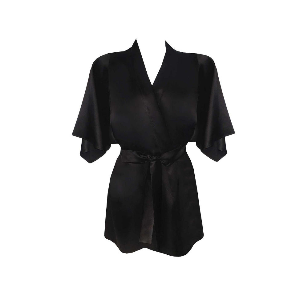 The Fleur of England Onyx Silk Robe is sure to turn heads. Crafted from luxurious black silk and finely embroidered with an elegant stitched motif, this robe makes a statement. The kimono-style 3/4 length sleeves flutter gracefully as you move, providing subtle drama. In addition to making an exquisite statement, this robe is practical. With easy sizing options, it ensures that you will find the perfect fit. Whether you’re searching for a special occasion piece or a luxurious gift, the Onyx Silk Robe is ideal. Paired with Fleur of England's Onyx Strapless Boudoir Bra and Ouvert Brief, this set creates a stunningly seductive bedroom look. Comfort and style come together in this robe to make a statement that is sure to turn heads. With the Onyx Silk Robe, you can show off your individual style in comfort and luxury. SPECIFICATIONS