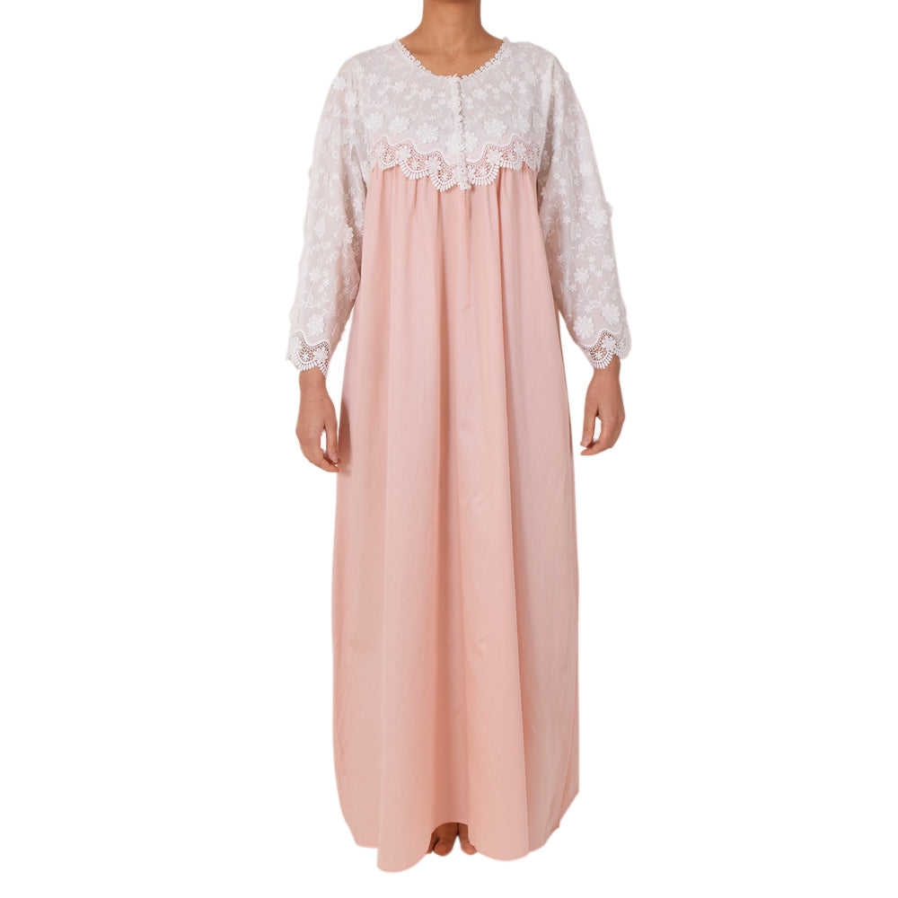 فستان نوم قطني مزين بدانتيل ثقيل مثبت عند الكوع. هذه المجموعة رفيعة الجودة مضمونة تمامًا