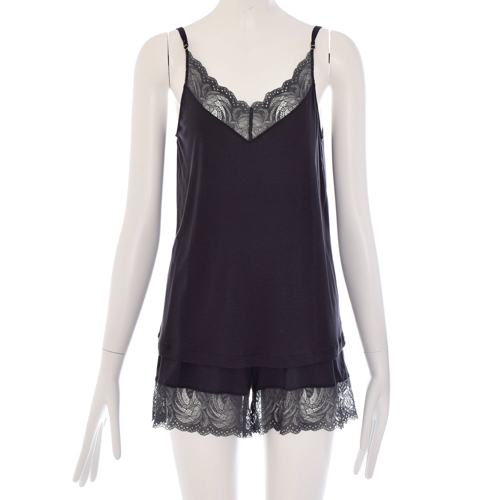 الأناقة المغرية لليالي الفاخرة هذه المجموعة مصنوعة من مشروط ناعم . هذه القطعة مزينة بالدنتيل الفخم جاكار ترونيك ، بيجامة قصيرة مذهلة مع ظهرها الدانتيل ، خيار مثالي للإستراحة او النوم . تتميز بأربطة سباغيتي قابلة للتعديل بالكامل وسحب سهل على الخصر المطاطي القصير.