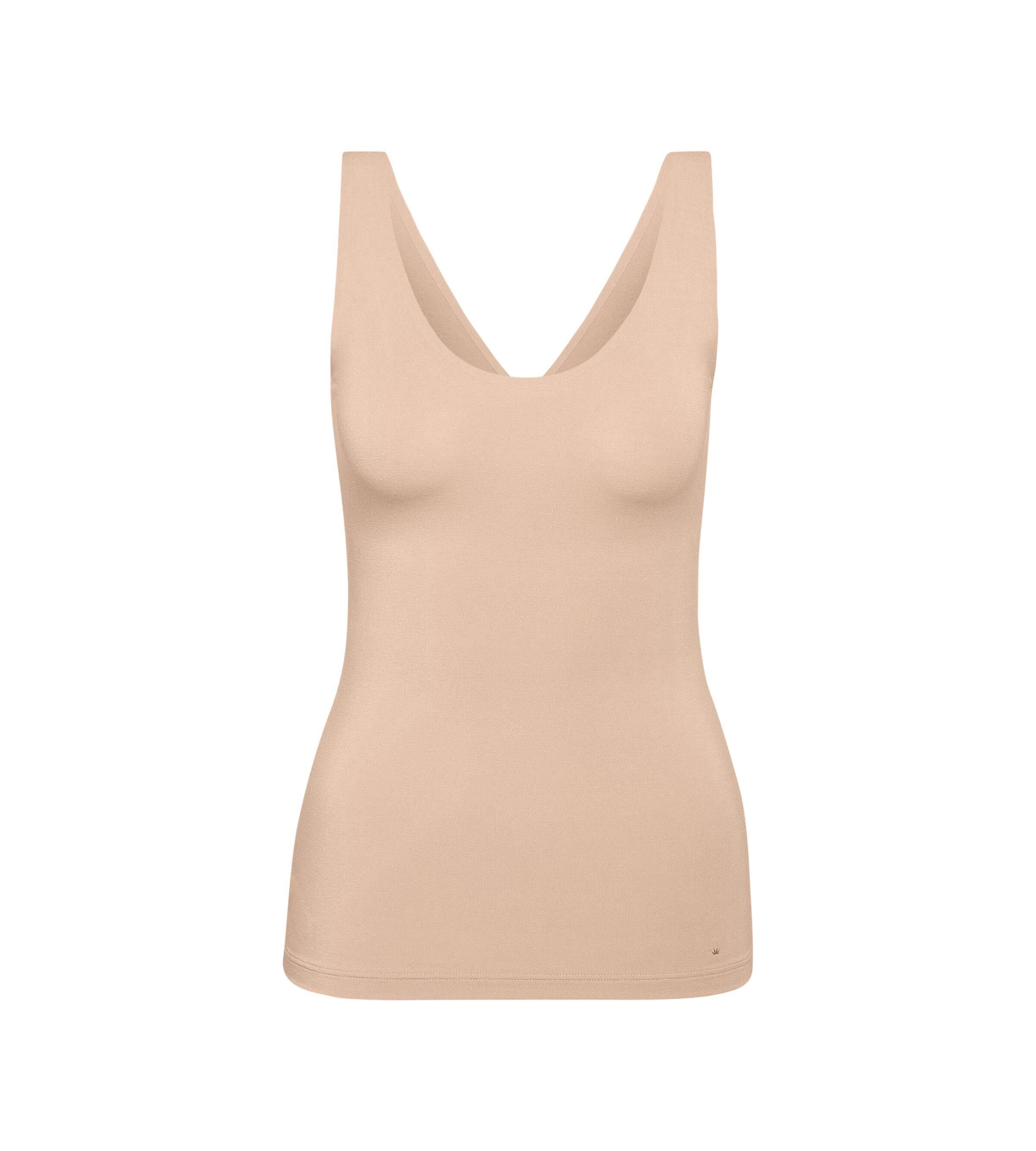 Triumph presents a seamless appearance with this sporty and comfortable racerback bra top. Flex Tech fabric was specifically designed to move with your body while still providing support for your bust. A logo is displayed on the front of it. The neckline is round and there are no sleeves on the garment. Fabric that is soft to the touch, made from recycled materials, and flexible.