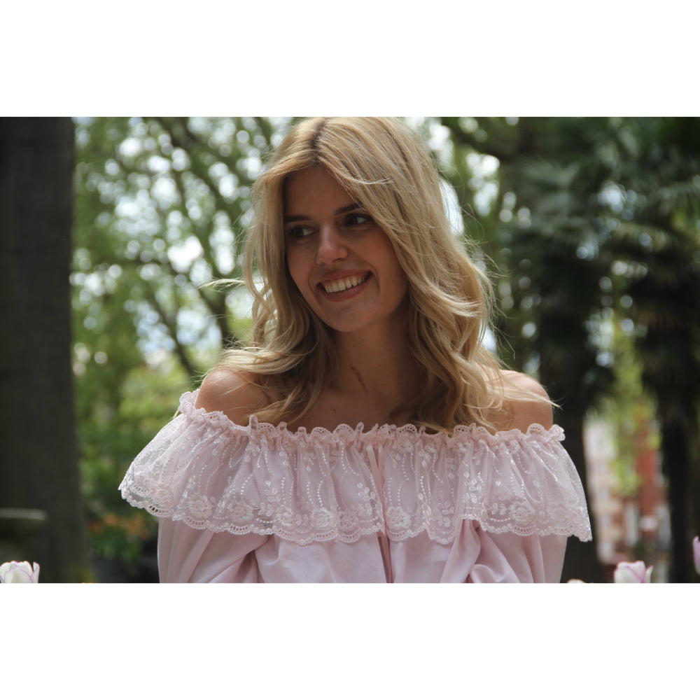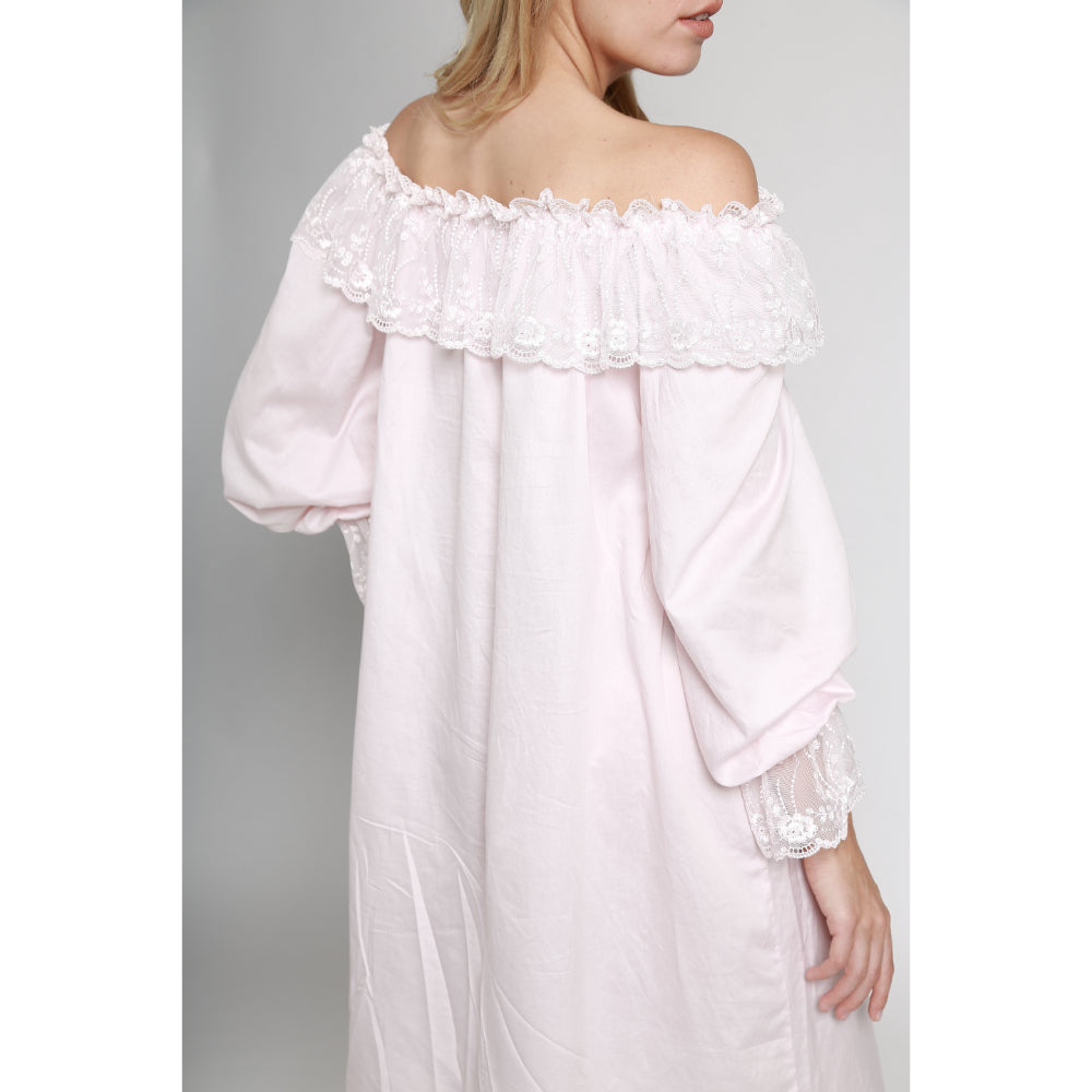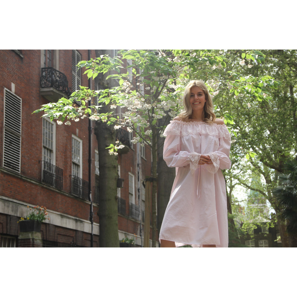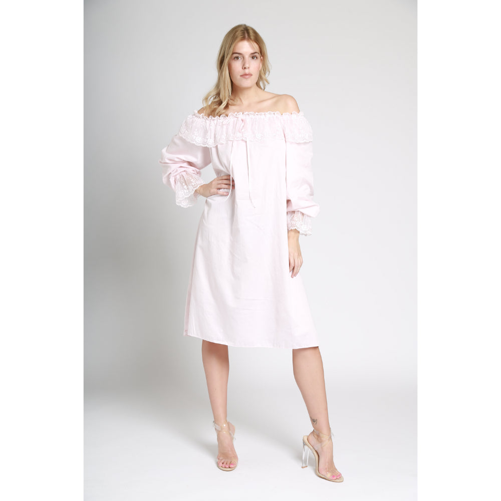 The Lya London Off-Shoulder Dress is the perfect choice for a romantic night out or special occasion. This beautiful off-shoulder blush pink nightdress is crafted from lightweight cotton-voile and features delicate floral lace sleeves with satin ribbons for a feminine, yet modern look. This breezy dress will flatter and frame your figure for a classic, yet relaxed fit. Perfect for a summer evening, the Lya London Off-Shoulder Dress will have you looking and feeling your best. With its delicate details and romantic hue, this dress is sure to make you stand out from the crowd. SPECIFICATIONS: