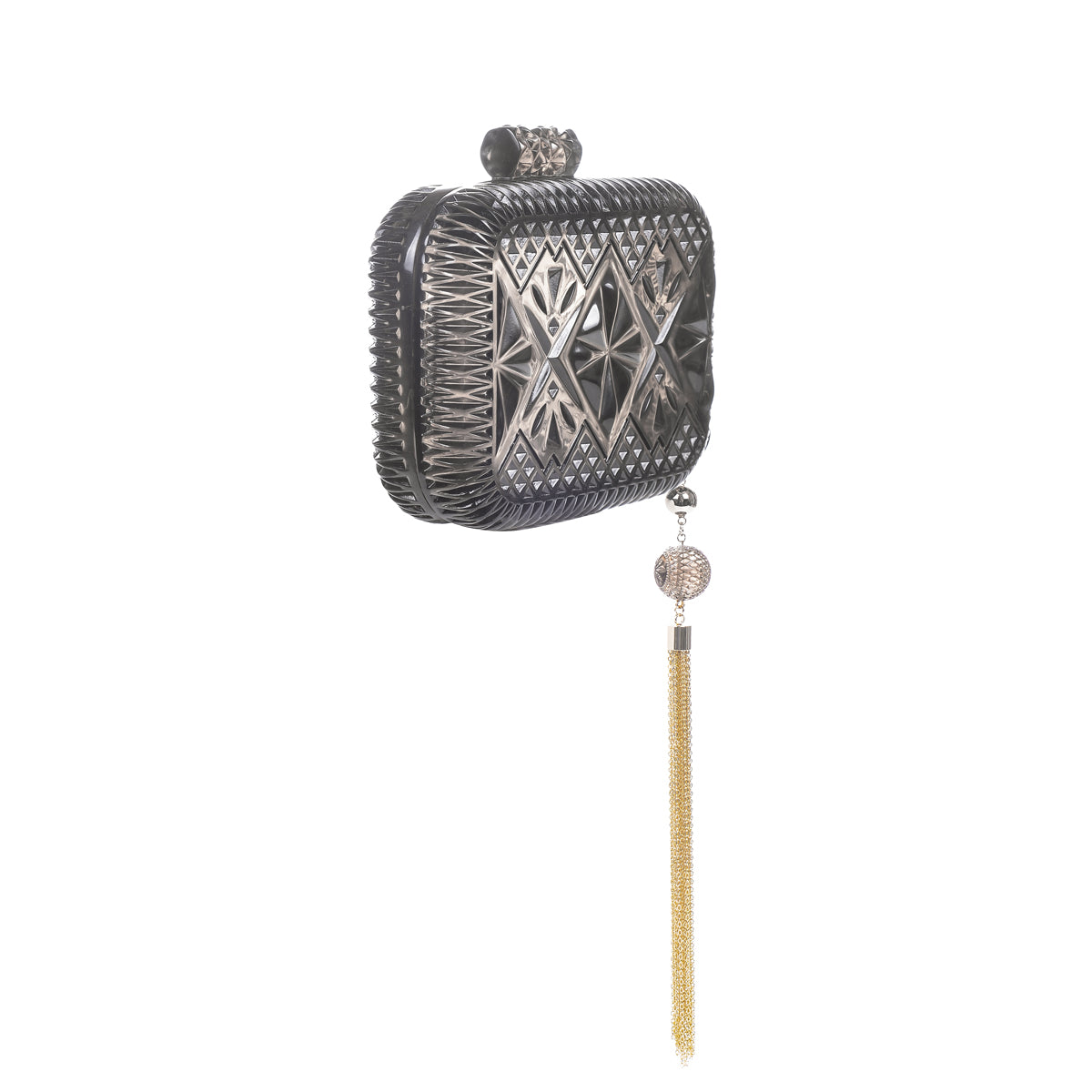 The DouglasPoon Hand Carved Clutch Bag is a luxurious, sophisticated accessory perfect for any special occasion. Crafted from high polished resin, the clutch catches the light spectacularly to show off the intricate hand carving on the exterior for a beautiful finish. The magnetic fastening keeps the contents secure, while the detachable chain shoulder strap provides a convenient carrying option. The Dark Grey shade is complemented with a hint of gold tone for an elegant finish. Use it to add a touch of glamour to a little black dress or for a more casual look, style with a denim jacket and jeans. An exquisite accessory, the DouglasPoon Hand Carved Clutch Bag is sure to make a statement wherever you go. SPECIFICATIONS: