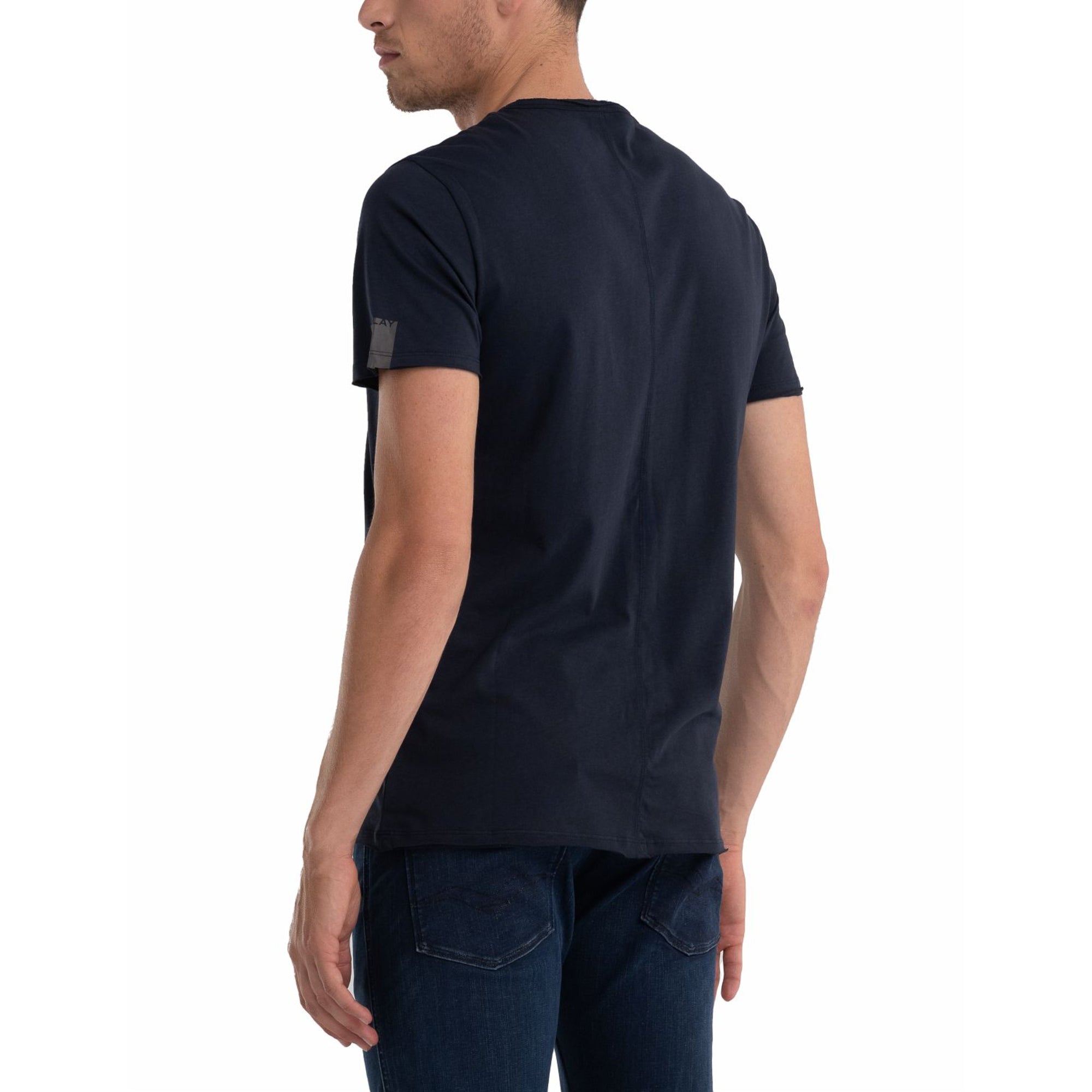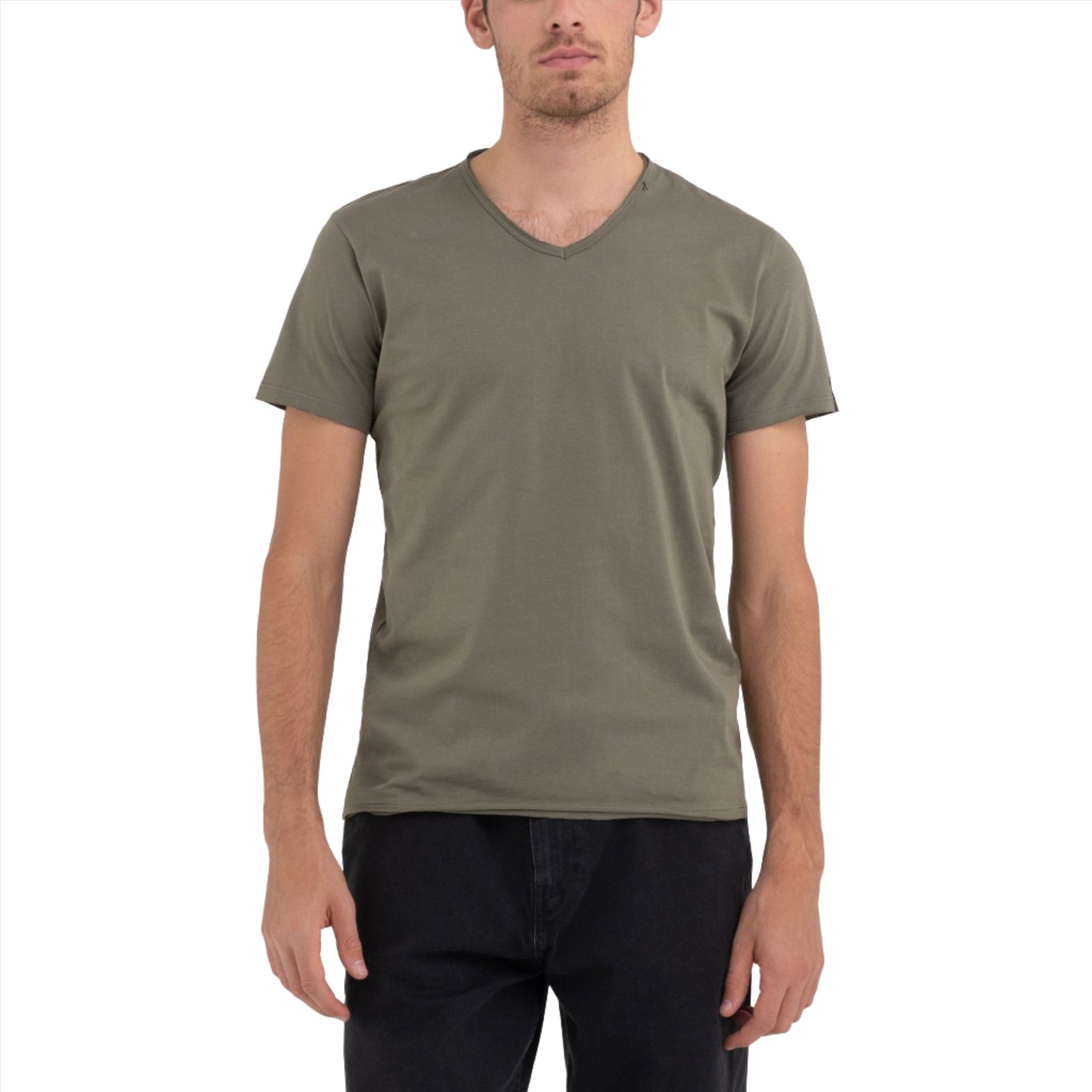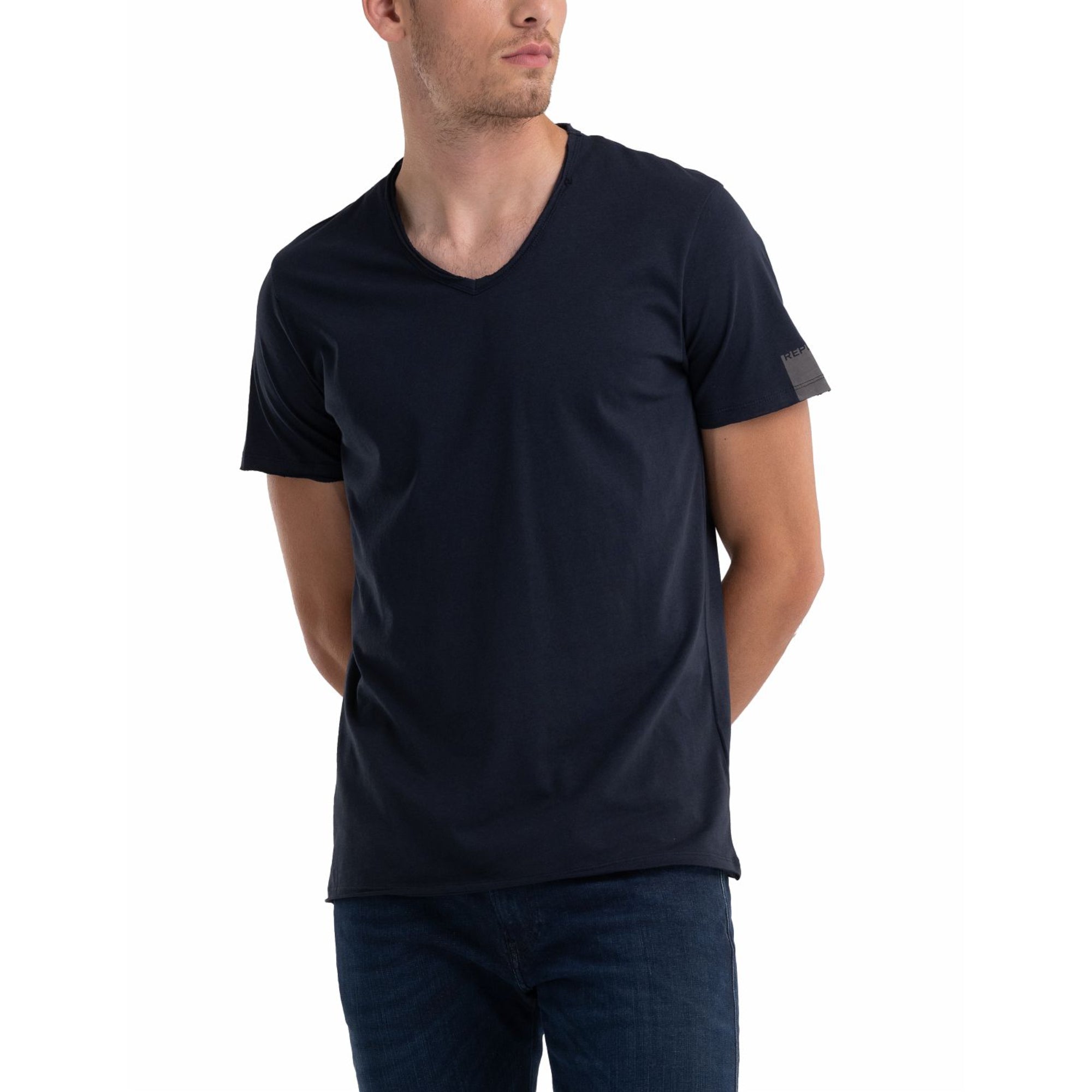 V-neck t-shirt in mélange cotton jersey with regular fit. The short-sleeved garment is refined by the customized print on the side of the sleeves.