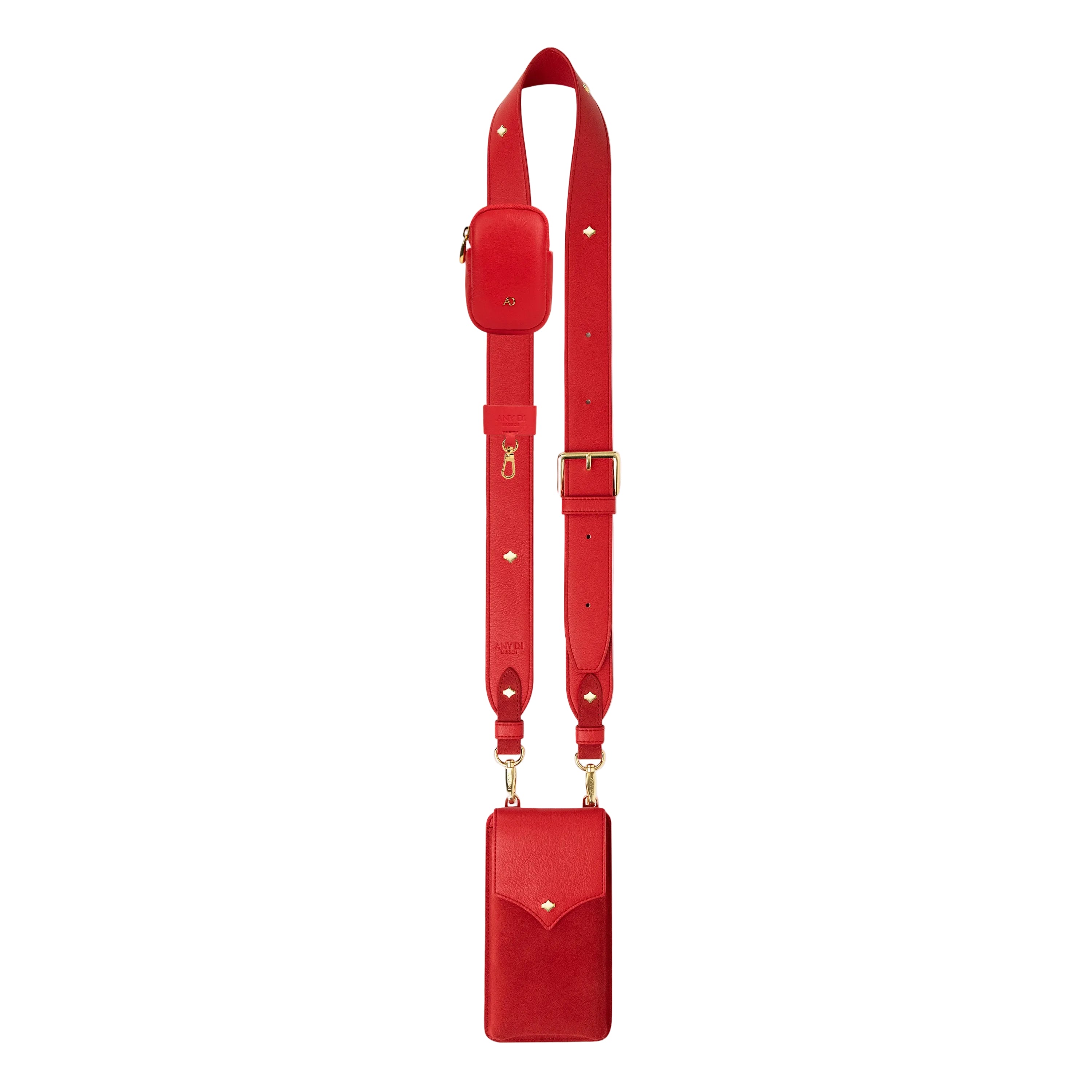 Crafted from high-quality leather, this bold accessory features an adjustable strap with sleek stud accents and two perfectly matched pouches, offering a sophisticated and hands-free solution for your phone and essentials.