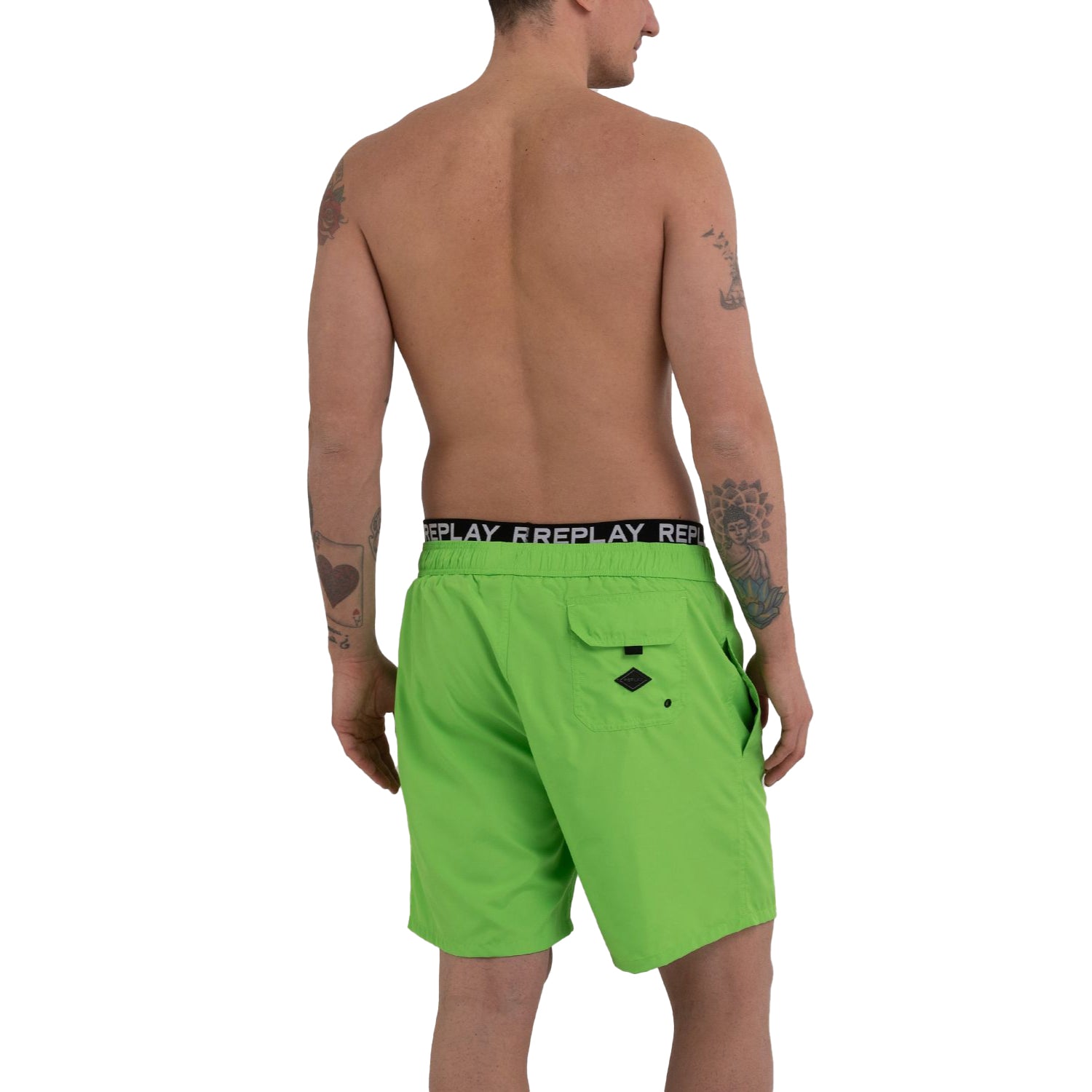 Solid-colored swimming trunks with regular fit. The garment is equipped with an outer rubber band at the waistband with all-over logo and customized drawstring. The swimming trunk is characterized by the lettering print and by the diamond-shaped logo at the back. The item is enhanced by the two vertical pockets and by the flap pocket with velcro at the back. Inner lining in nylon.
