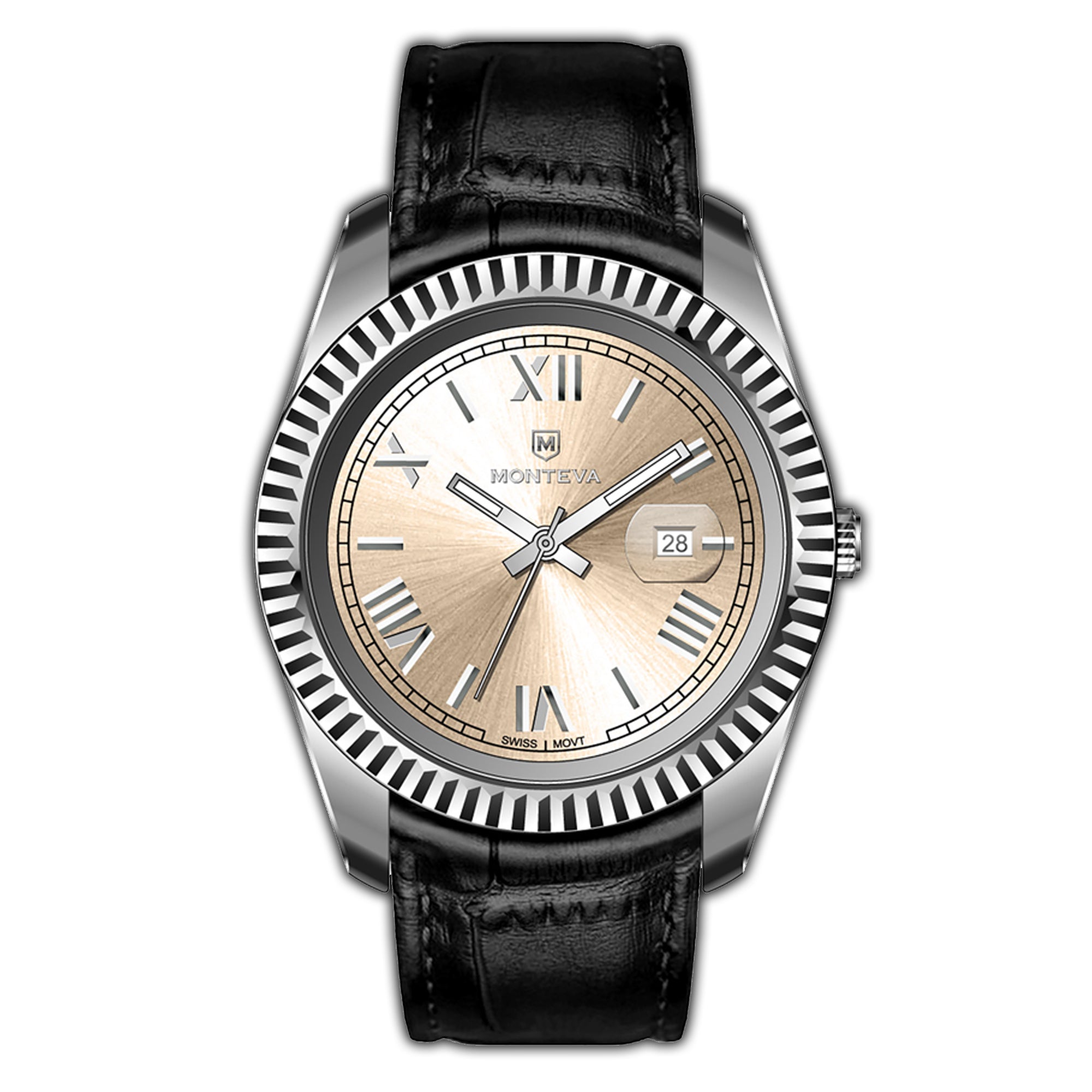 Embrace timeless sophistication with the MONTEVA M232R Gents Watch. Featuring a radiant champagne sunray dial with classic Roman numeral indexes, a distinctive fluted bezel, and a comfortable black leather strap, this watch is designed for the modern gentleman who appreciates enduring style with a touch of warmth.