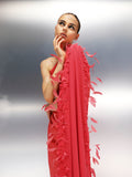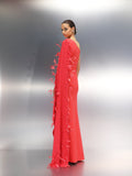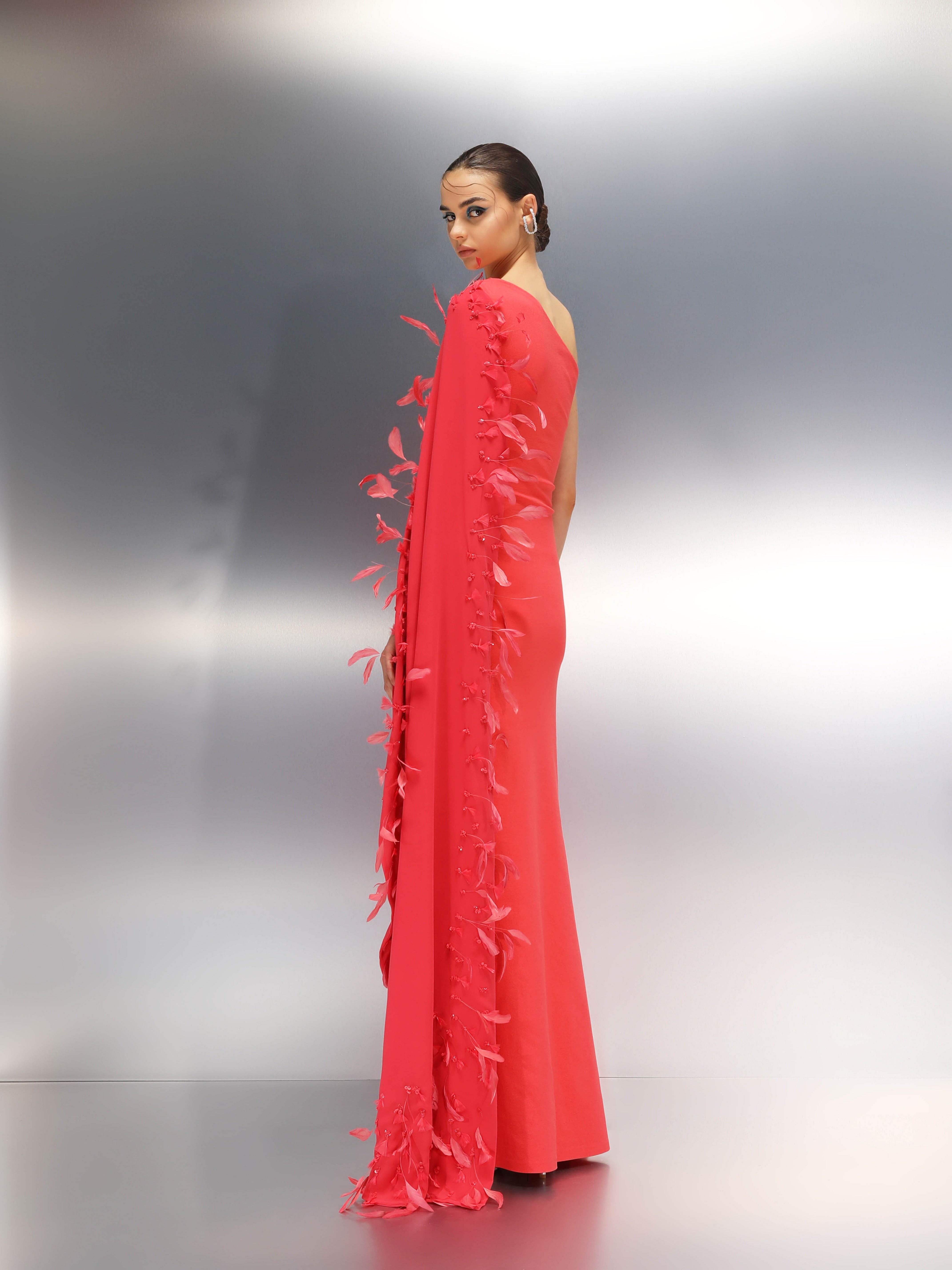 The Velvety Couture Women's RICCHI Sugar Coral Dress is a captivating and fashion-forward piece that exudes sophistication and bold design. Crafted to make a statement, this dress features a striking one-shoulder silhouette that elegantly highlights the neckline and collarbone, adding an element of allure and modernity to the overall look. Gathered at the waist, the dress beautifully contours the body, emphasizing natural curves and providing a flattering and feminine silhouette. The rich sugar coral hue adds a vibrant and eye-catching element, ensuring that the wearer stands out in any setting, whether it's a sophisticated evening affair or a stylish daytime event. A standout feature of this dress is the asymmetric feather detail on one sleeve, meticulously handmade to bring a sense of texture and drama to the ensemble. This unique design choice offers a luxurious and opulent touch, perfectly balancing the sleekness of the one-shoulder style with an element of high fashion artistry. It's perfect for occasions where one wishes to leave a lasting impression with a combination of bold color, sophisticated structure, and exquisite detailing. Whether worn to an upscale event or a chic gathering, this dress embodies contemporary glamour and undeniable confidence.