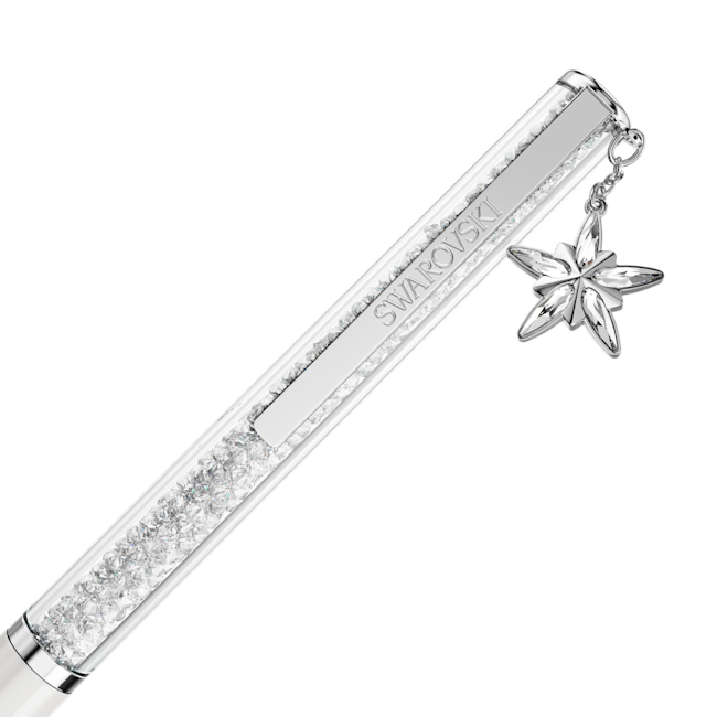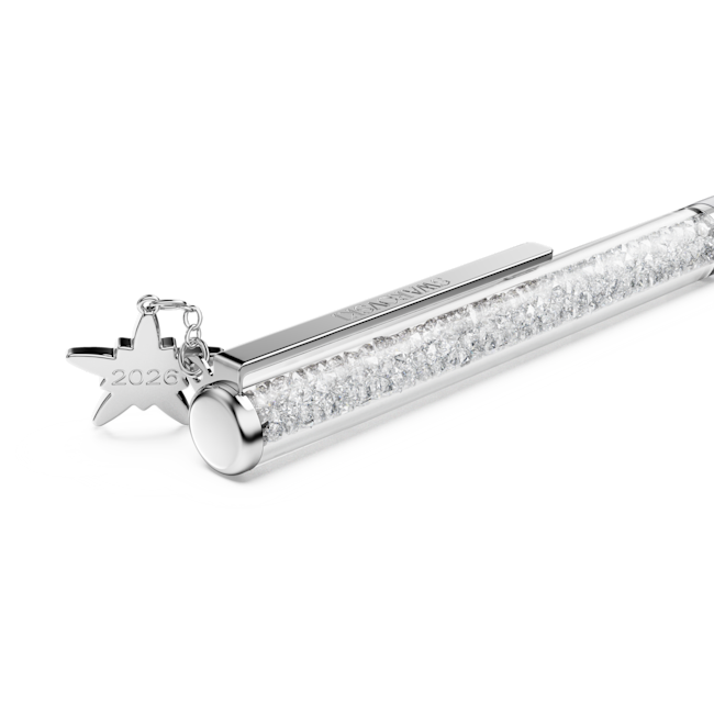 This 2026 Annual Edition ballpoint pen offers a timeless accessory for endless creativity. The slimline design is filled with around 400 clear crystals, which are visible through the long transparent window. Along with a lacquered white barrel, the pen includes chrome finishing for an ultra-luxurious look. A radiant star charm is featured at the end of the pen, with the year 2026 engraved on the back. Refills of black and blue inks are available to purchase in Swarovski stores.