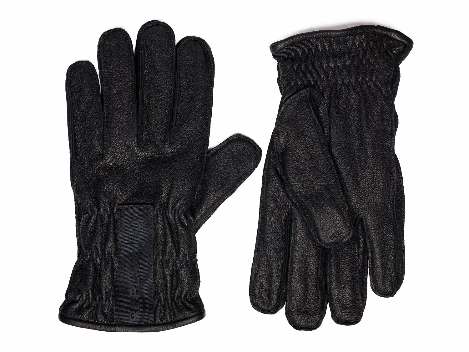 Gloves made of soft and warm solid-colored hammered leather. Elasticated cuffs with gathering and tone-on-tone customized label at the back of the hand. Gloves made of soft and warm solid-colored hammered leather. Elasticated cuffs with gathering and tone-on-tone customized label at the back of the hand.
