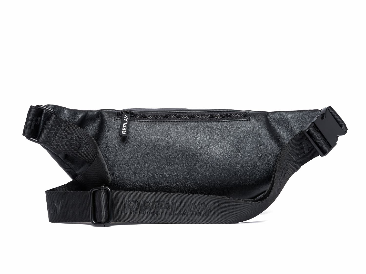Solid-colored waist bag with customized adjustable shoulder strap in ribbon with release buckle at the back. The item features one main zipped compartment and two welt zipped pocket, one at the front and one at the back. Length 40 cm x Height 13 cm x Width 7 cm.