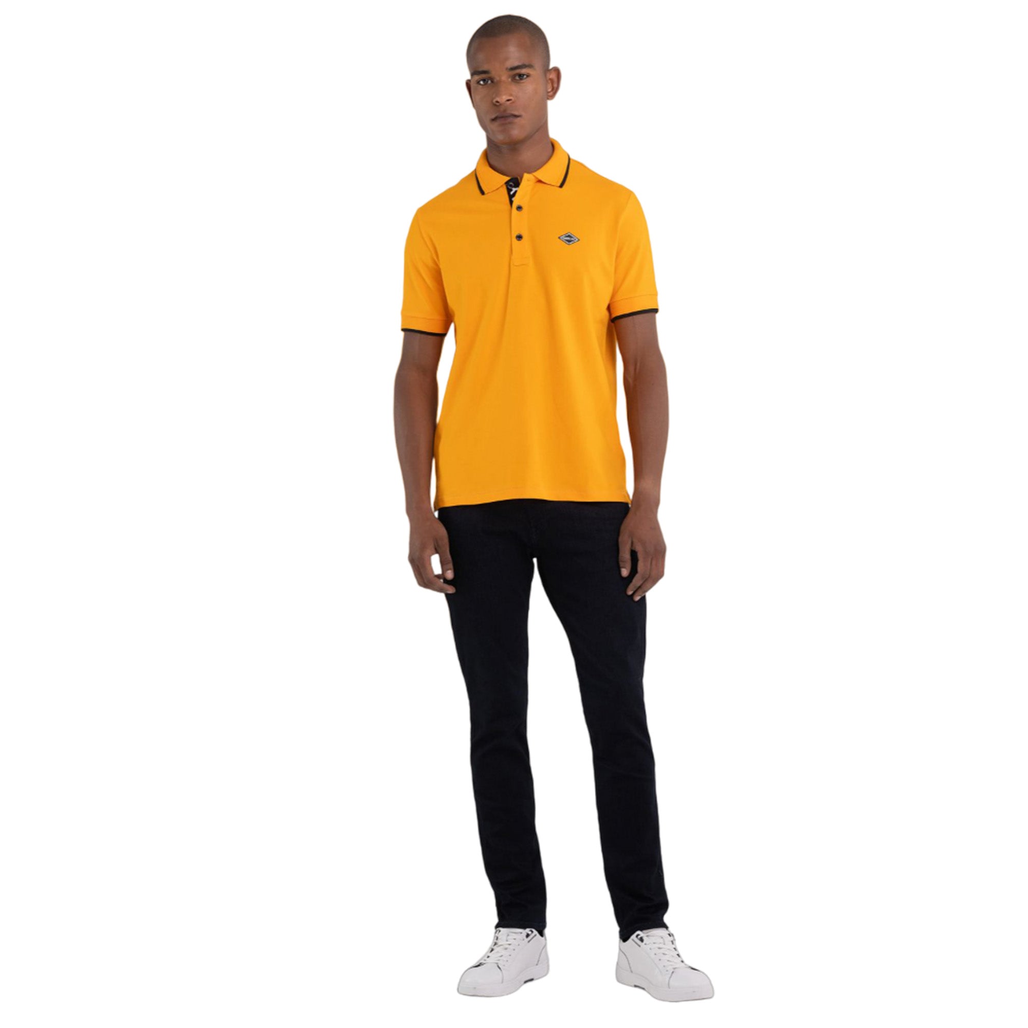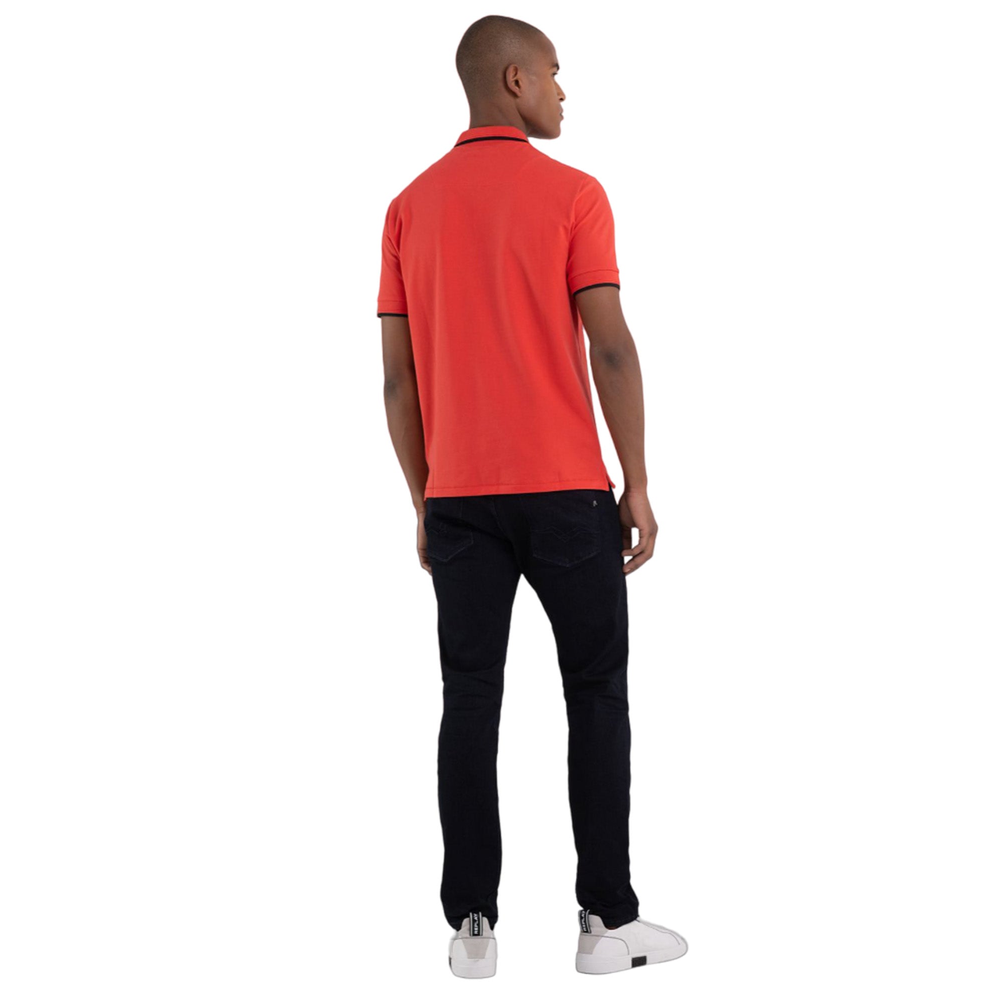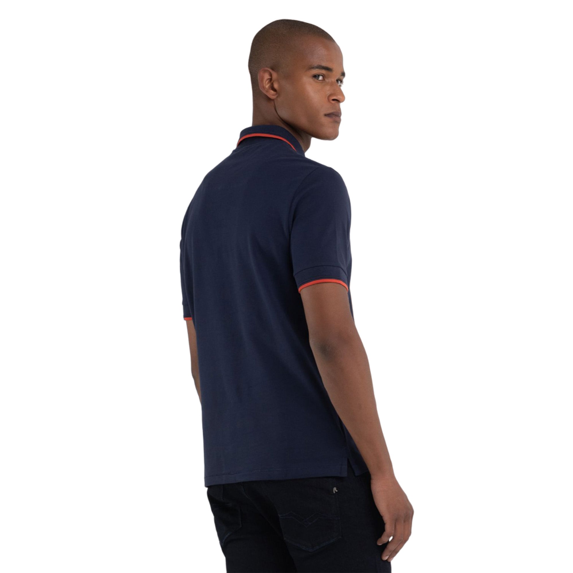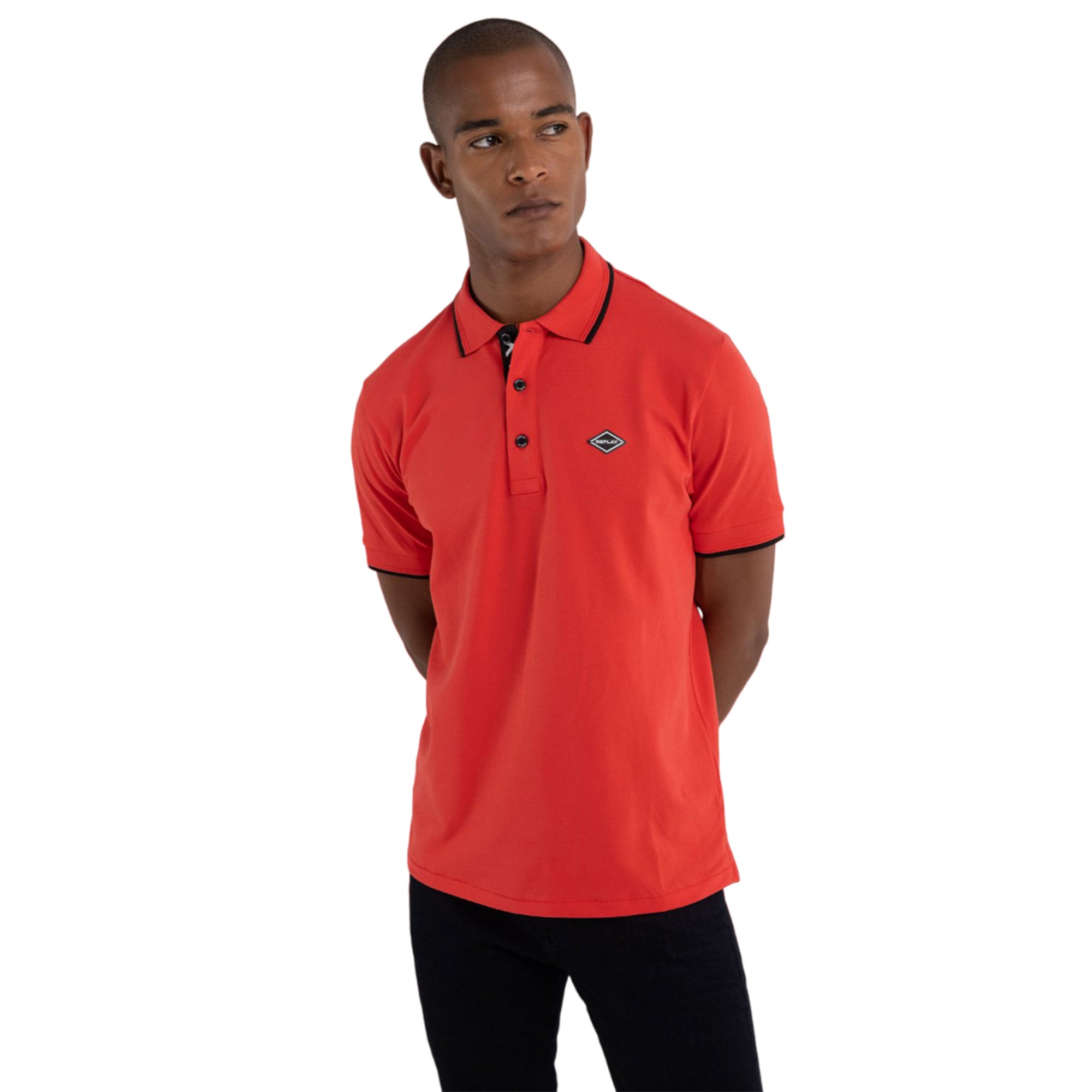 Polo shirt made of solid-colored stretch cotton piqué. With short sleeves and regular fit, the garment is characterized by the contrasting-colored striped outline at the collar edge and at the cuffs and by the diamond-shaped REPLAY logo on the chest. The item is enhanced by three customized buttons and by the REPLAY writing printed on the inside of the fastening.