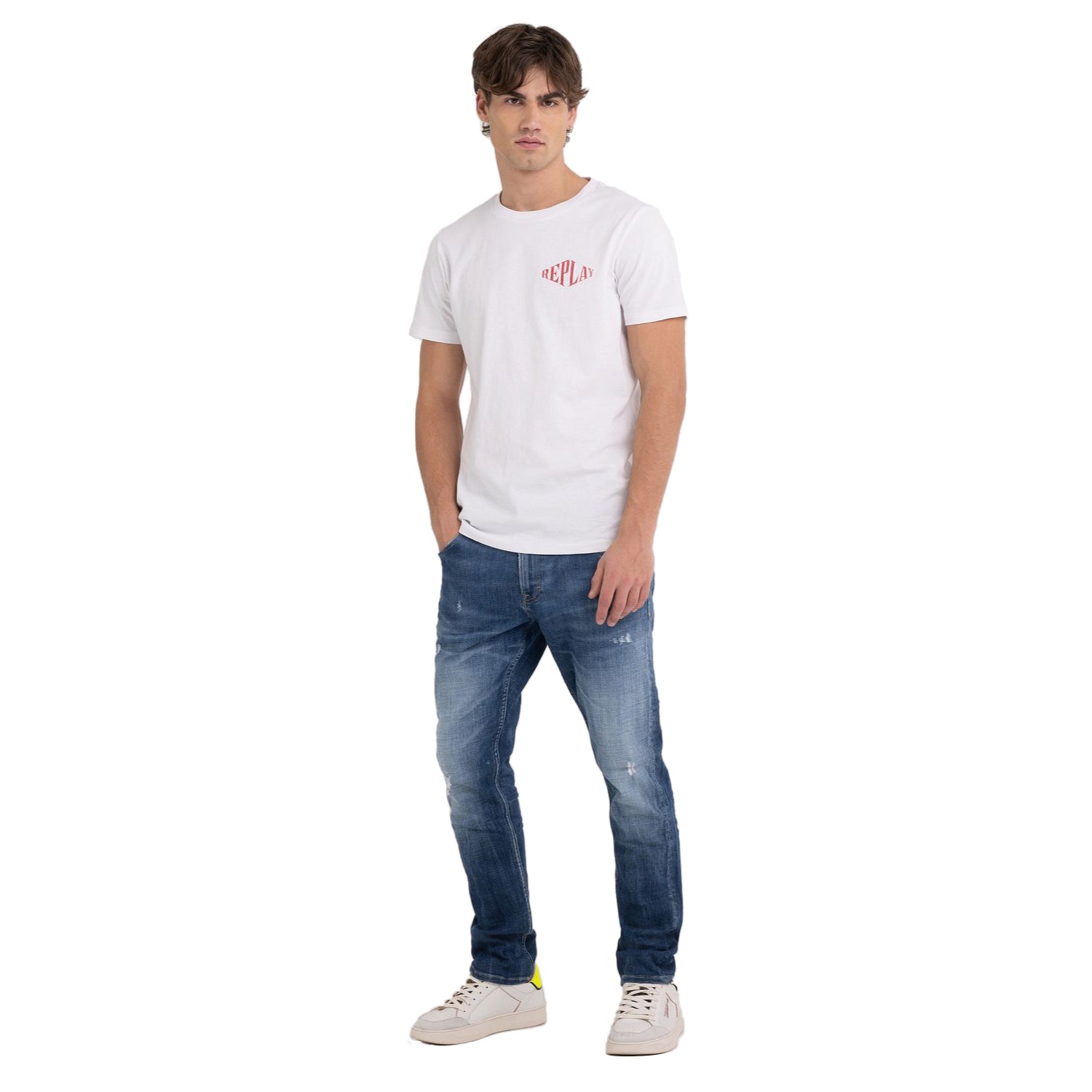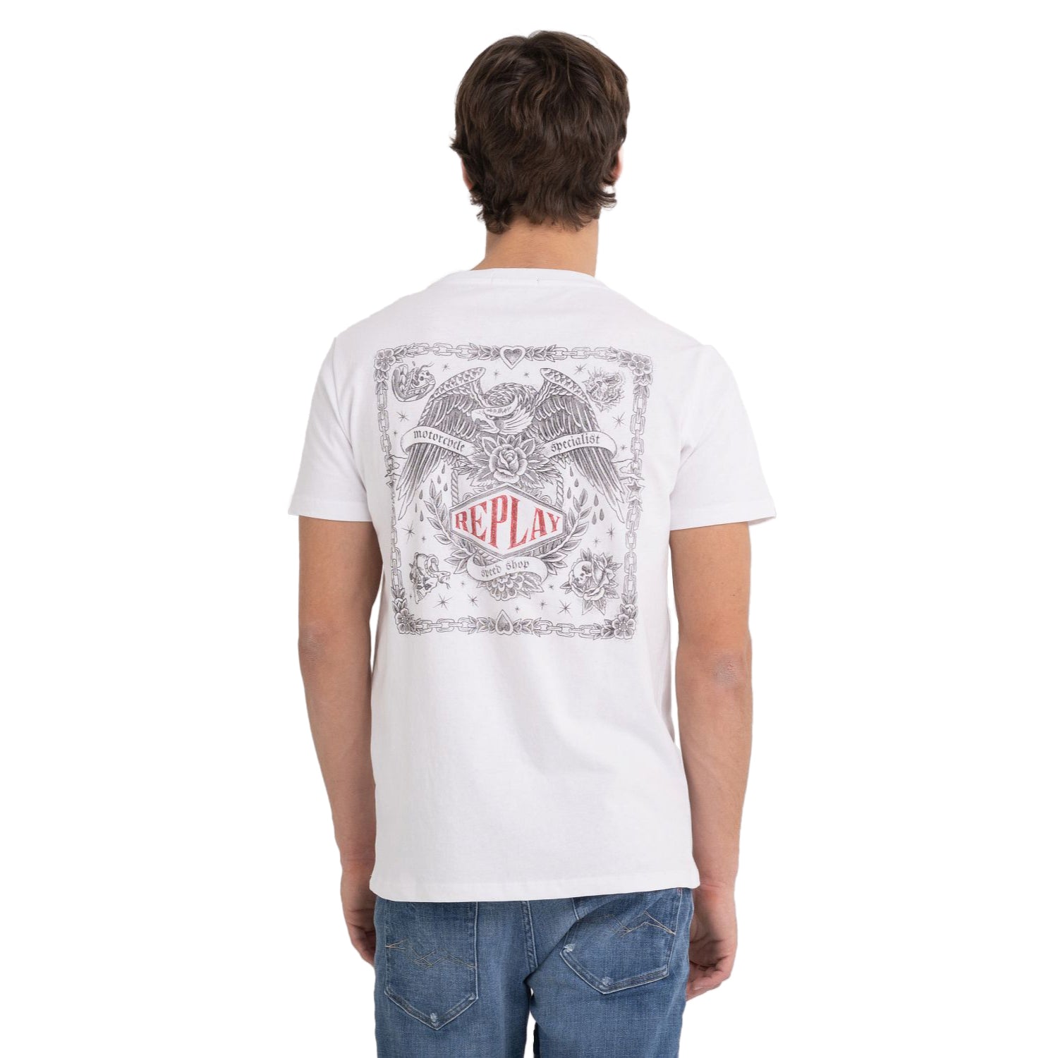 Crewneck t-shirt made of garment-dyed open end cotton jersey. With short sleeves and regular fit, the garment is characterized by the customized writing on the chest and by the print with angel, roses and skulls at the back.