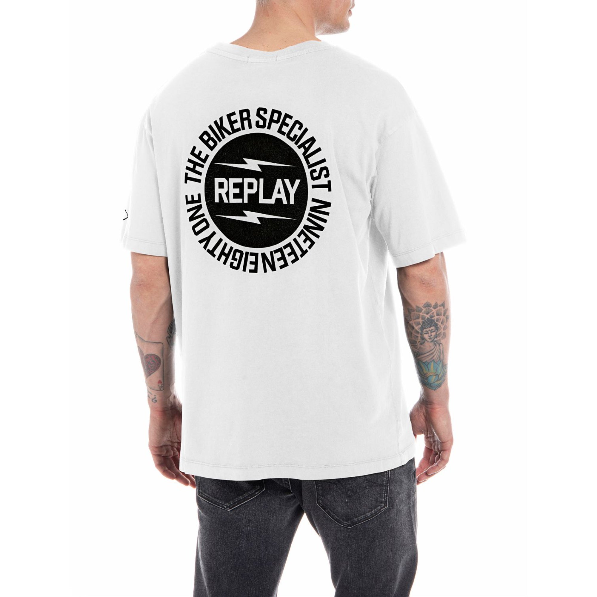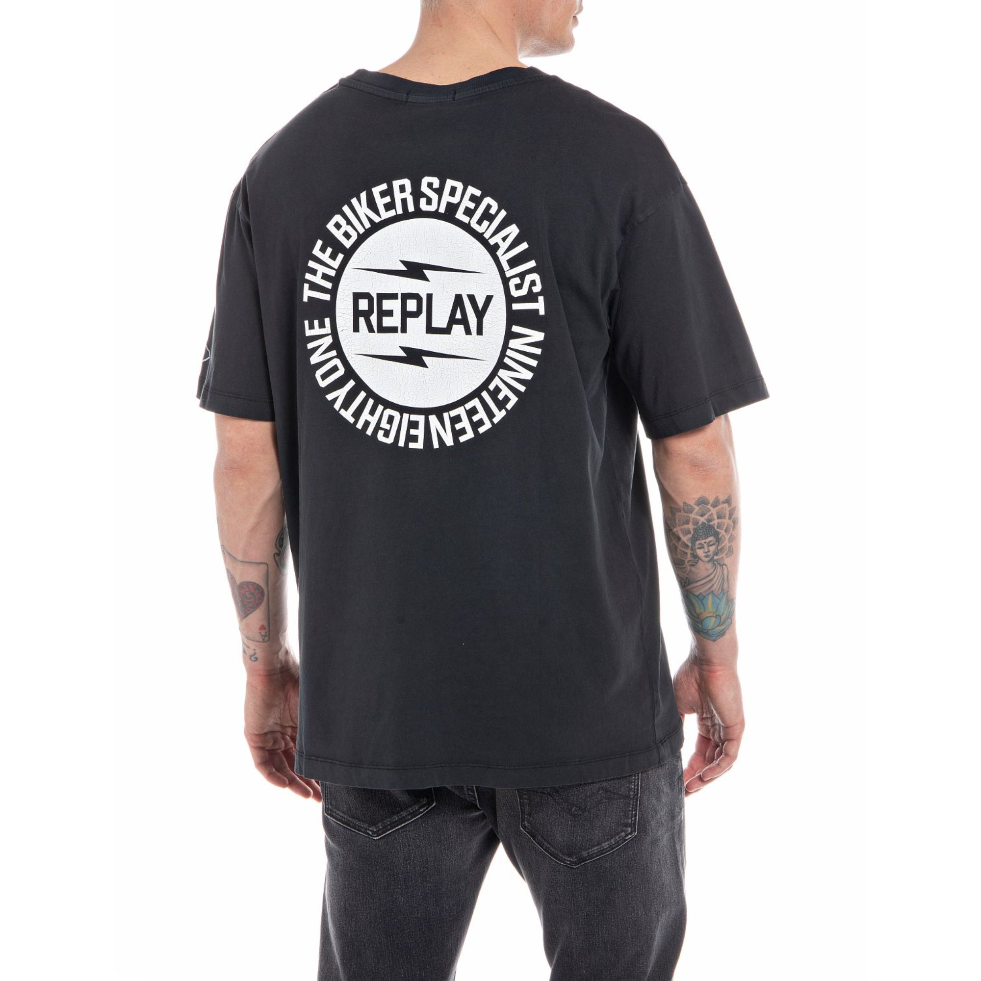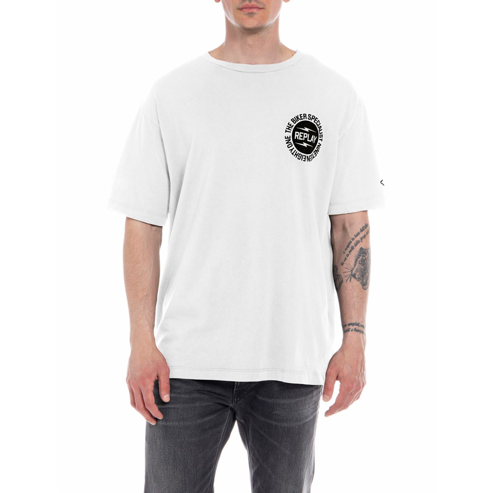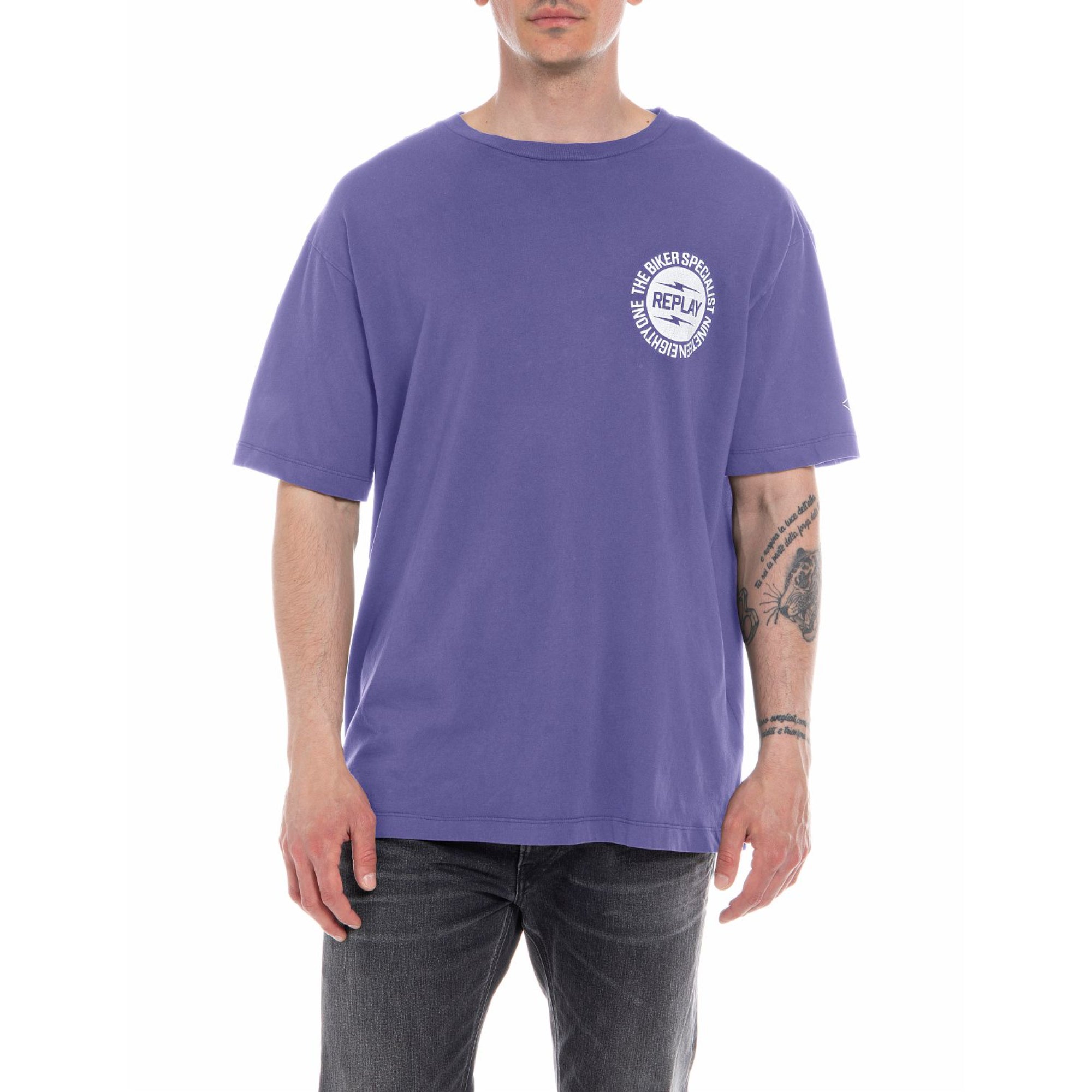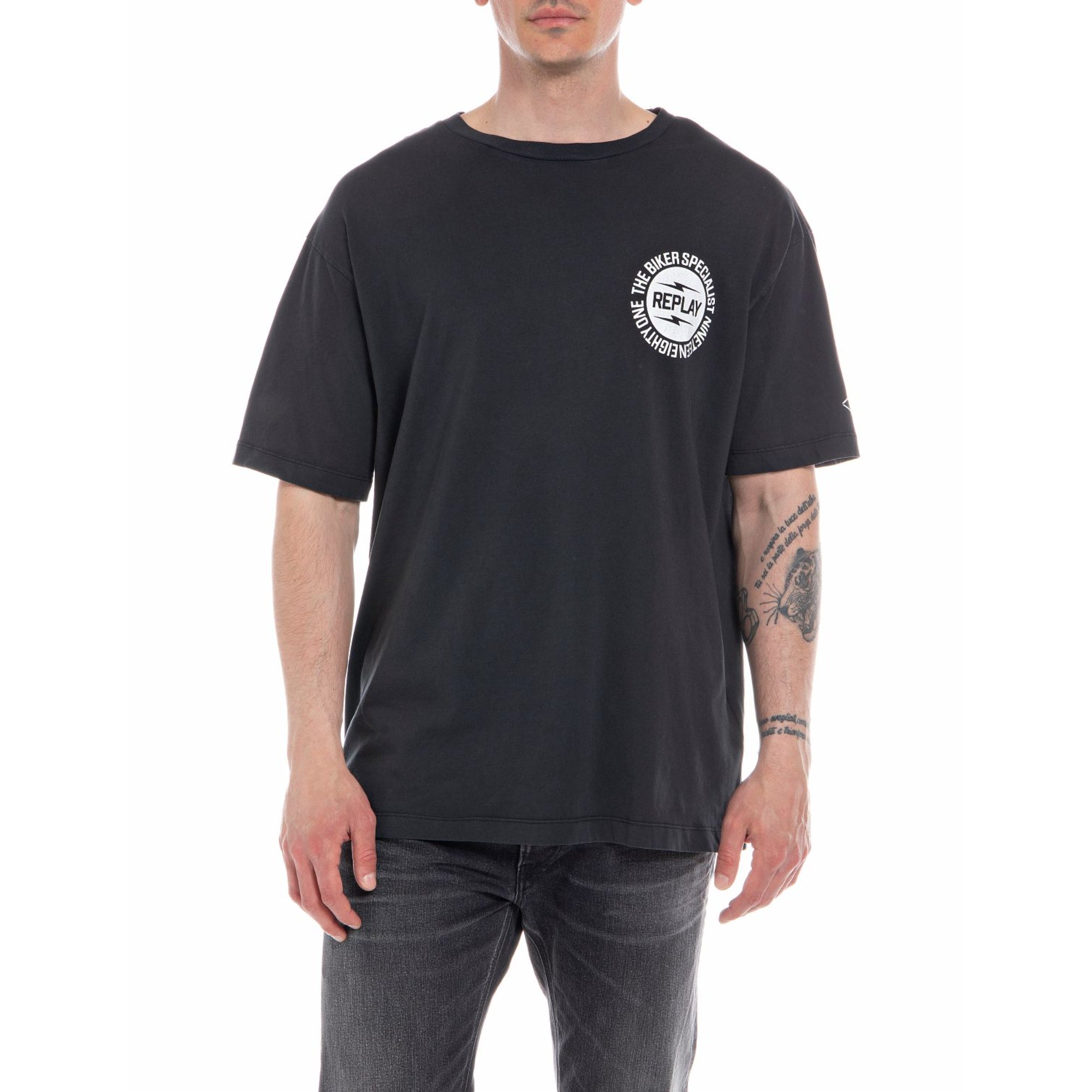 Crewneck t-shirt made of garment-dyed cotton jersey. With short sleeves and regular fit, the garment is characterized by the customized biker print on the chest and at the back.