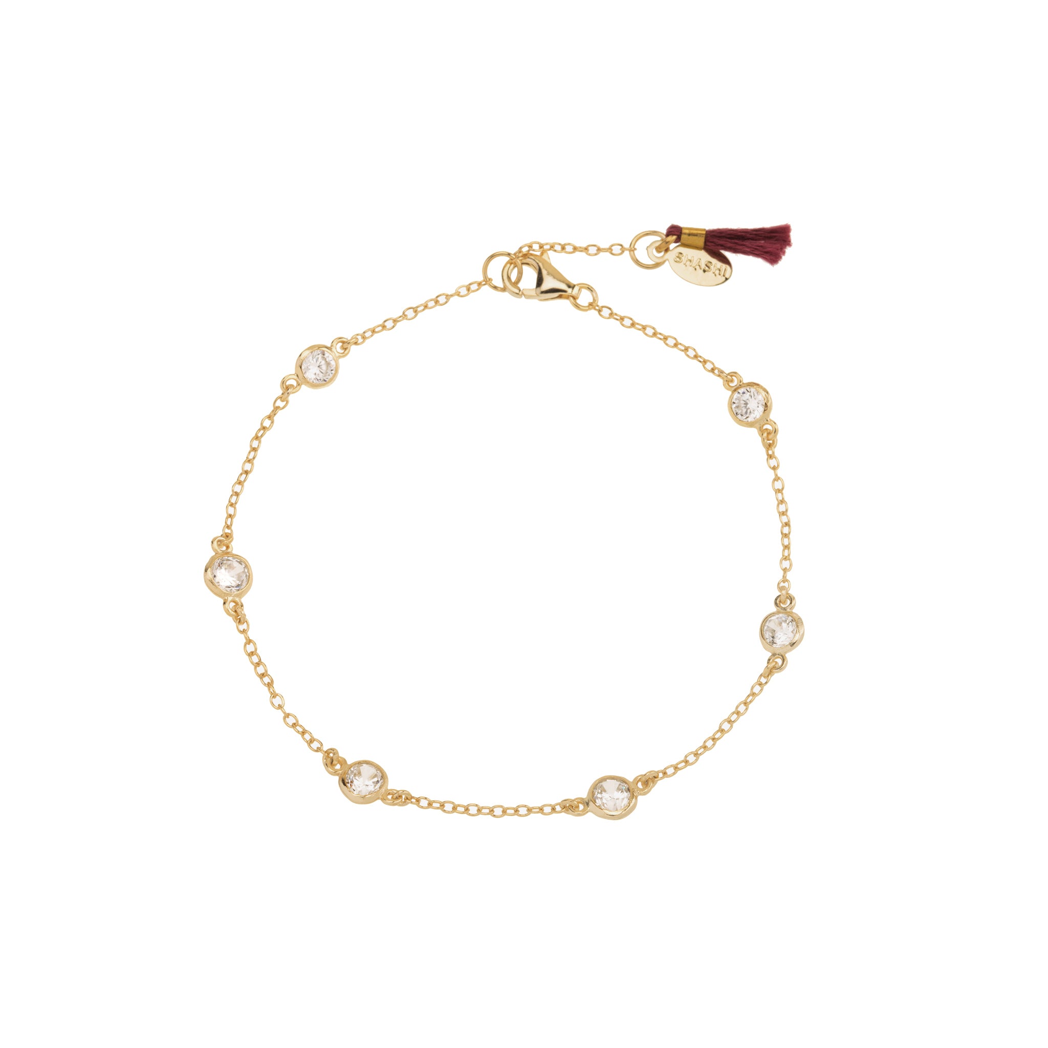 Shashi Bracelet Emily Vermeil on Sterling Silver is a stunning piece of jewelry that combines elegant and modern design with high-quality materials. The bracelet features a delicate chain made of sterling silver, with a vermeil finish giving it a luxurious gold tone. The charm of the bracelet is adorned with sparkling cubic zirconia stones, adding a touch of glamour to this already beautiful piece. One of the notable features of this bracelet is the S H A S H I signature silk/cotton tassel detail. The tassel, available in various colors, adds a playful and bohemian touch to the bracelet, making it versatile for both casual and formal occasions. This bracelet is perfect for adding a touch of sophistication and style to any outfit. It can be worn on its own for a minimalist look or stacked with other bracelets for a more layered and trendy look. With its high-quality materials and timeless design, the Shashi Bracelet Emily Vermeil on Sterling Silver is a must-have accessory in any jewelry collection. SPECIFICATIONS