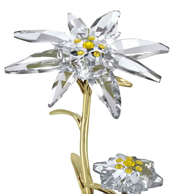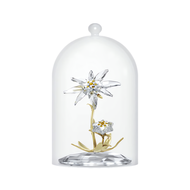 The Swarovski Florere 130th Anniversary Bell Jar Ornament is a captivating creation, meticulously crafted to mark Swarovski’s 130th year of brilliance. This special ornament pays tribute to the brand’s origins with a design inspired by the edelweiss, the iconic emblem that has represented Swarovski’s heritage since 1895. Encased beneath a delicate glass bell, the dazzling flowers within are brought to life through 259 precision-cut crystals, capturing and reflecting light with signature radiance. Each bloom features vibrant yellow pistils and elegantly glossy stems and leaves in sophisticated champagne gold-tone metal, further elevating its visual allure. A true testament to Swarovski’s artistry and craftsmanship, this ornament serves not only as a decorative piece but also as a symbol of enduring legacy. Please note, this is a decoration object and is not a toy; it is not suitable for children under 15 years old.