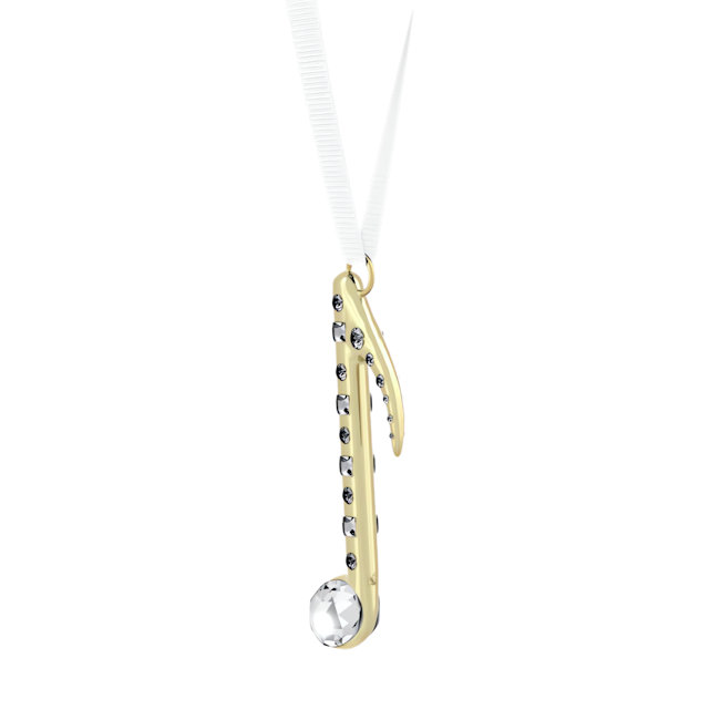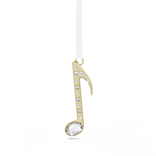 The Swarovski Holiday Magic Music Note Ornament is a breathtaking addition to any festive décor, perfect for those who find joy in both music and sophisticated design. Elegantly suspended from a white grosgrain ribbon, this luxurious ornament captivates with its refined silhouette, expertly crafted from glossy champagne gold-tone metal. Each side of the music note is beautifully embellished with clear Swarovski crystals, designed to catch and reflect light, casting a dazzling sparkle throughout your home during the holiday season. The music note motif not only adds a harmonious touch to your decorations, but also serves as a thoughtful and unique gift for anyone who cherishes music and the magical ambiance of the holidays. Please note, this ornament is a decorative object, not a toy, and is not suitable for children under 15 years old.