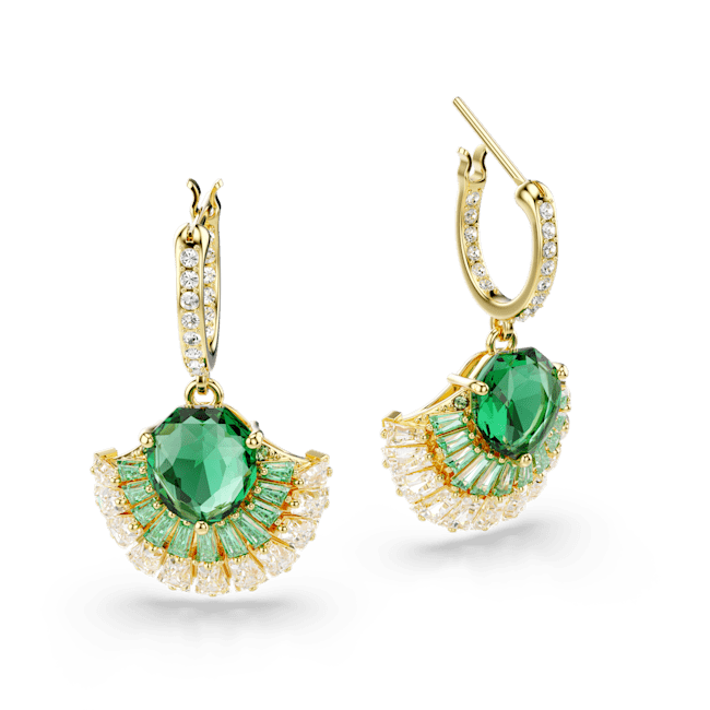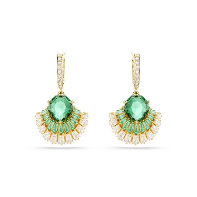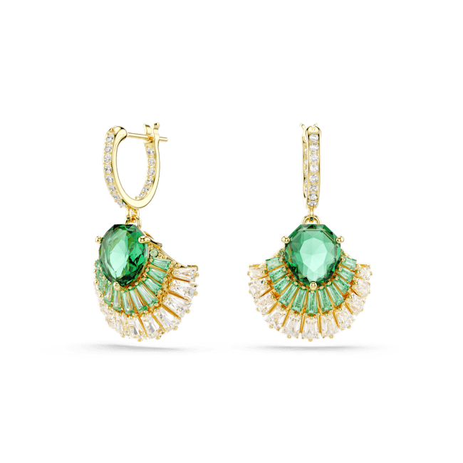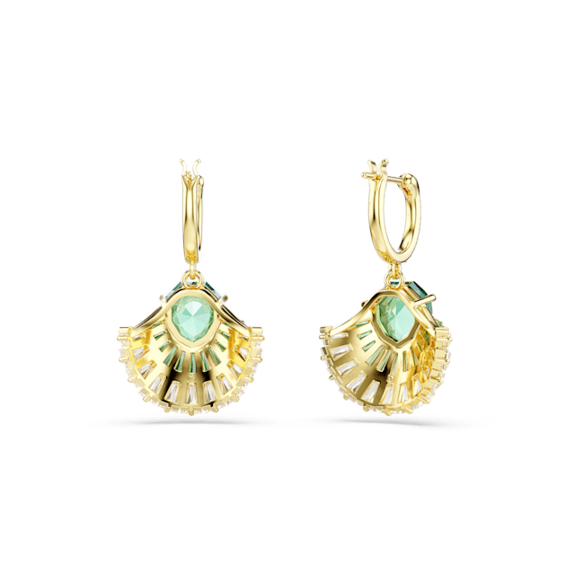 Swarovski Idyllia Drop Earrings, Mixed cuts Shell green gold-tone plated. With these elegant Idyllia earrings, you may immerse yourself in the relaxing mood of the water. Each shell design is gold-tone plated and studded with an assortment of green and clear Swarovski Zirconia, as well as a huge green crystal in the center. They are connected to little hoops adorned with clear crystals. To commemorate Ramadan, give this nature-inspired jewelry to someone special.
